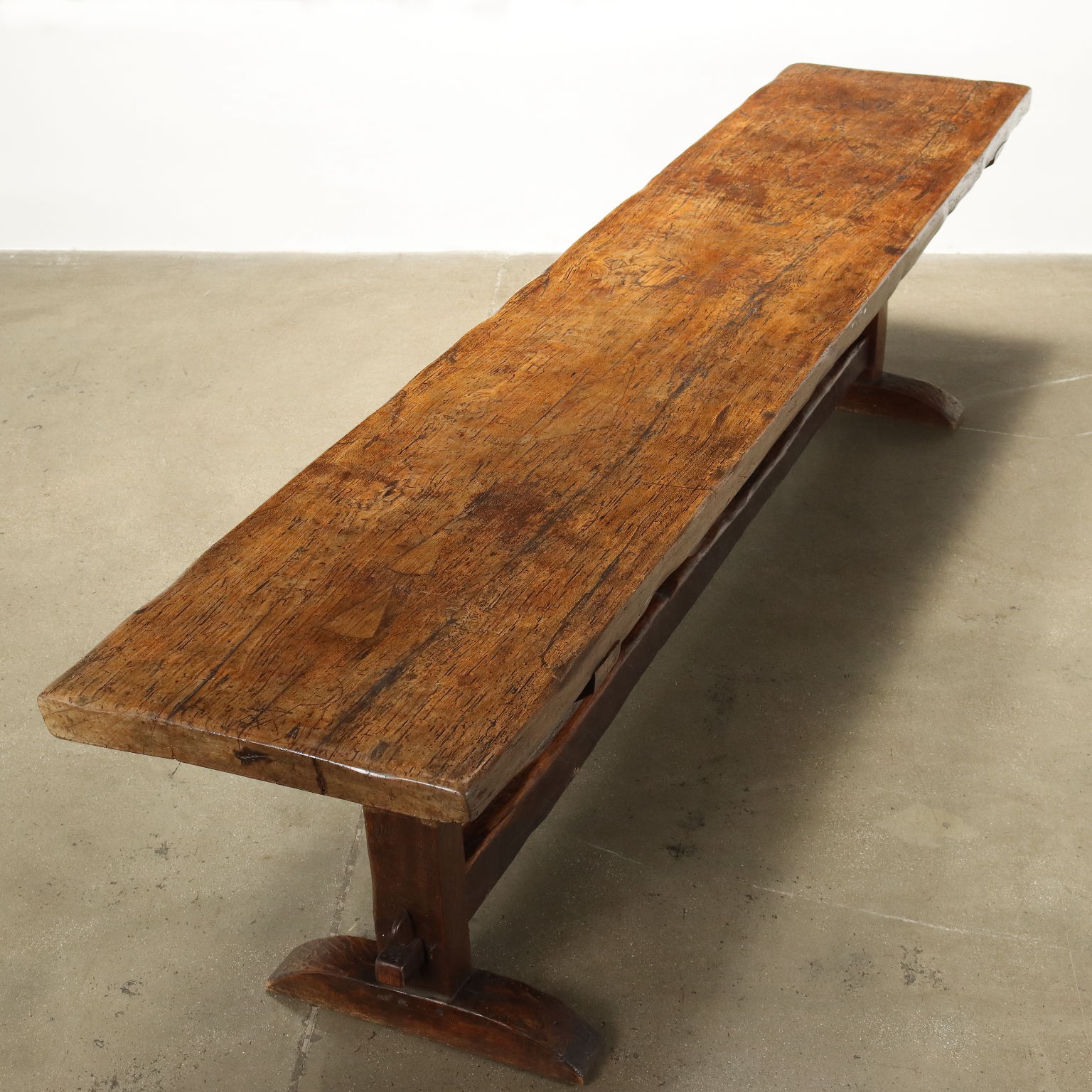 Tavolo a ciabatta in olmo, realizzato impiegando legni antichi; il piano è ad asse unica.