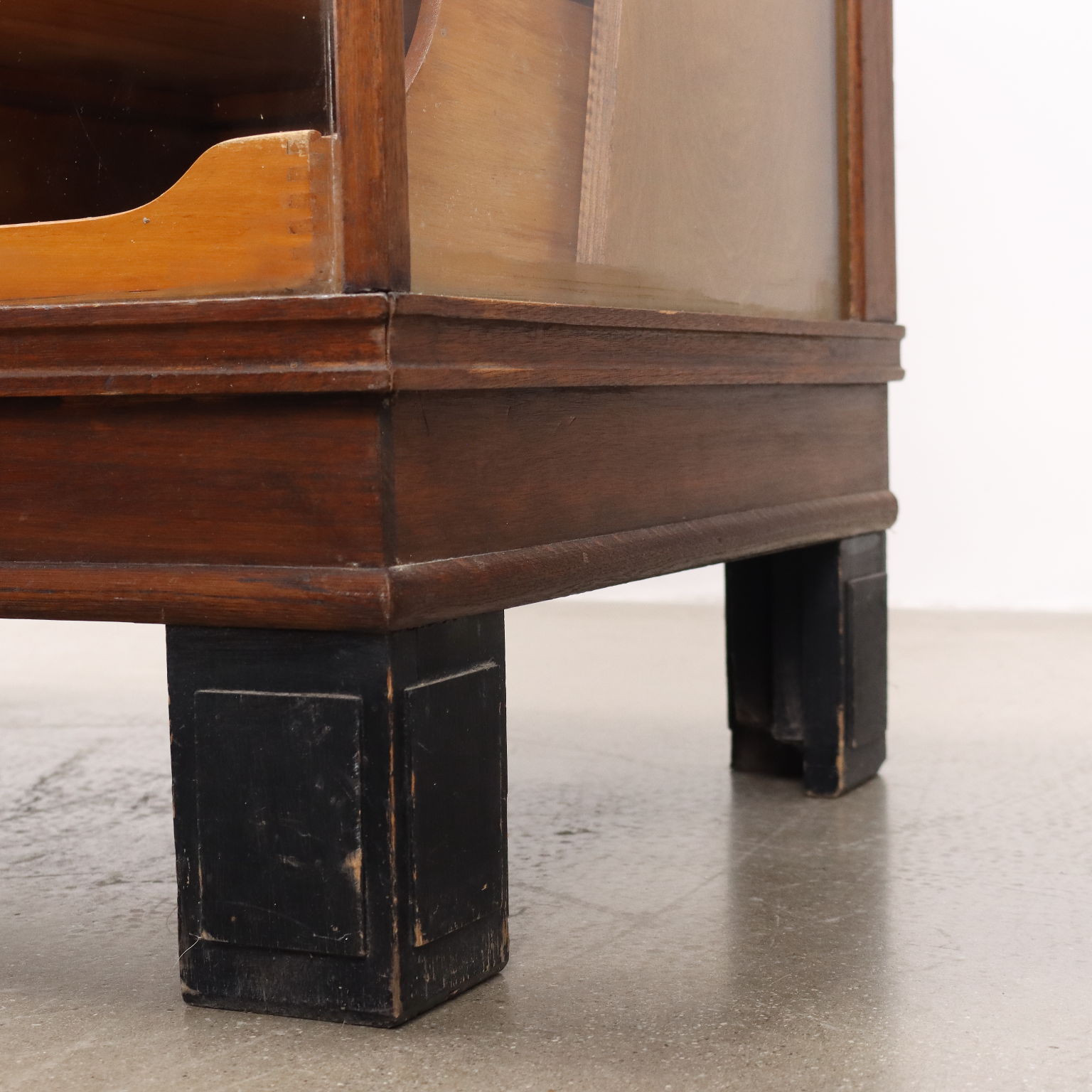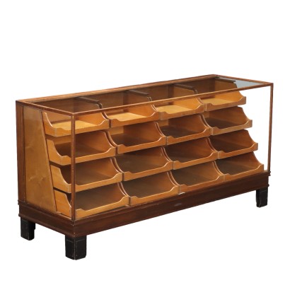 Espositore/banco negozio, in legno impiallacciato rovere, interno cassetti in faggio, vetro.