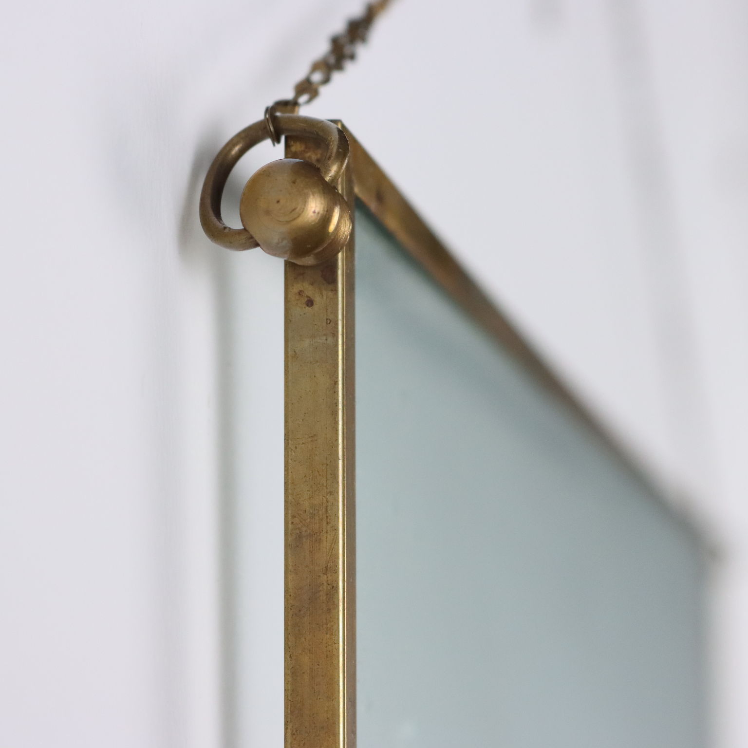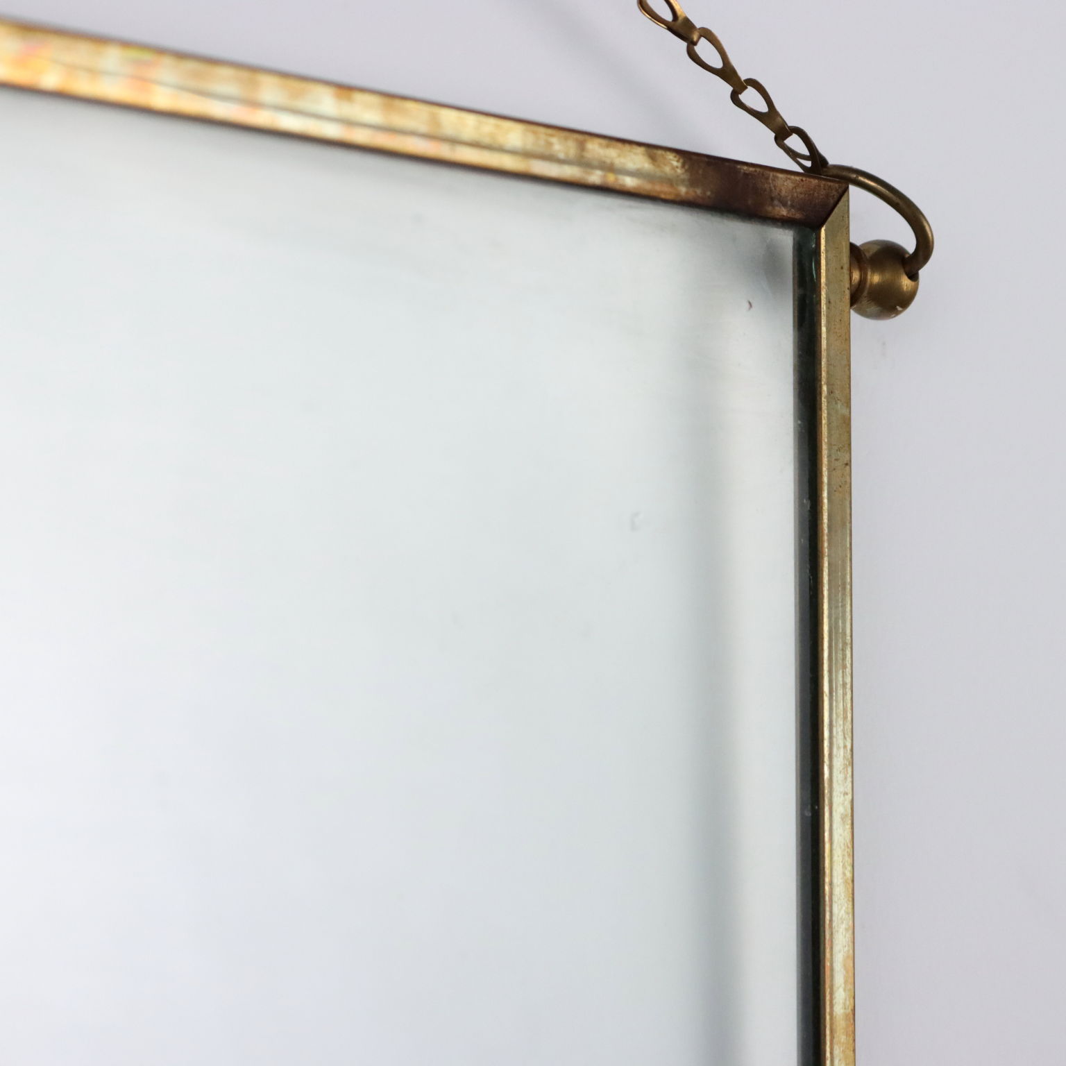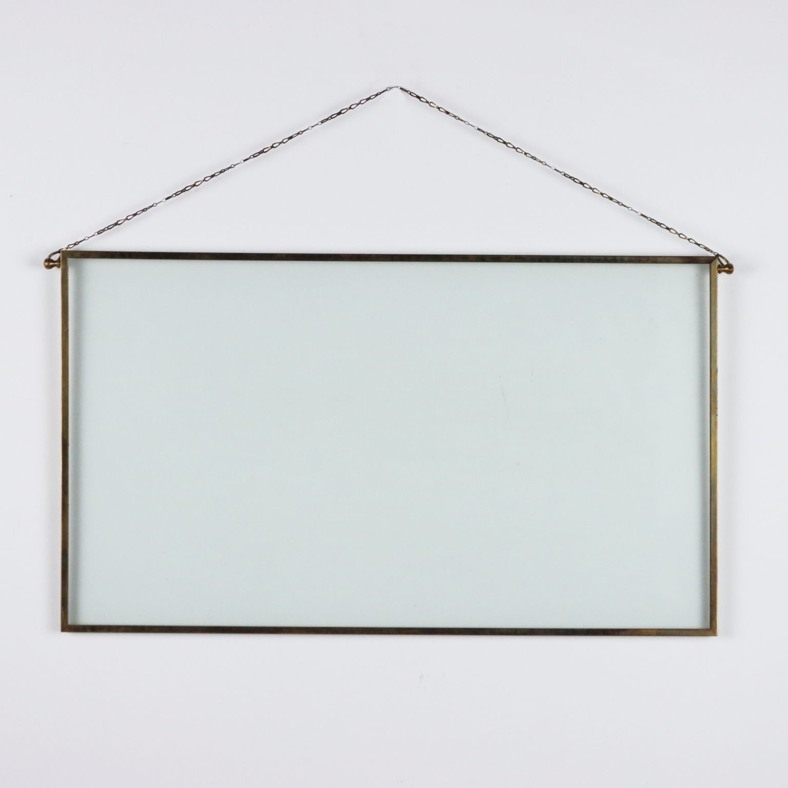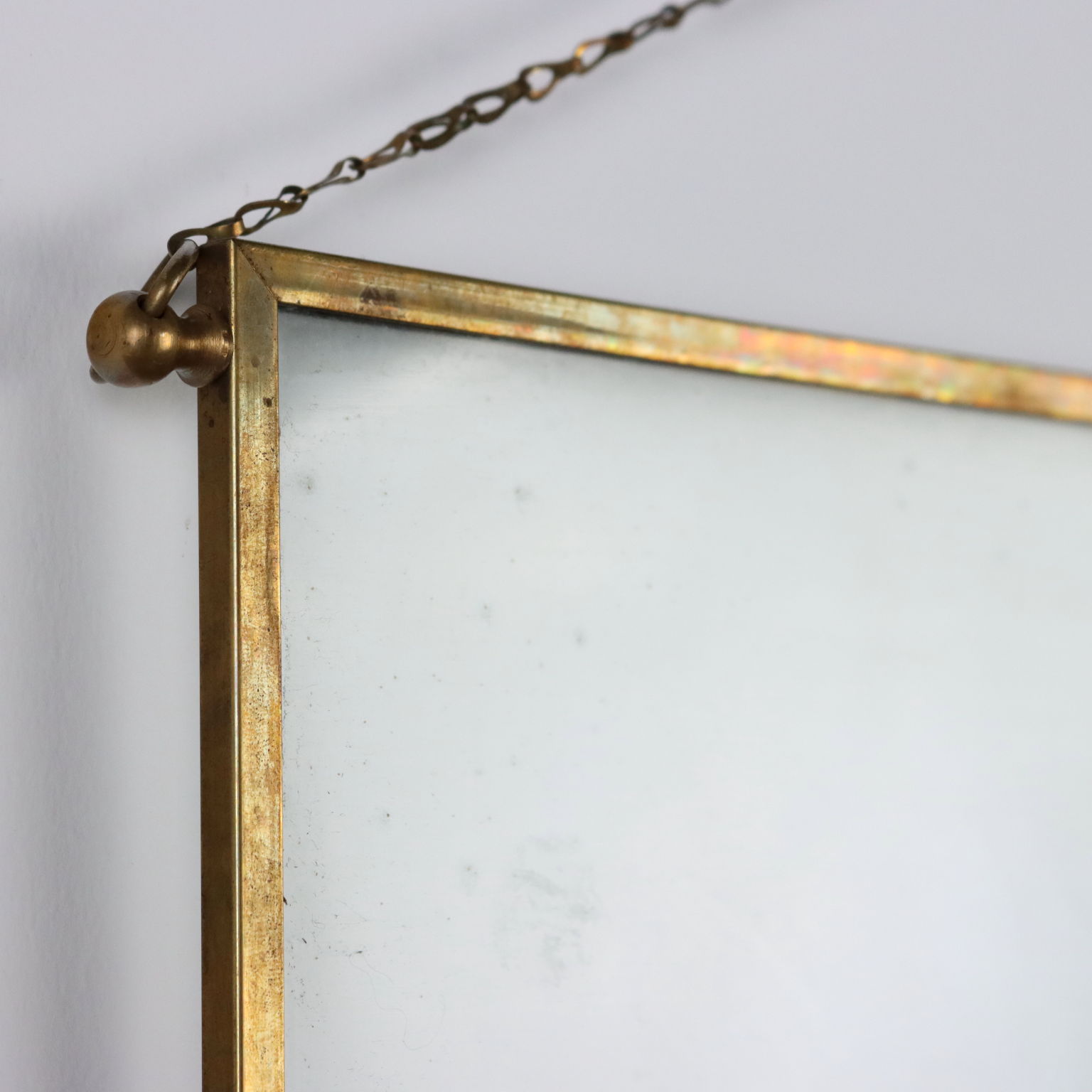 Gruppo di sei espositori da muro in vetro con cornice e catenelle in ottone.