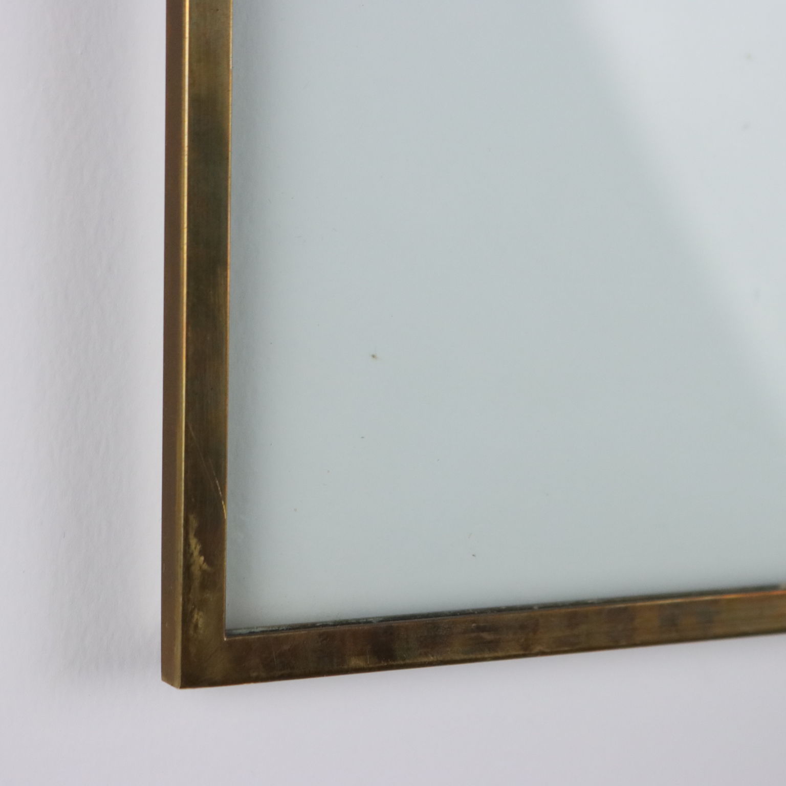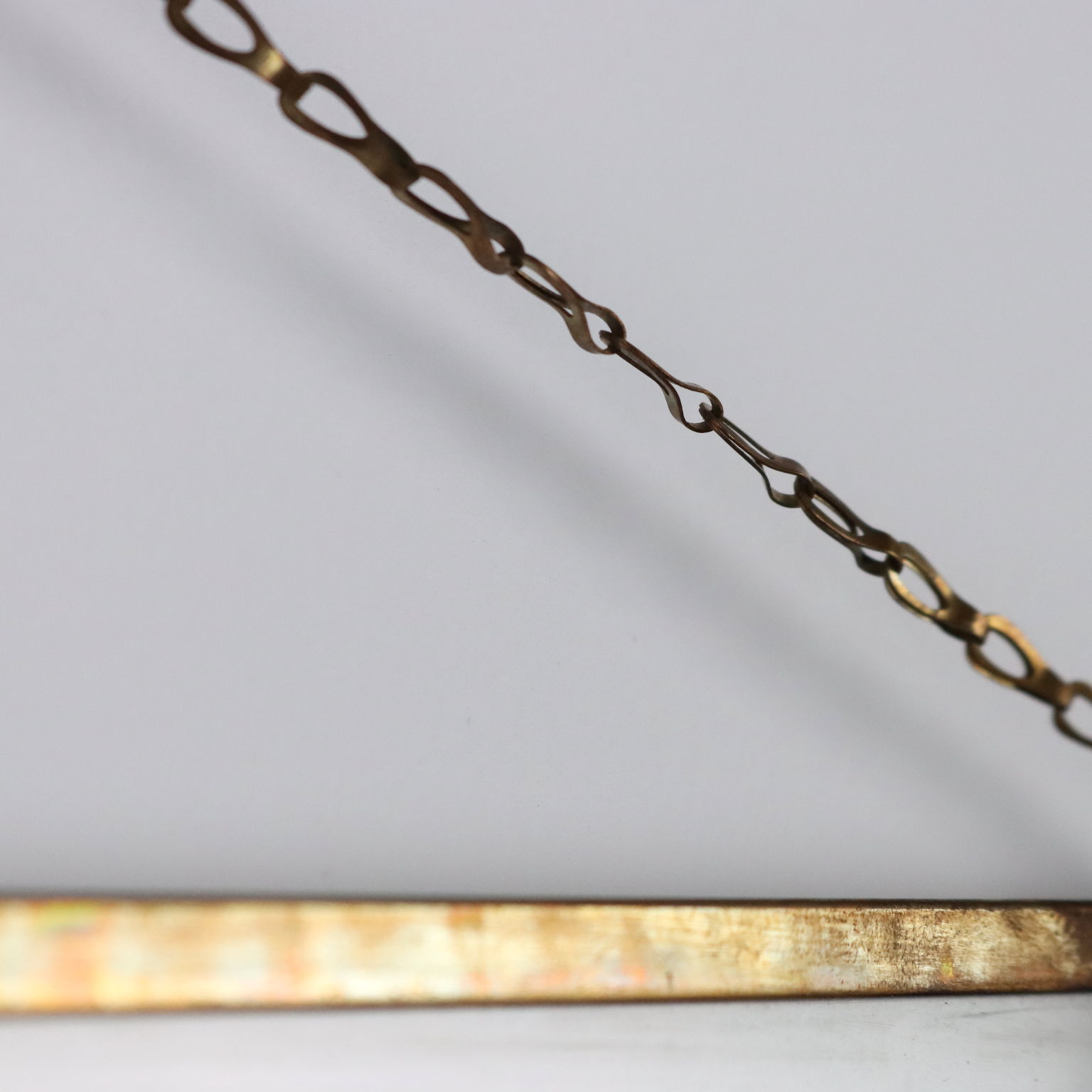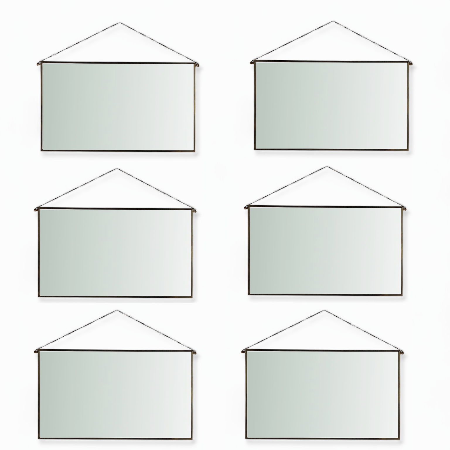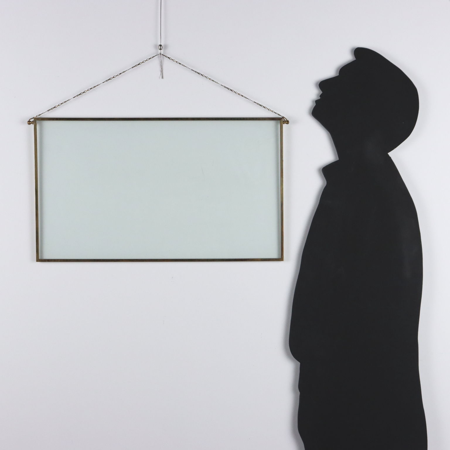 Gruppo di sei espositori da muro in vetro con cornice e catenelle in ottone.