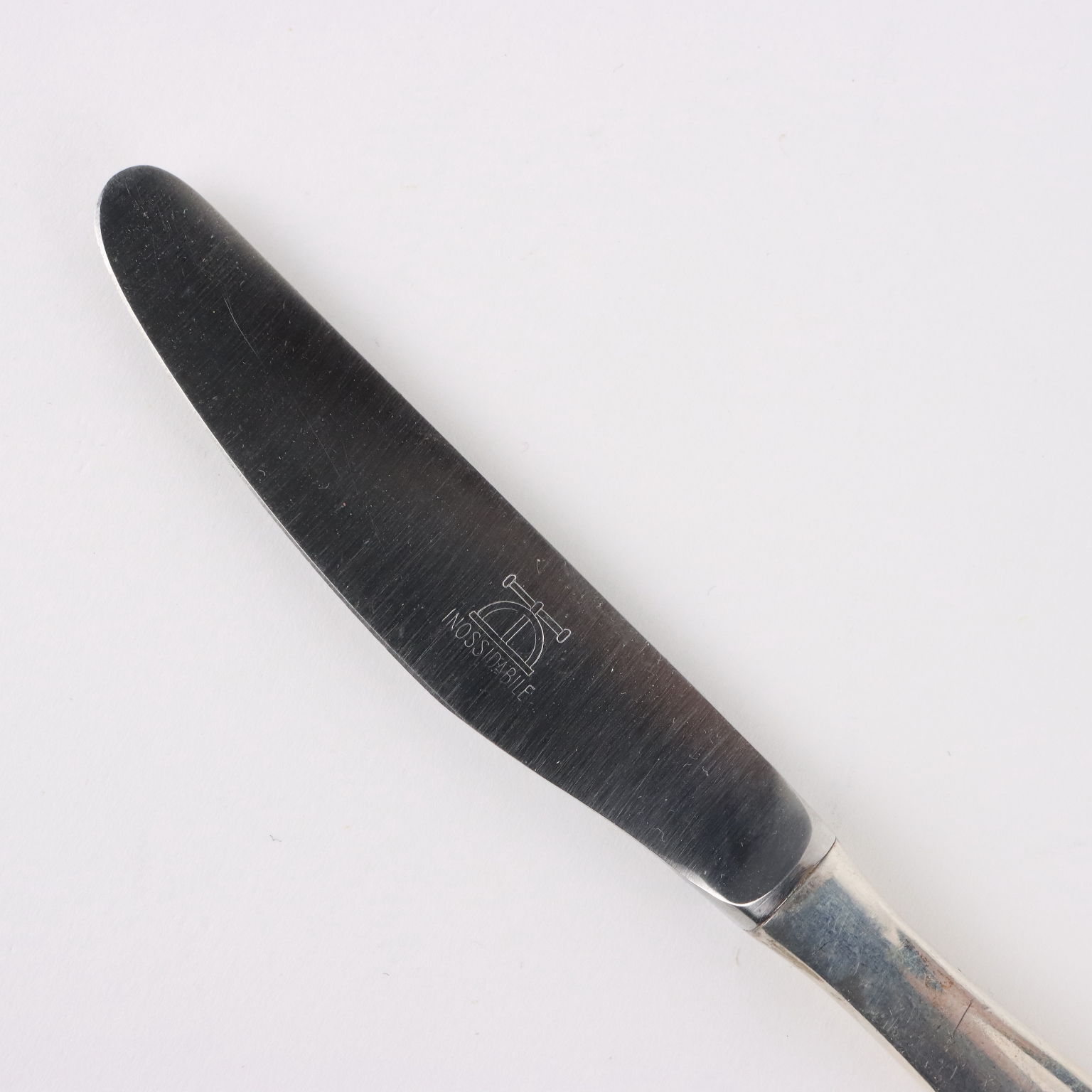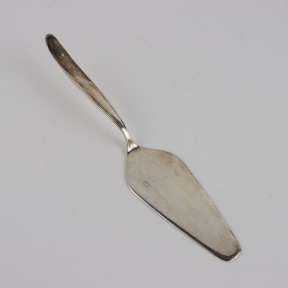 Servizio di posate da dolce in argento composto da paletta, 6 forchette, 6 coltelli e 6 cucchiaini. Marchi dell'argento incussi sui manici. Grammi 490 al netto dei coltelli.