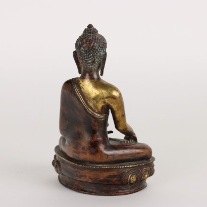 Buddha Shakyamuni in bronzo parzialmente dorato. La figura è elegantemente seduta in dhyanasana su una base di loto stilizzato e la mano in bhumisparsamudra. Indosso una veste incisa con volute classiche sugli orli.
