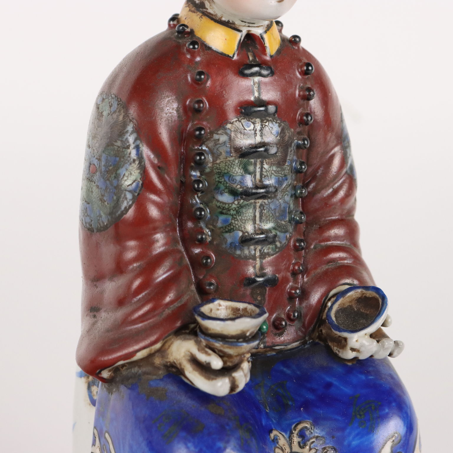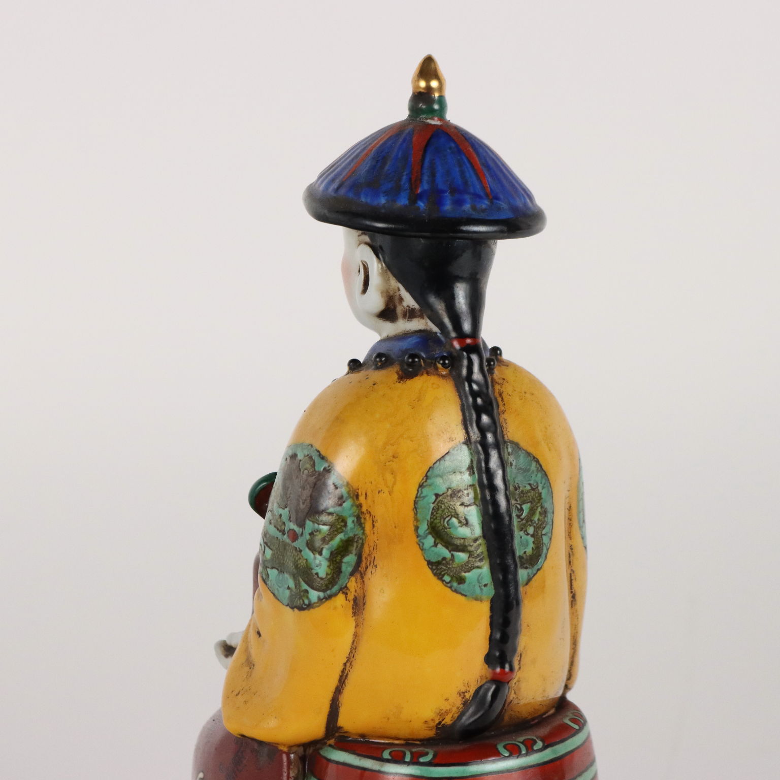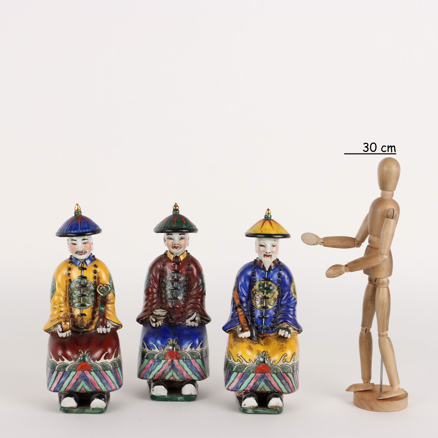 Tre statuette in porcellana policroma raffiguranti imperatori cinesi. Rappresentati nelle loro vesti imperiali seduti su sgabelli da giardino. Sigilli apocrifi Qianlong impressi sotto la base.