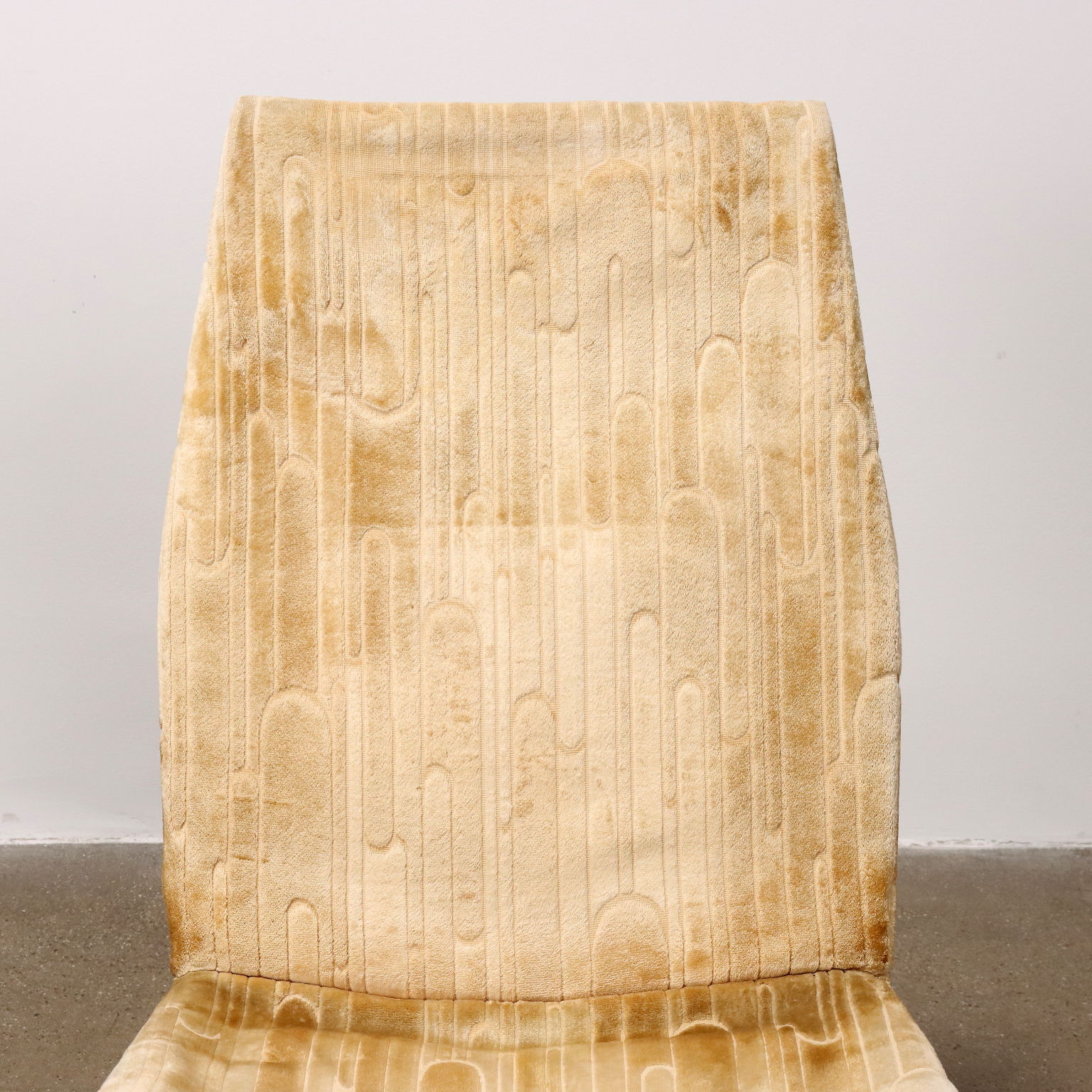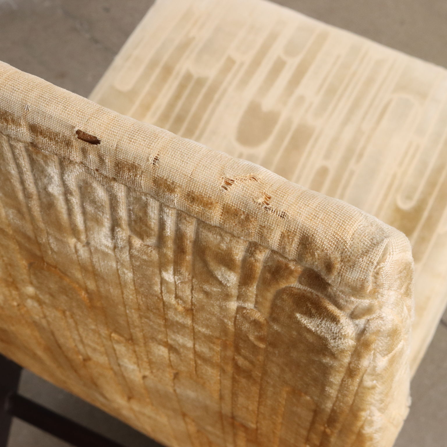 Coppia di poltroncine, base in legno di faggio tinto, imbottitura in espanso, rivestimento in velluto.