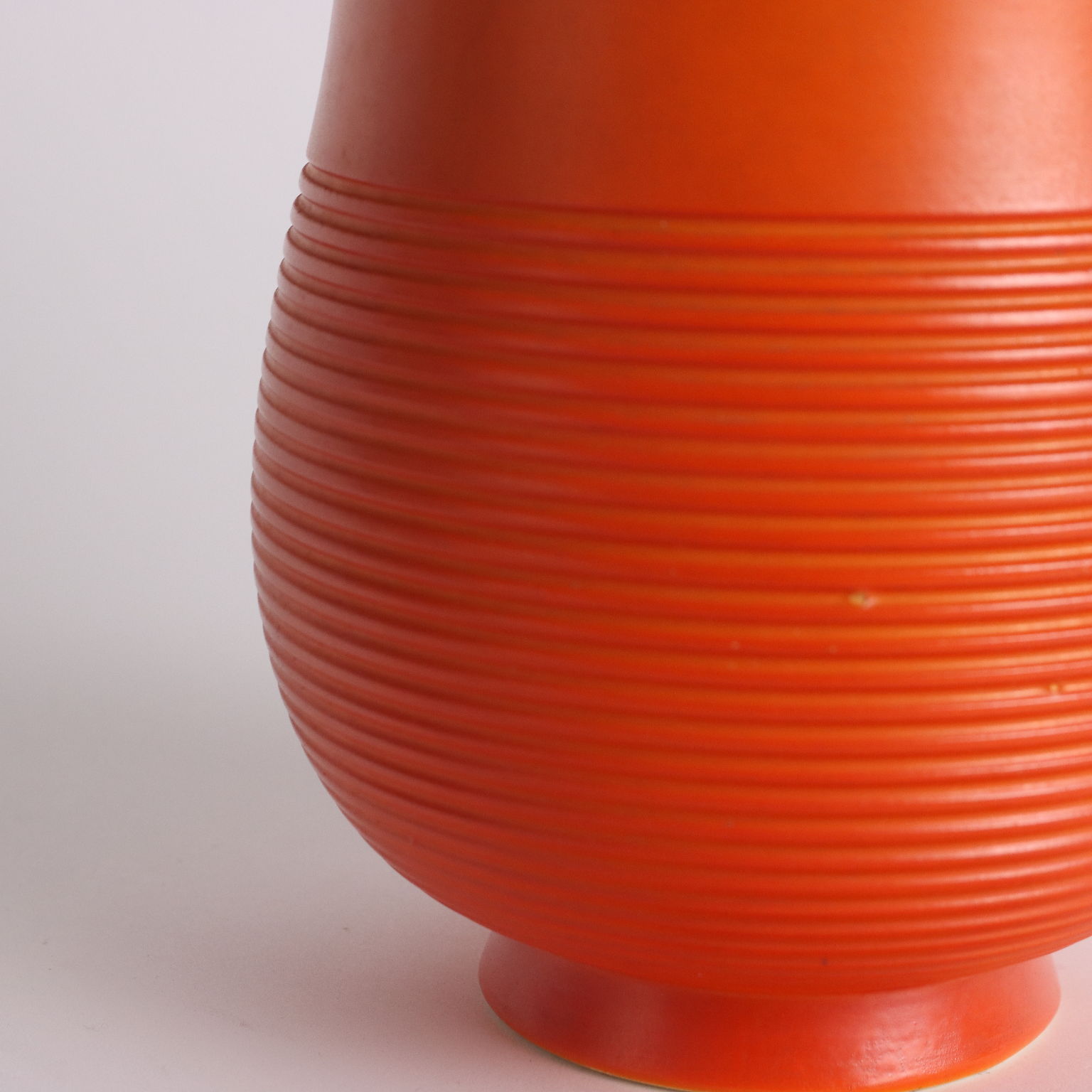 Vaso Richard Ginori San Cristoforo in ceramica smaltata color arancio con decoro a scanalature orizzontali. Marchio della manifattura sotto la base.