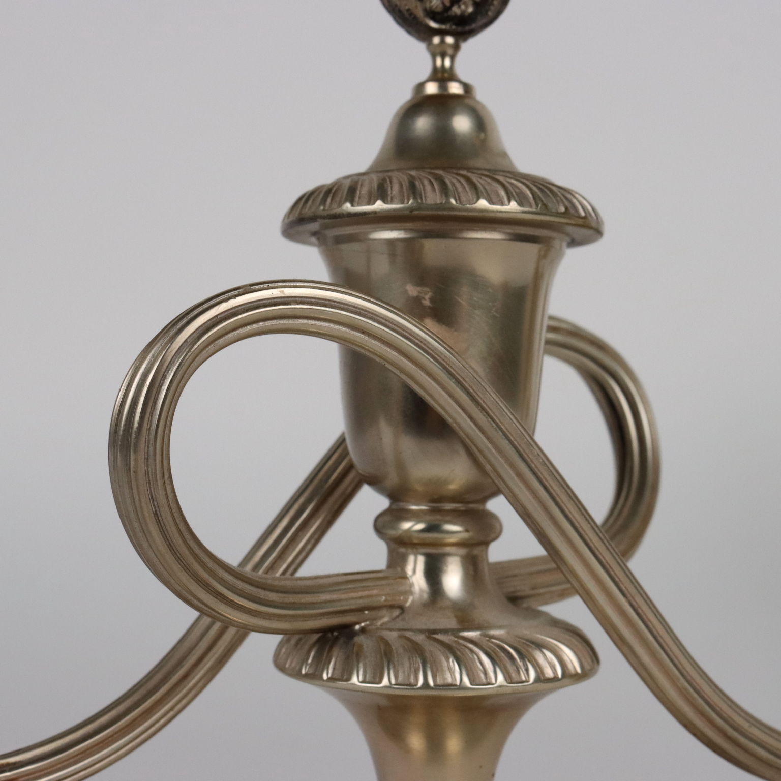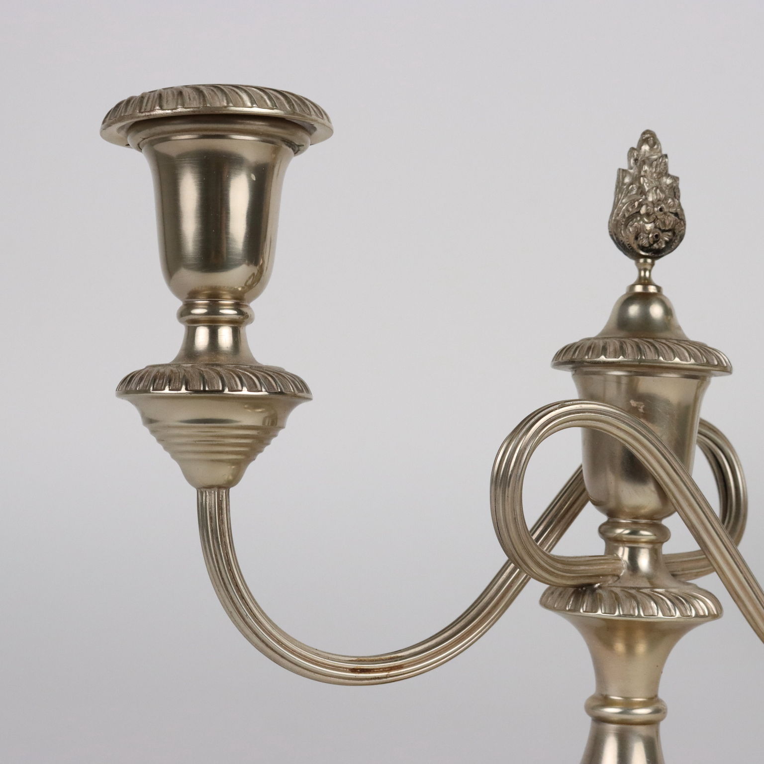 Coppia di candelabri a due fiamme in argento con bracci a forma mossa di gusto inglese. Decoro a scanalature e baccellature. Elemento centrale cesellato a volute fogliacee e fiori. Marchi dell'argento incussi sul bordo della base. Grammi 1220.