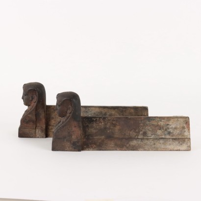 Coppia di alari in ferro. Volto di faraone nella parte frontale.