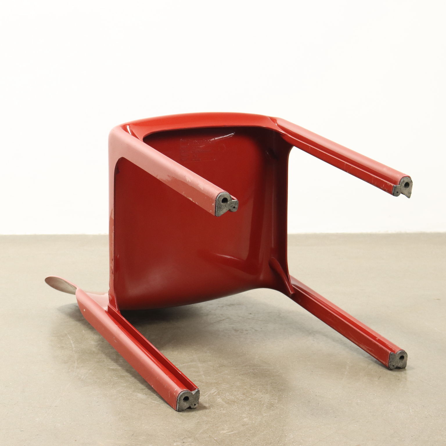 Set di sedie in materiale plastico rosso disegnate da Vico Magistretti e prodotte da Artemide negli anni '70.