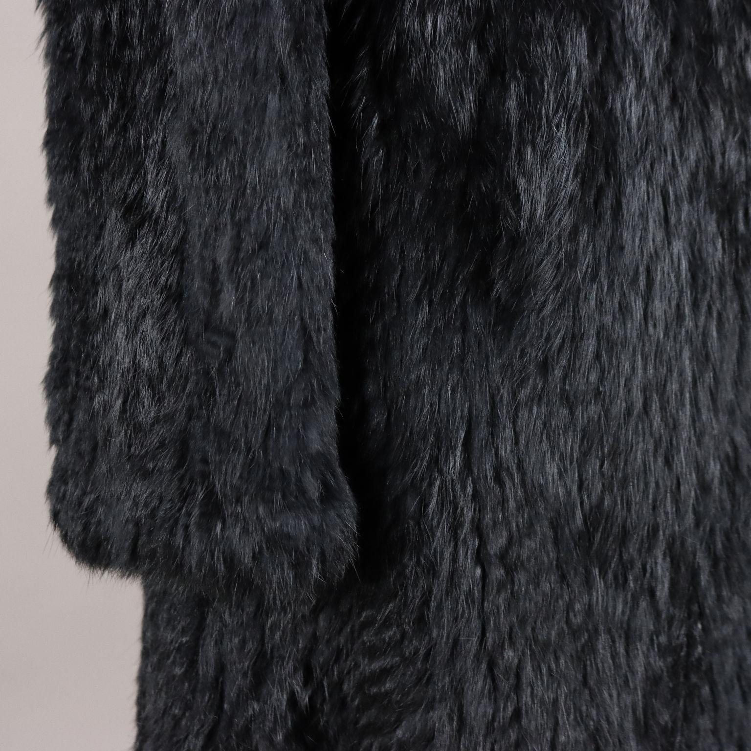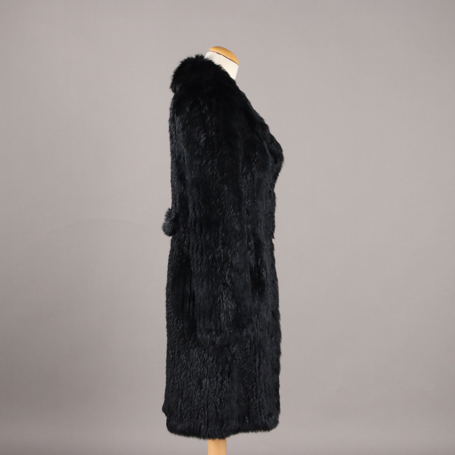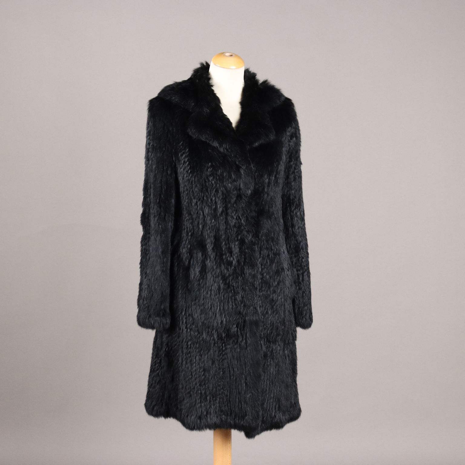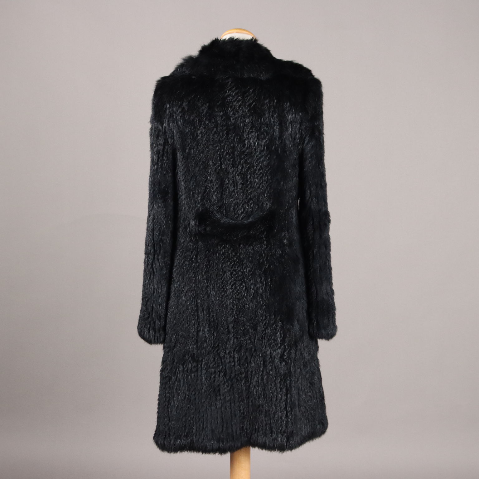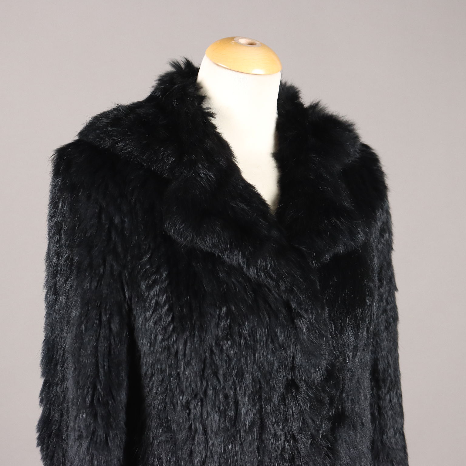 Cappottino nero in morbido lapin, con ampio revers e martingala. Due tasche. Allacciatura con gancini. Piccolissime imperfezioni nei gancini.