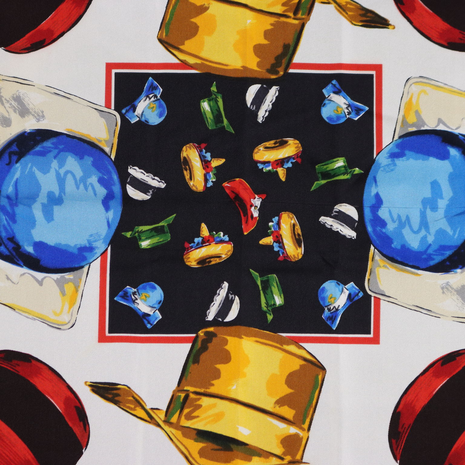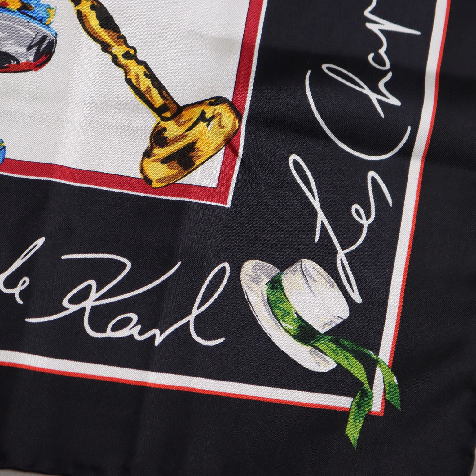 Foulard in pura seta con titolo "Les Chapeaux de Karl". Il soggetto, infatti, sono cappelli di vari modelli e colori. L'articolo è in condizioni molto buone, è probabilmente stato utilizzato poco, segnaliamo un filo tirato nel tessuto.