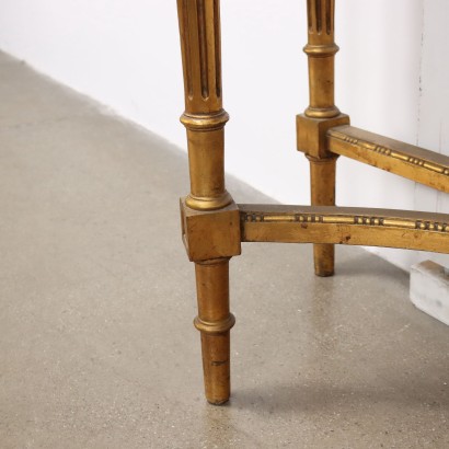 Consolle con specchiera in stile neoclassico, piano in marmo, gambe troncoconiche, festoni nella fascia sottopiano. Specchiera tripartita con cimasa impreziosita da pannello dipinto, festoni e intagli floreali. Italia, inizio XX Secolo.