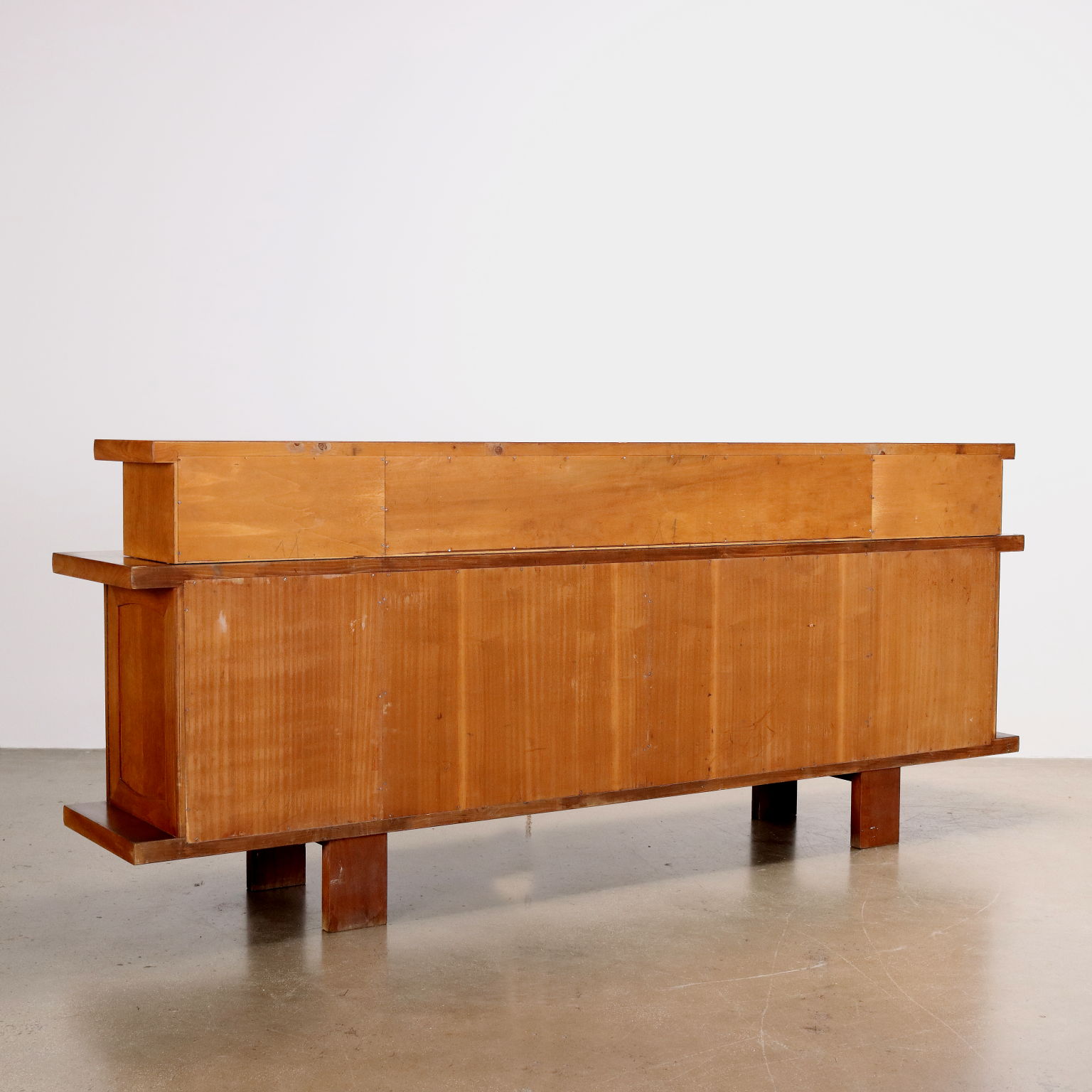 Credenza vintage realizzata in noce tanganica con ante a battente, alzata con cassetti e vani con ante in vetro fumè con dettagli in ottone.