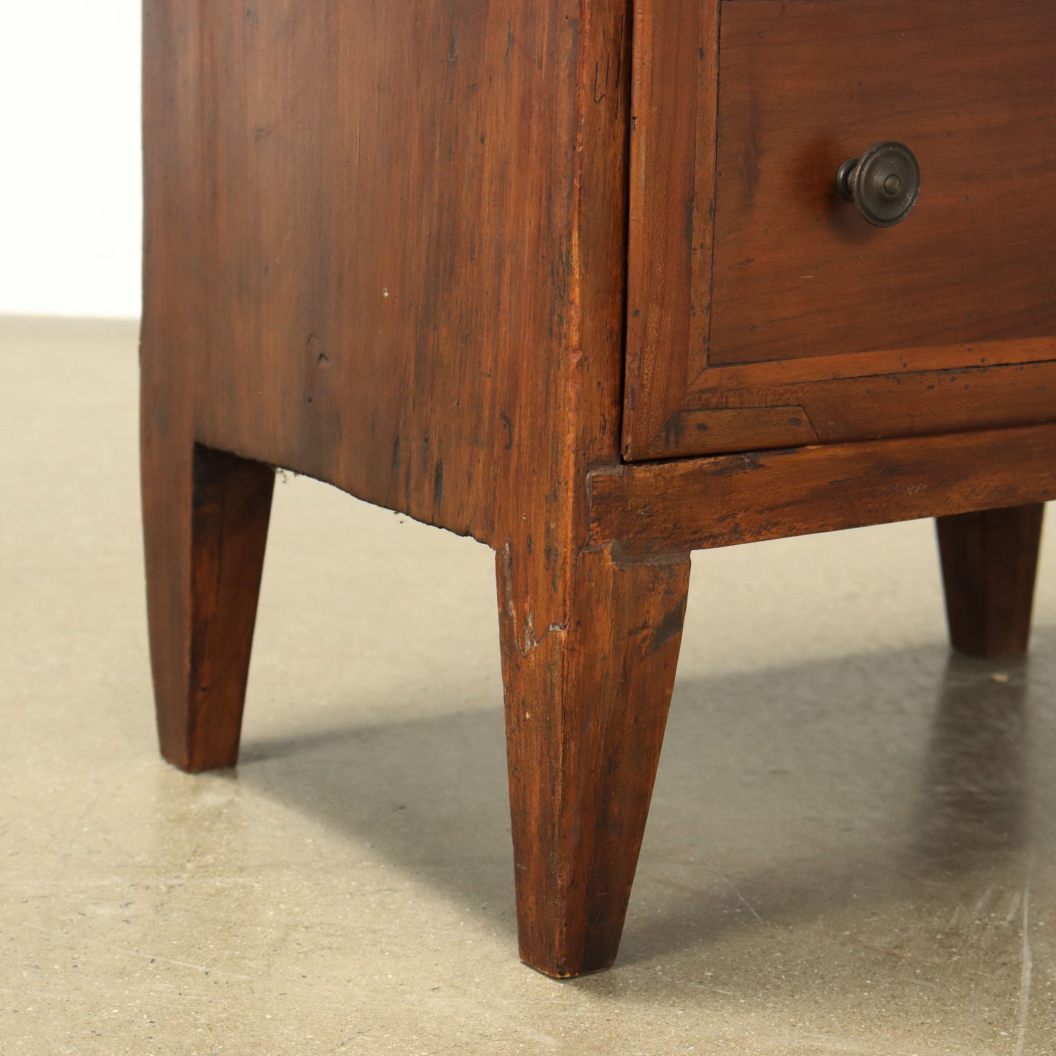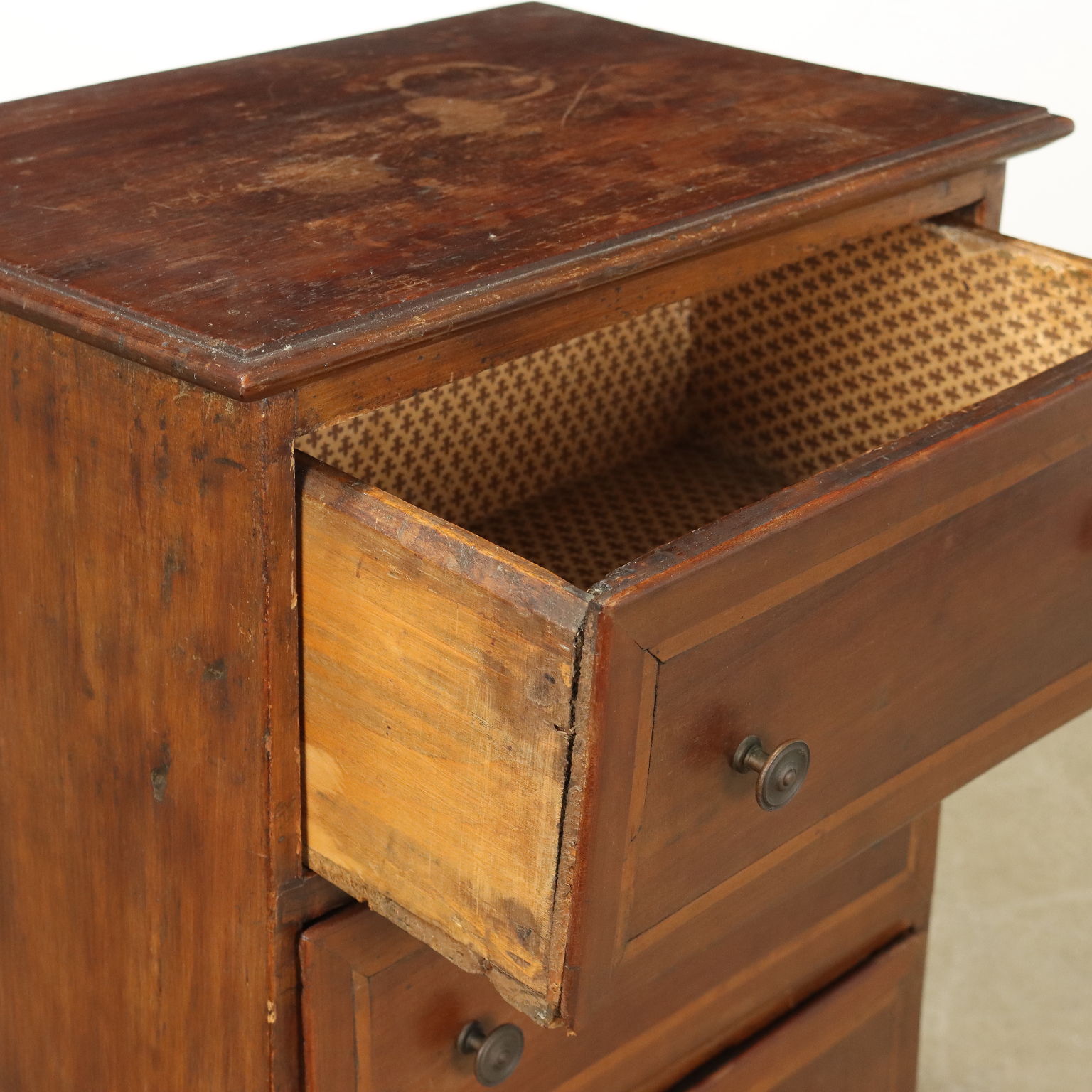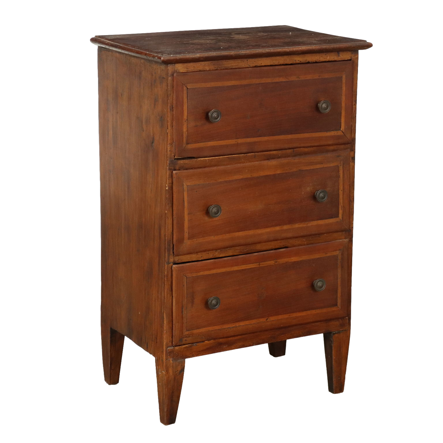 Comodino in stile neoclassico a tre cassetti, costruito in noce con legni antichi, cassetti con filettature, piedi troncopiramidali.