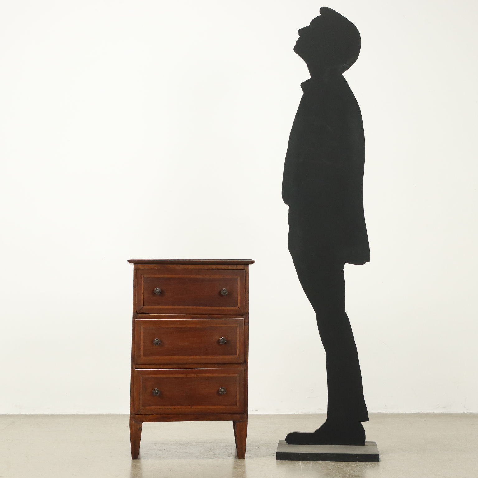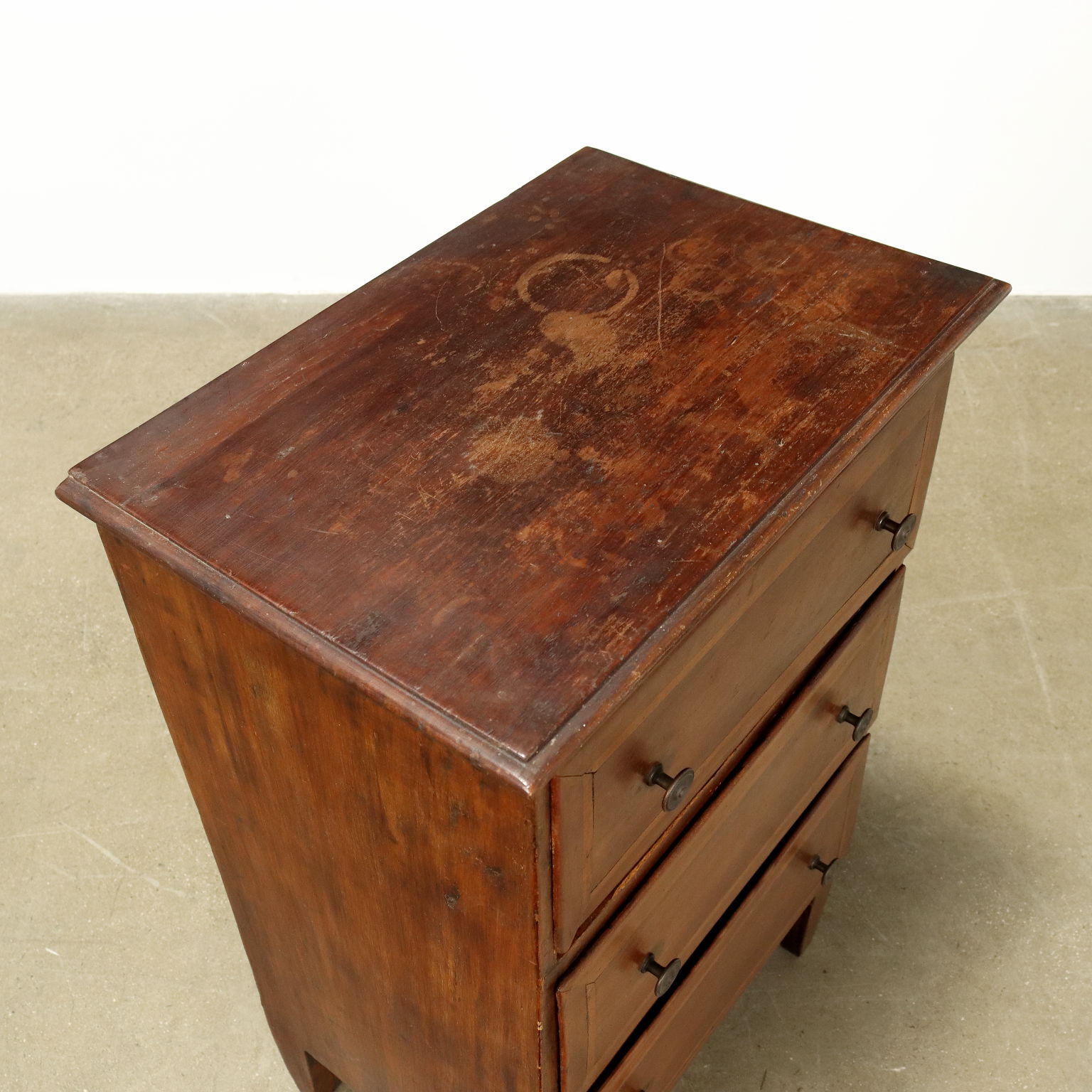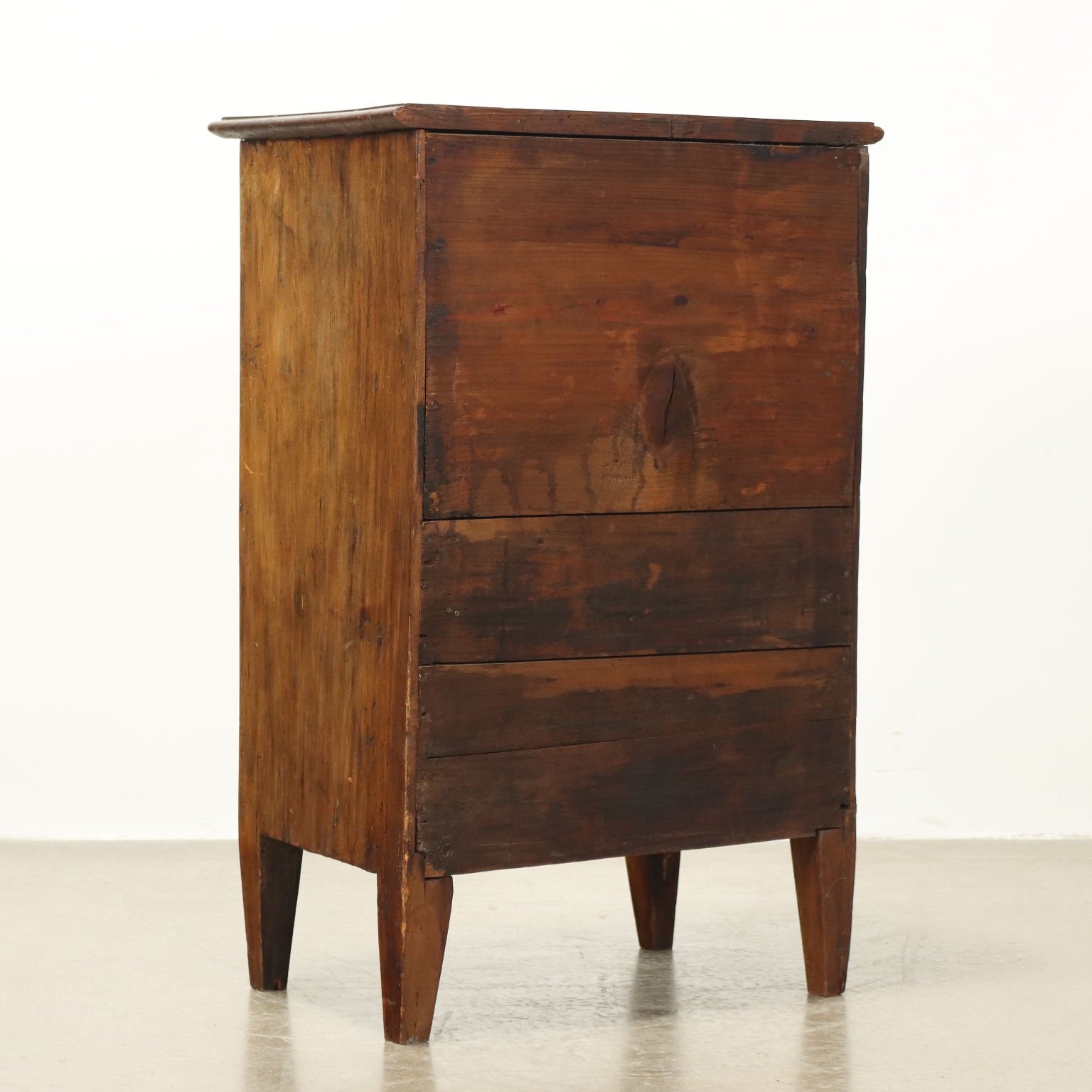 Comodino in stile neoclassico a tre cassetti, costruito in noce con legni antichi, cassetti con filettature, piedi troncopiramidali.