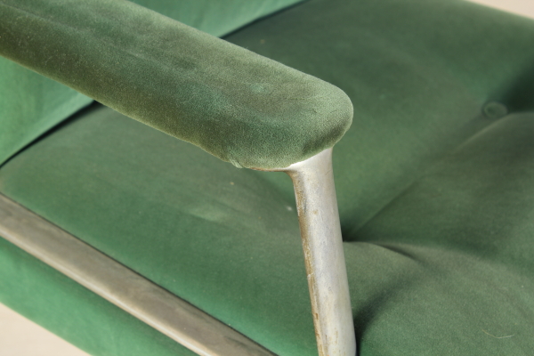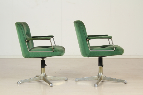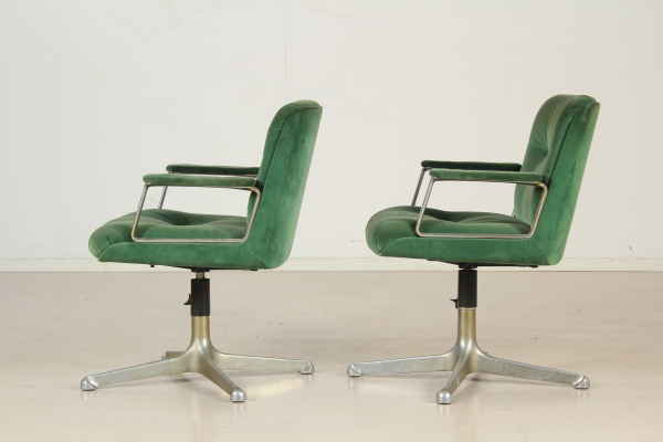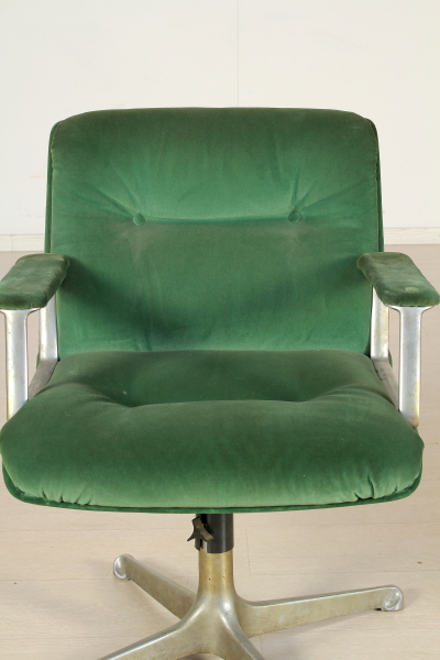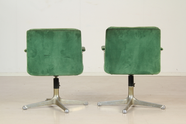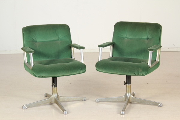Coppia di poltrone ufficio anni 50-60. La struttura è in alluminio e metallo, l'imbottitura è in espanso, il rivestimento in velluto. Buone condizioni, presentano piccoli segni di usura.