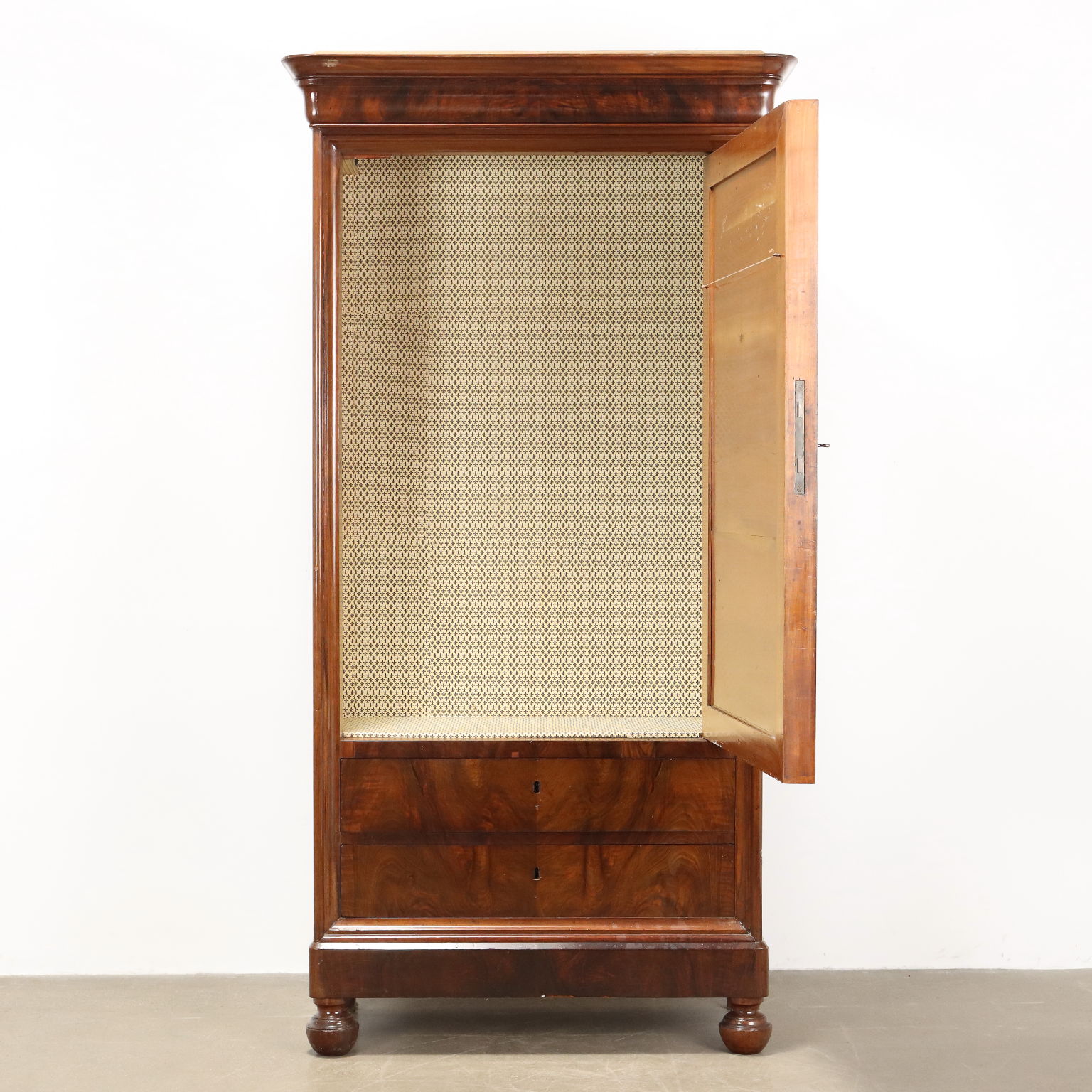 Armadio Carlo X in noce lastronato in piuma di noce, interni in ciliegio, anta centrale con specchio al mercurio, due cassetti, piedi a cipolla. Bocchette mancanti. Italia, secondo quarto XIX Secolo.