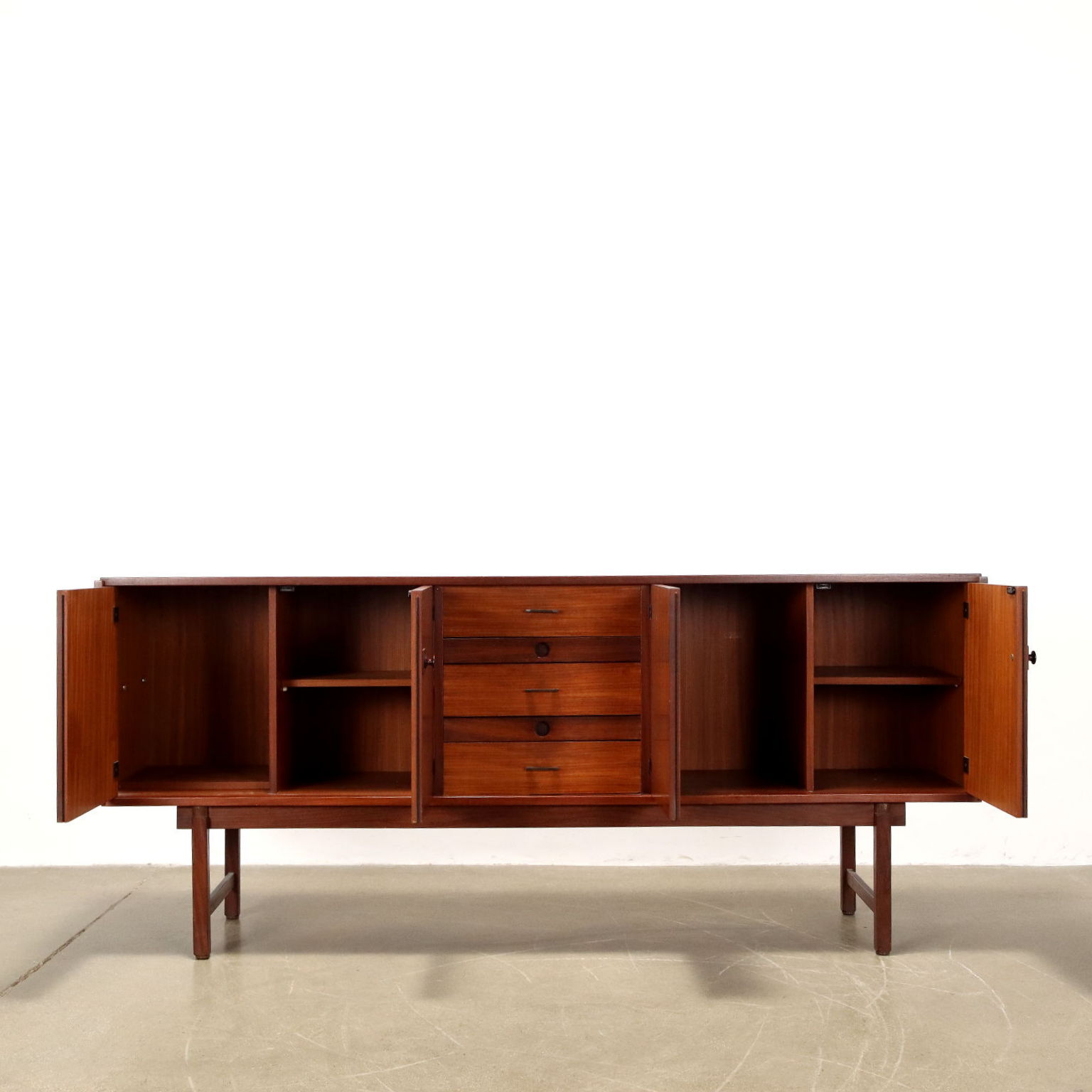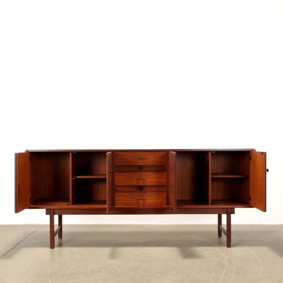 Sideboard ad ante battenti e cassetti centrali a vista, legno impiallacciato mogano.