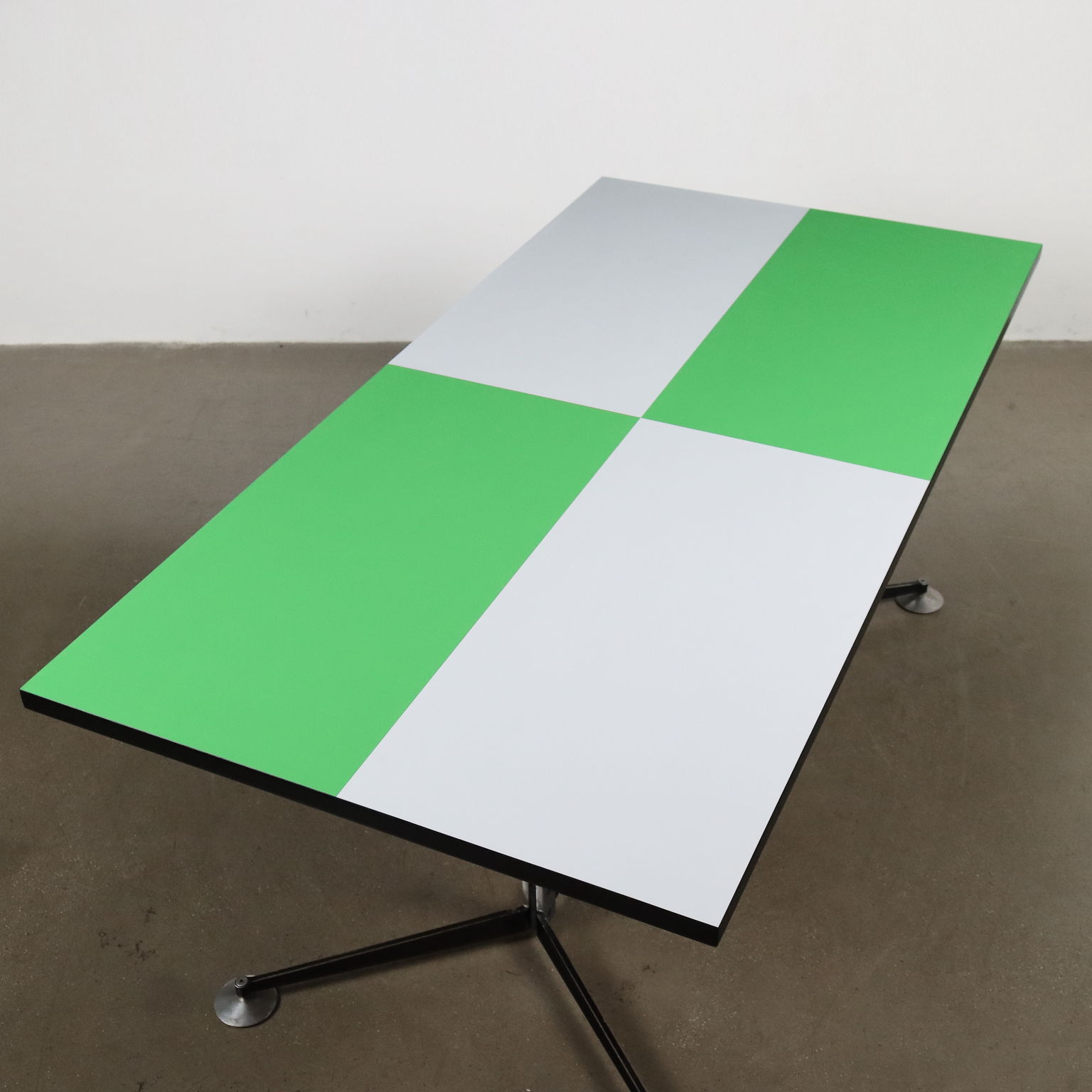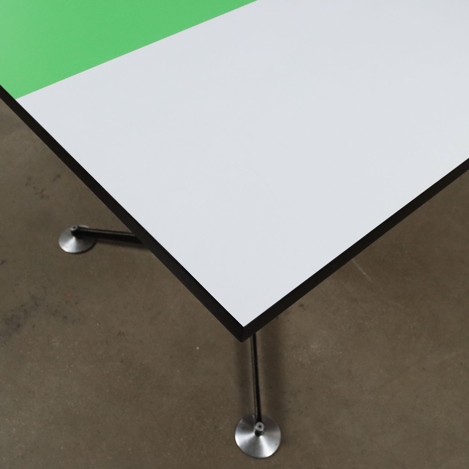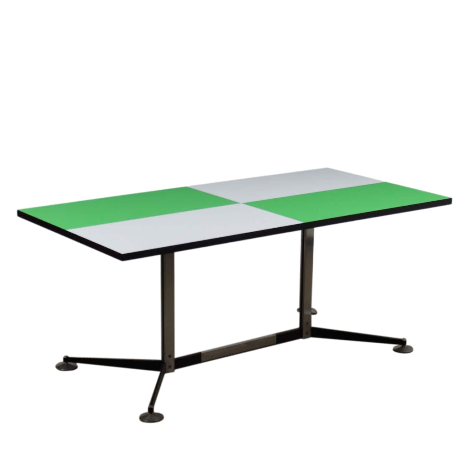 Tavolo vintage di manifattura italiana, con struttura in metallo, piedini regolabili e piano in formica bicolore, bordatura rifinita ed ebanizzata nero.
