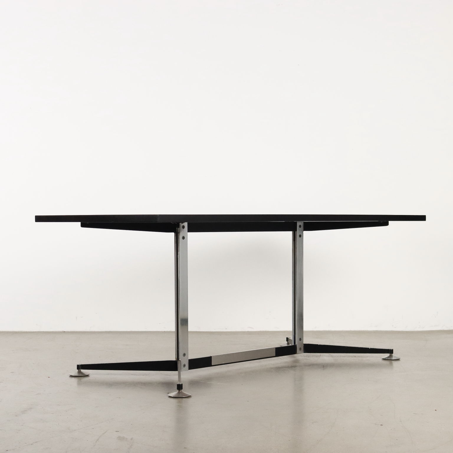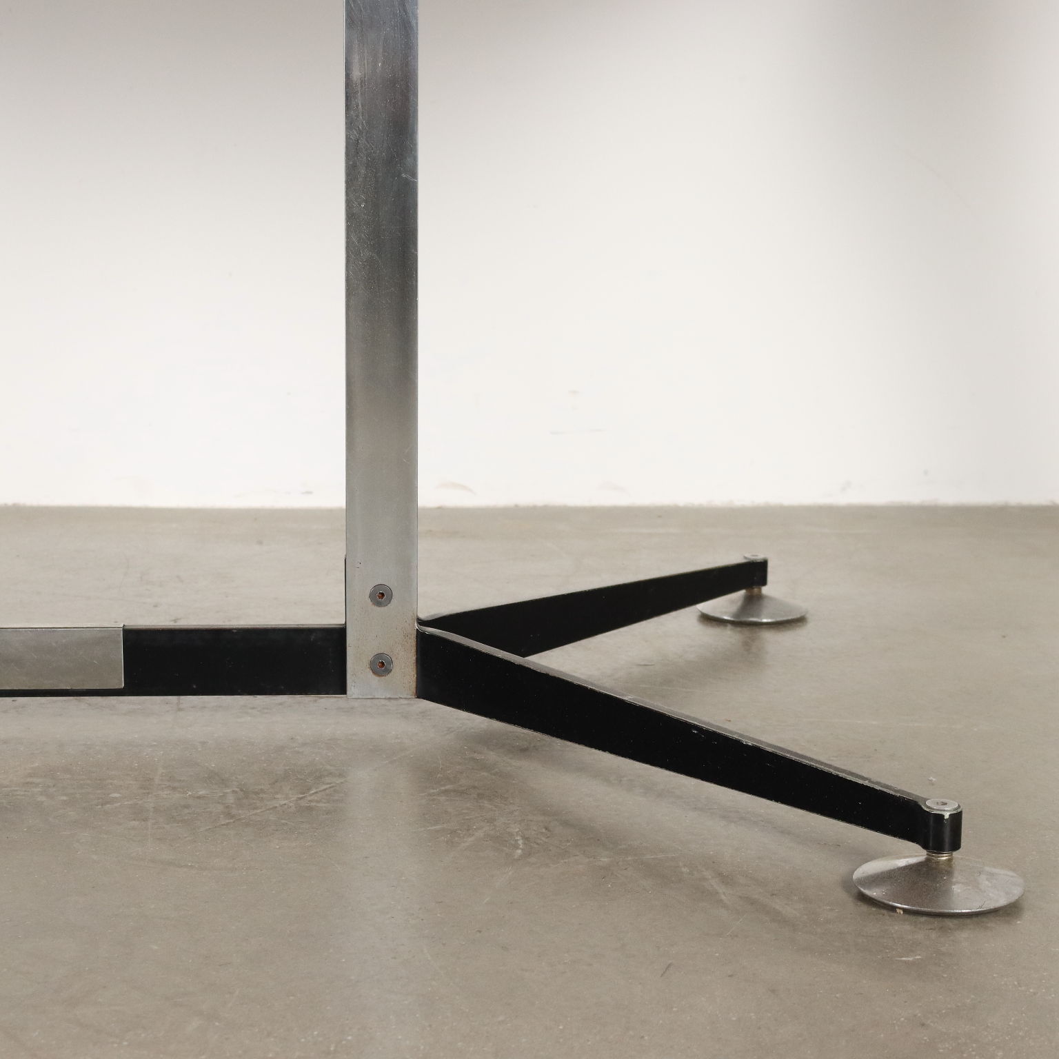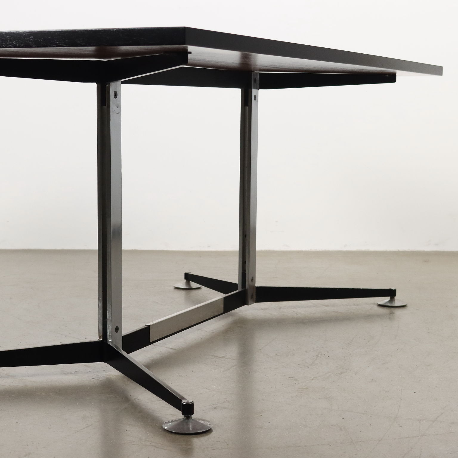 Tavolo vintage di manifattura italiana, con struttura in metallo, piedini regolabili e piano in formica bicolore, bordatura rifinita ed ebanizzata nero.
