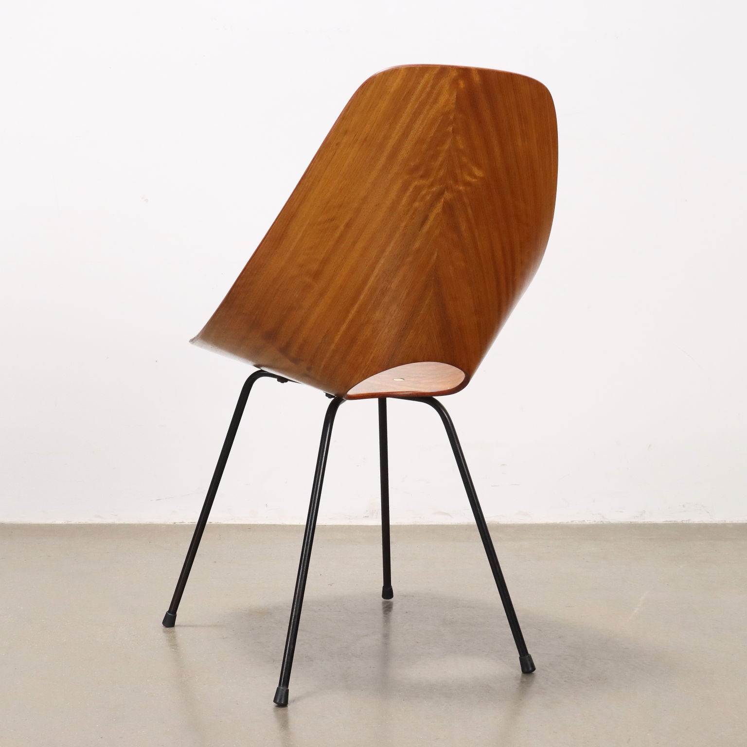 Gruppo di 6 sedie vintage modello 'Medea' con base in metallo smaltato e seduta in compensato curvato, accuratamente restaurate dal nostro laboratorio, presentano il marchio delle manifattura. Restaurate.
