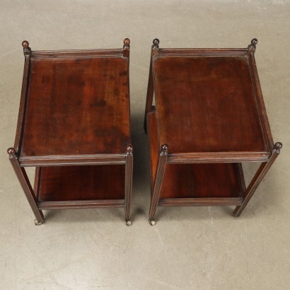 Coppia di tavolini di servizio porta riviste in mogano con ruote e sfere tornite come finali dei montanti.