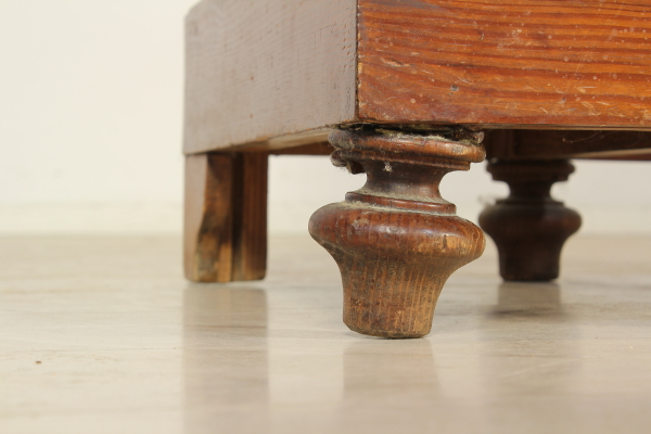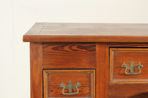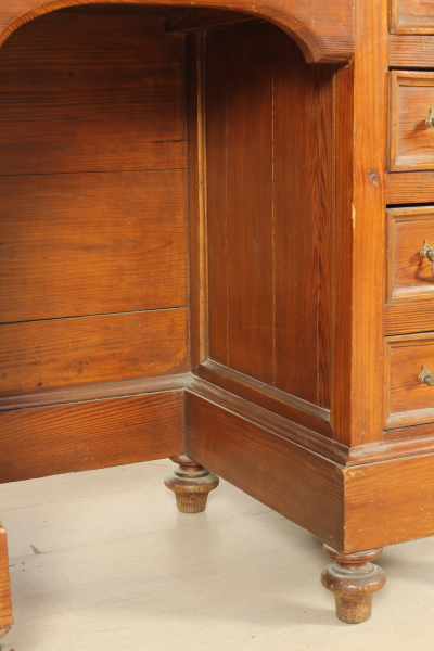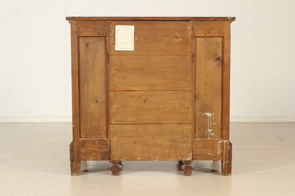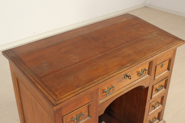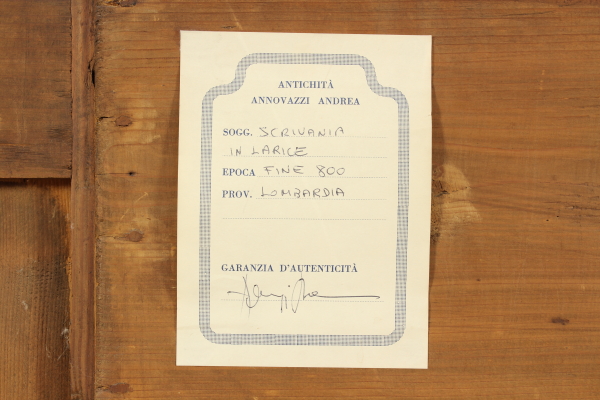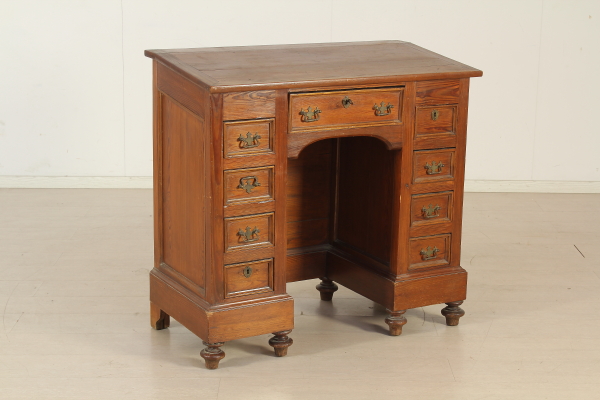 Scrittoio parietale retto da piedi torniti. Presenta nove cassetti e vano a giorno centrale. Piano inclinato ad uso leggio.Sul piano intarsi a toppo.