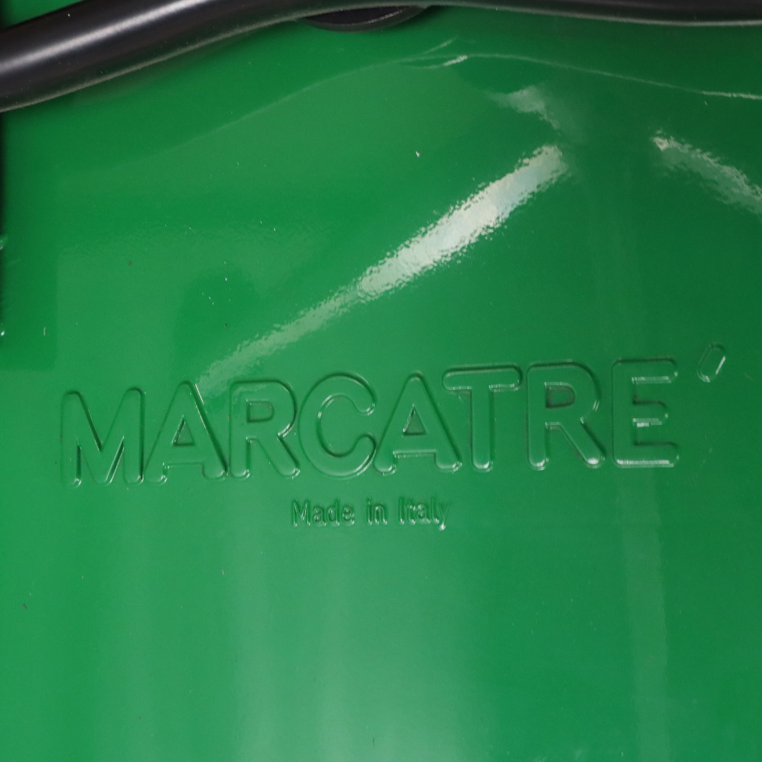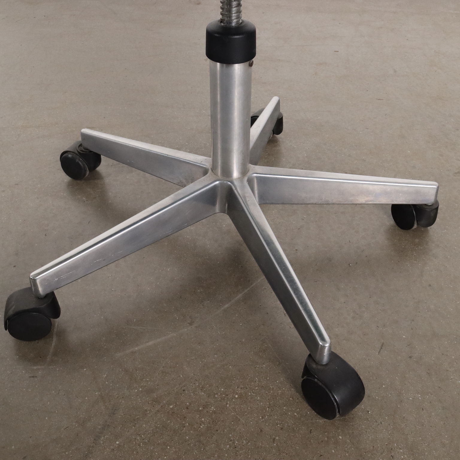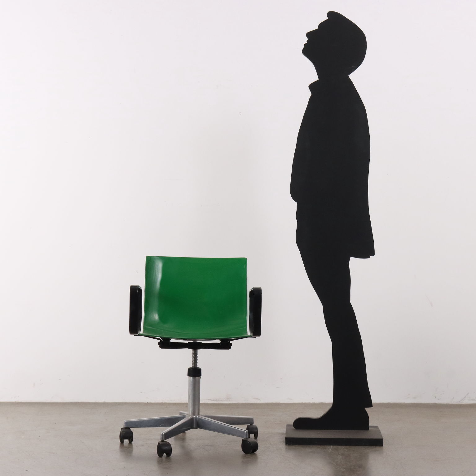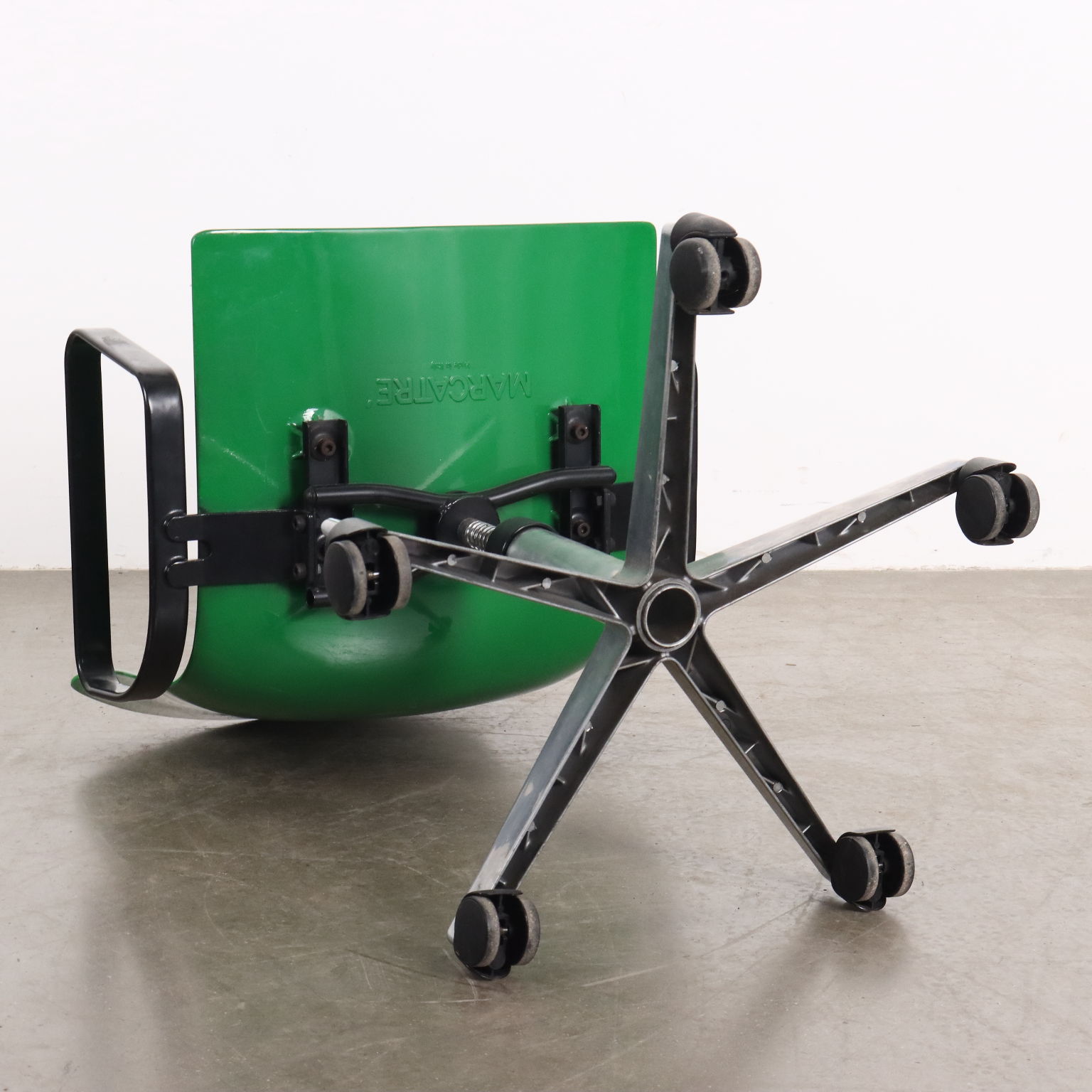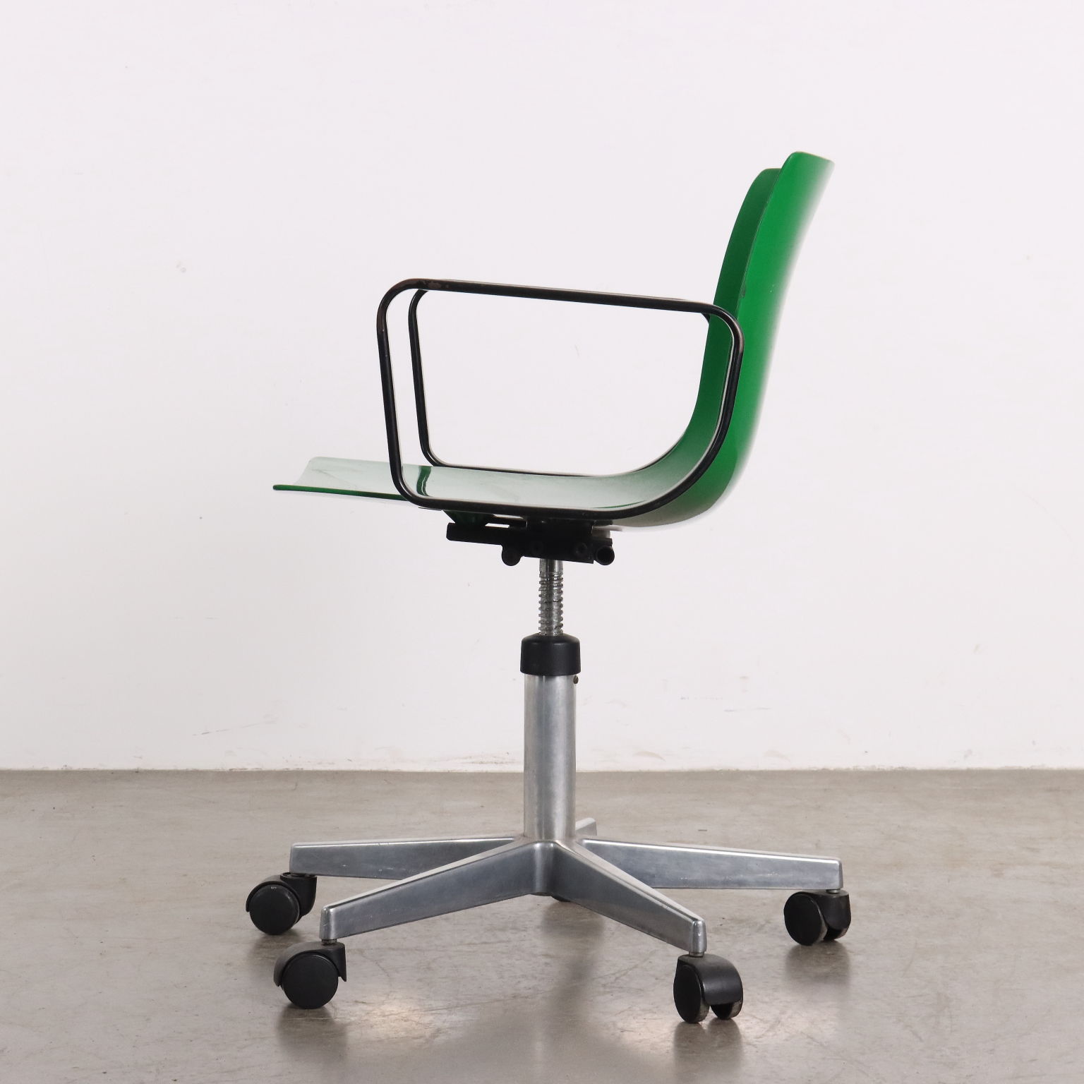 Sedia da ufficio vintage ad altezza regolabile con seduta in materiale plastico verde, braccioli neri, base a cinque razze in metallo con rotelle.