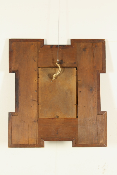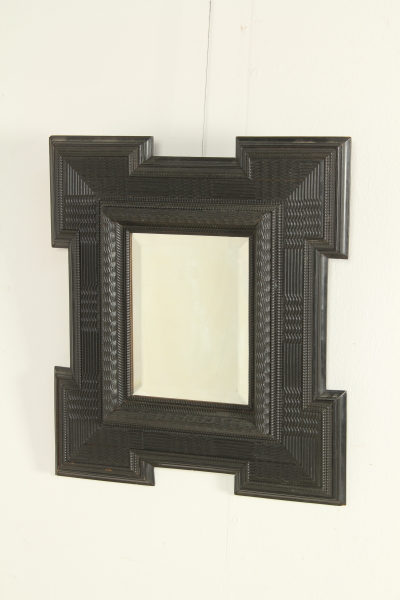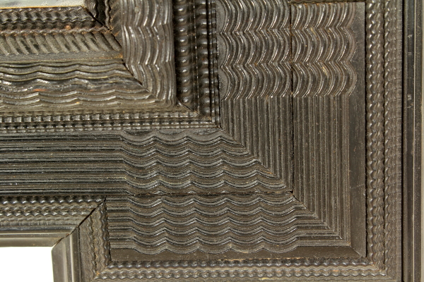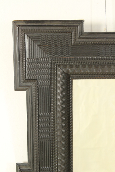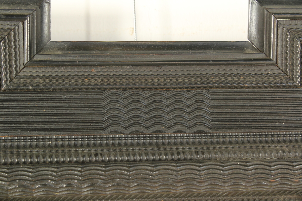 Cornice intagliata a guilloche a più ordini ed ebanizzata secondo il gusto rinascimentale, specchio centrale.