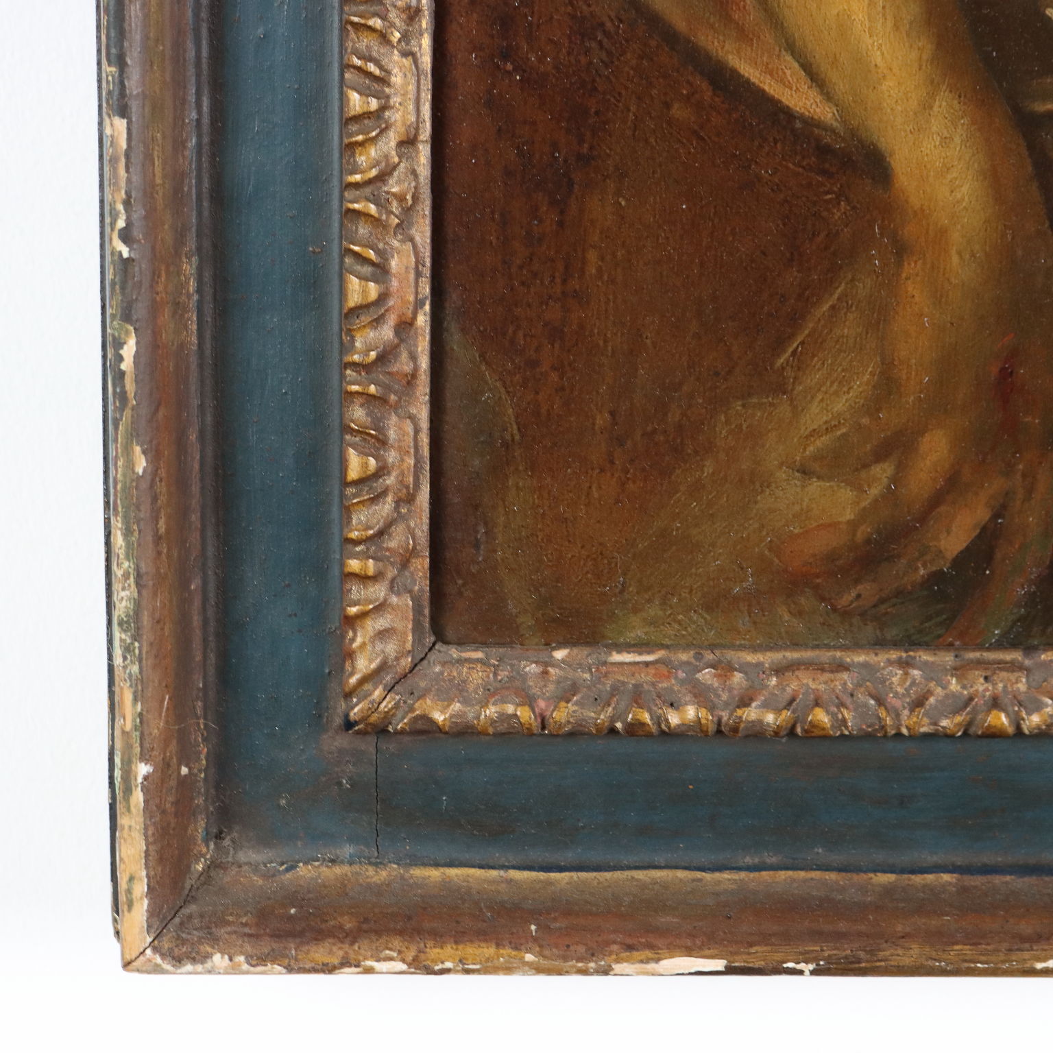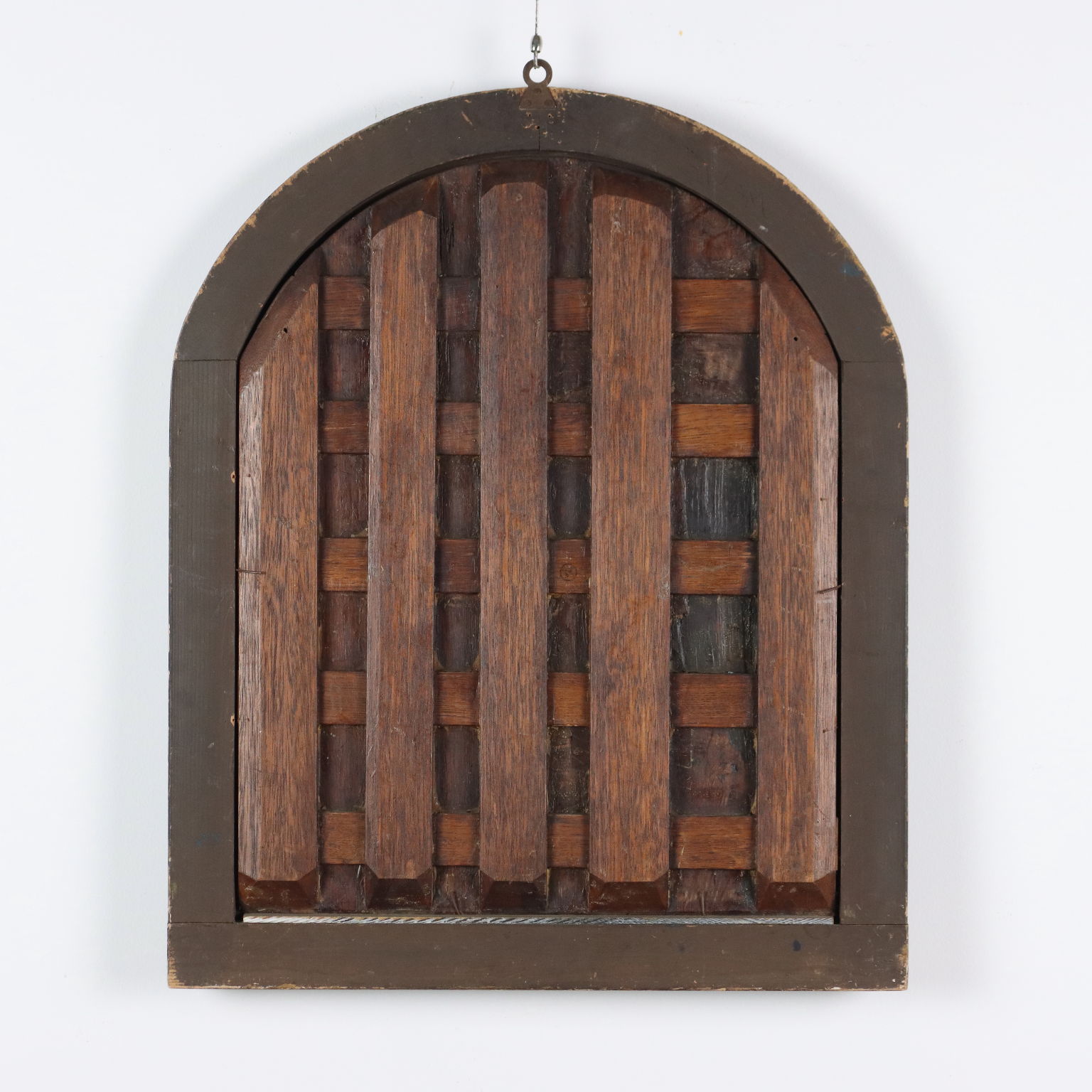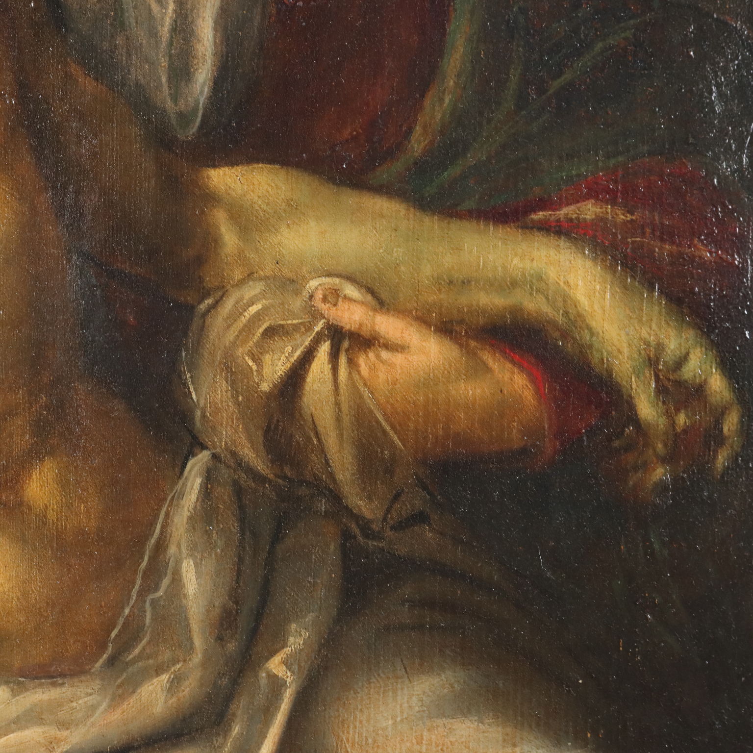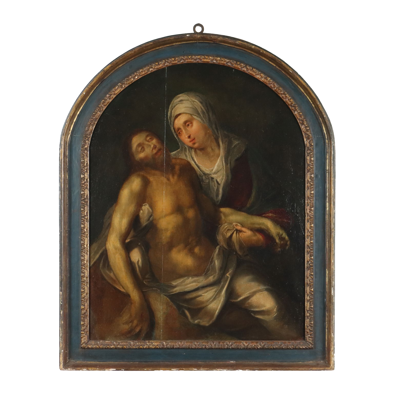 Olio su tavola di rovere. Scuola nord-europea del XIX secolo. Dipinta con modi secenteschi, il dipinto presenta la figura di Maria che regge il corpo esanime del Figlio, in una composizione dolente che viene conosciuta anche come la Pietà. In questa rappresentazione prevale la dimensione umana, il dolore materno, mancando ogni accenno di spiritualità. La tavola è stata parchettata. E' presentata in cornice di inizio '900.