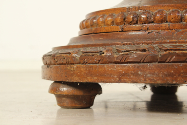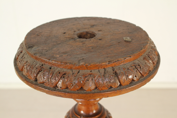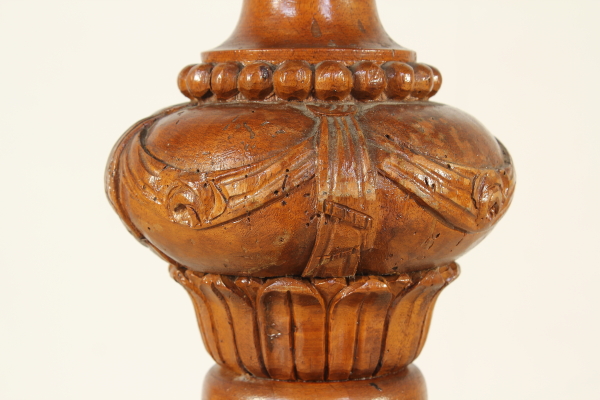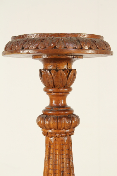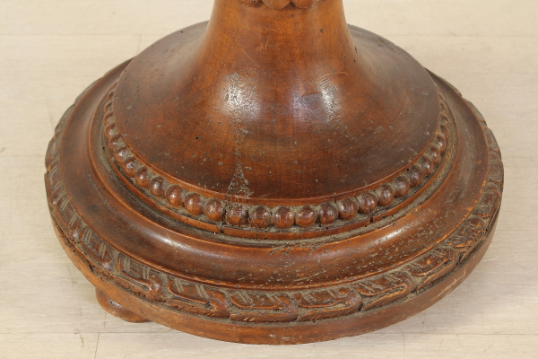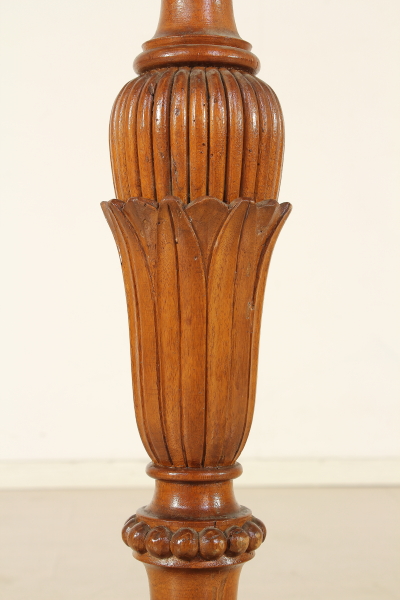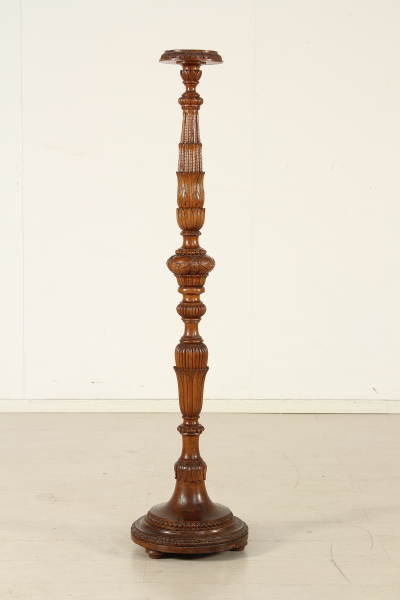 Torciere tornito e intagliato con motivi di gusto neoclassico.