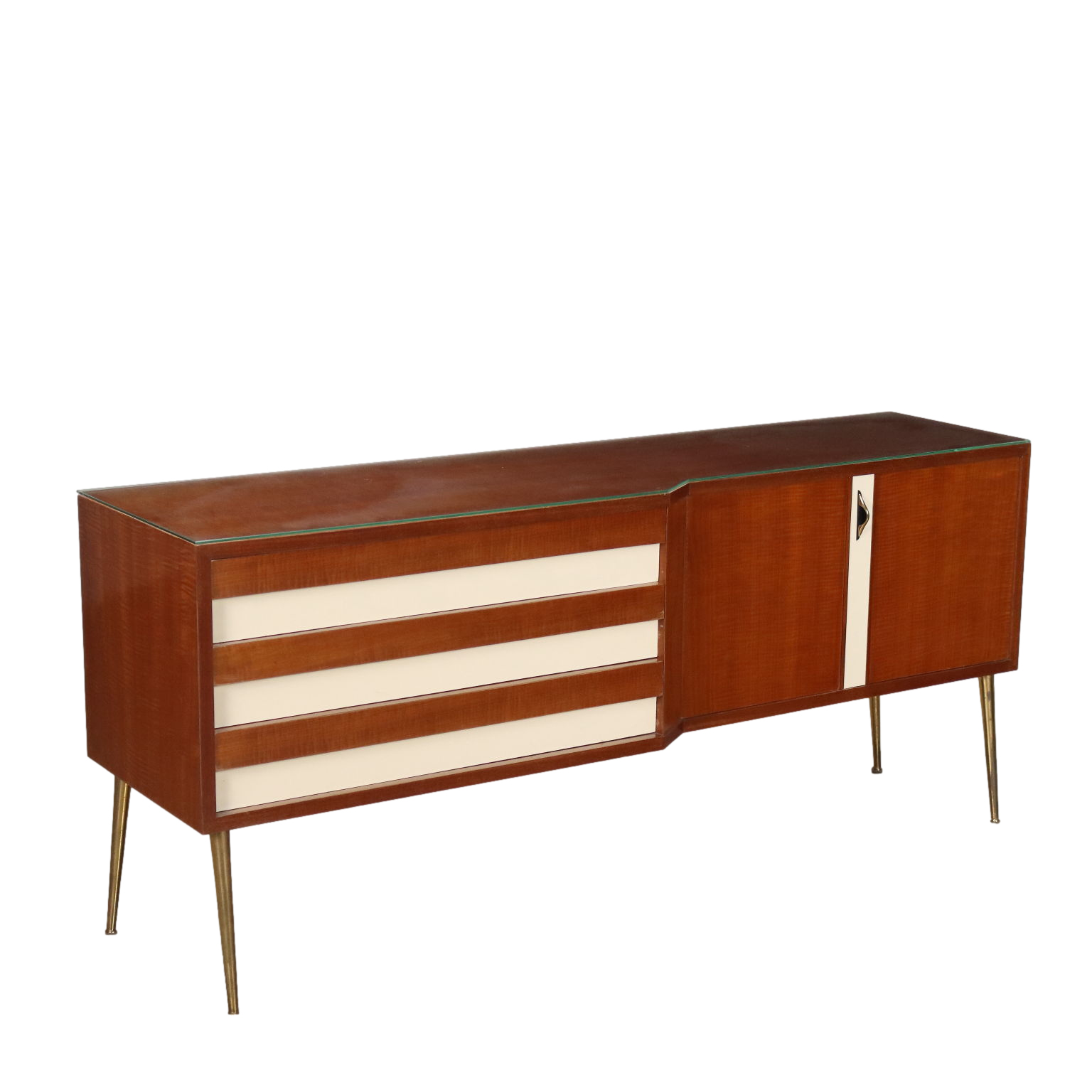 Mobile a cassetti e ante battenti, in legno impiallacciato mogano, inserti in formica e vetro trasparente in appoggio sul piano.
