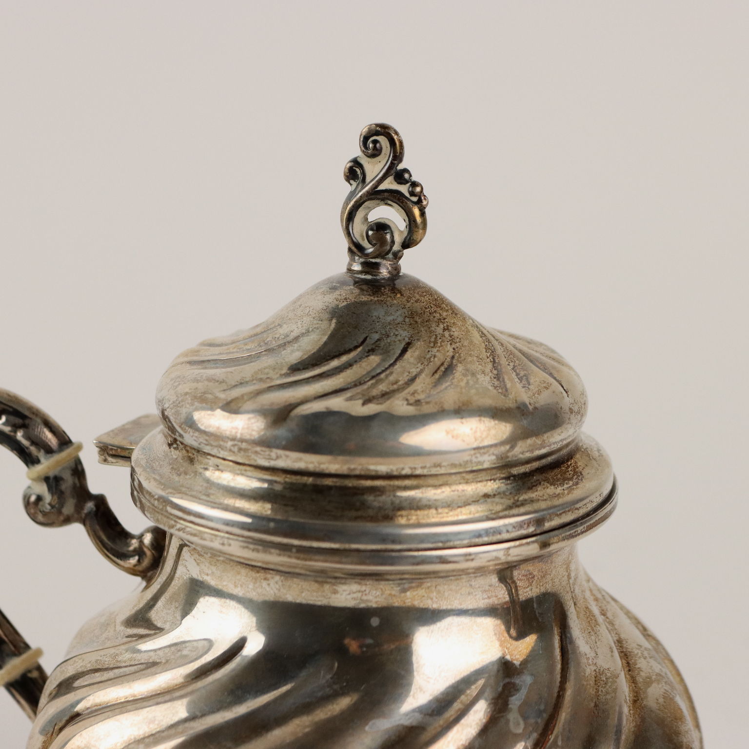 Teiera in argento baccellato con presa, manico e becco sbalzati e incisi a volute fogliacee. Marchi dell'argento incussi sotto la base. Grammi 400.
