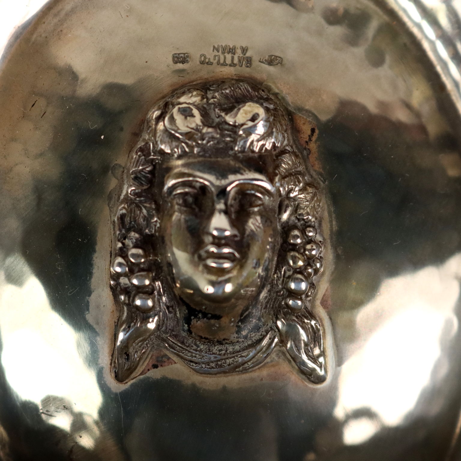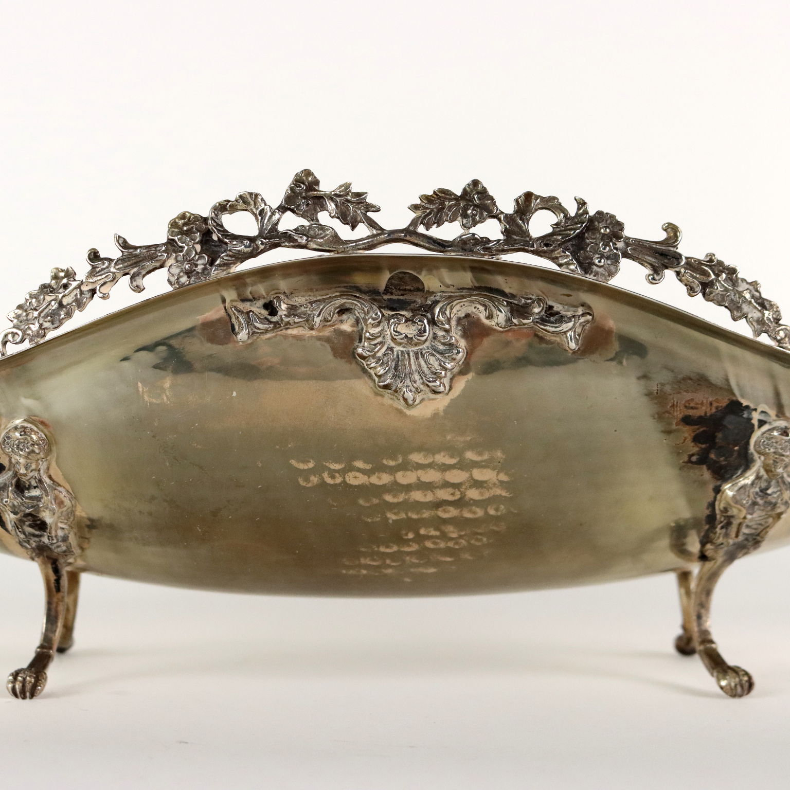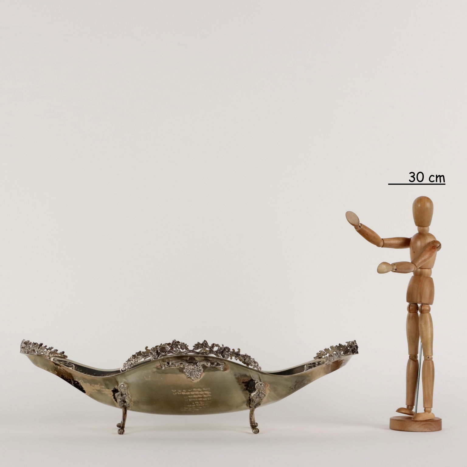 Centrotavola in argento battuto, sbalzato, cesellato e traforato retto da quattro piedini a foggia di vestale. All'interno decoro in rilievo raffigurante volti con grappoli d'uva. Sul bordo festoni fioriti e volute. Marchi dell'argento incussi. Grammi 950.