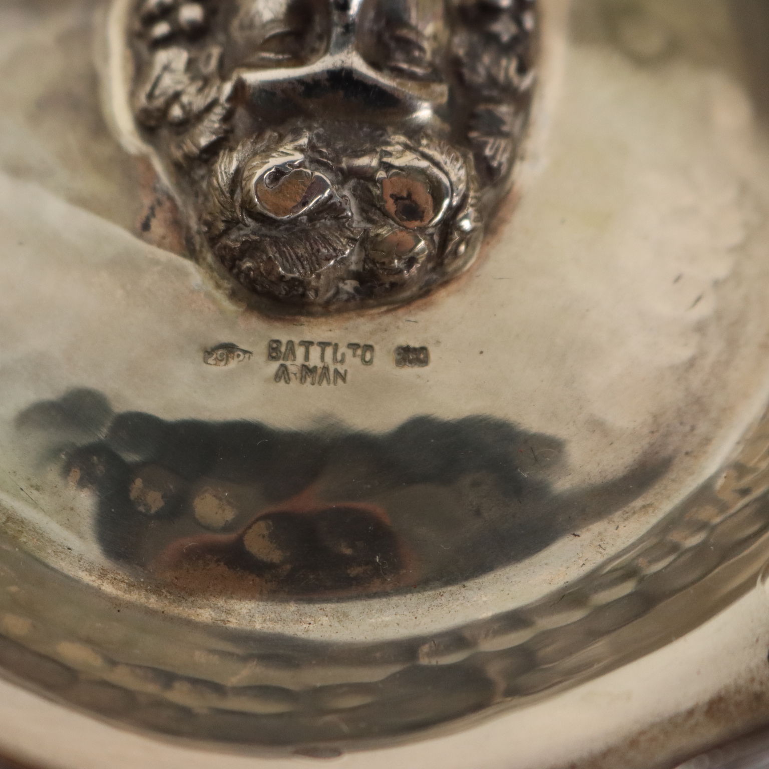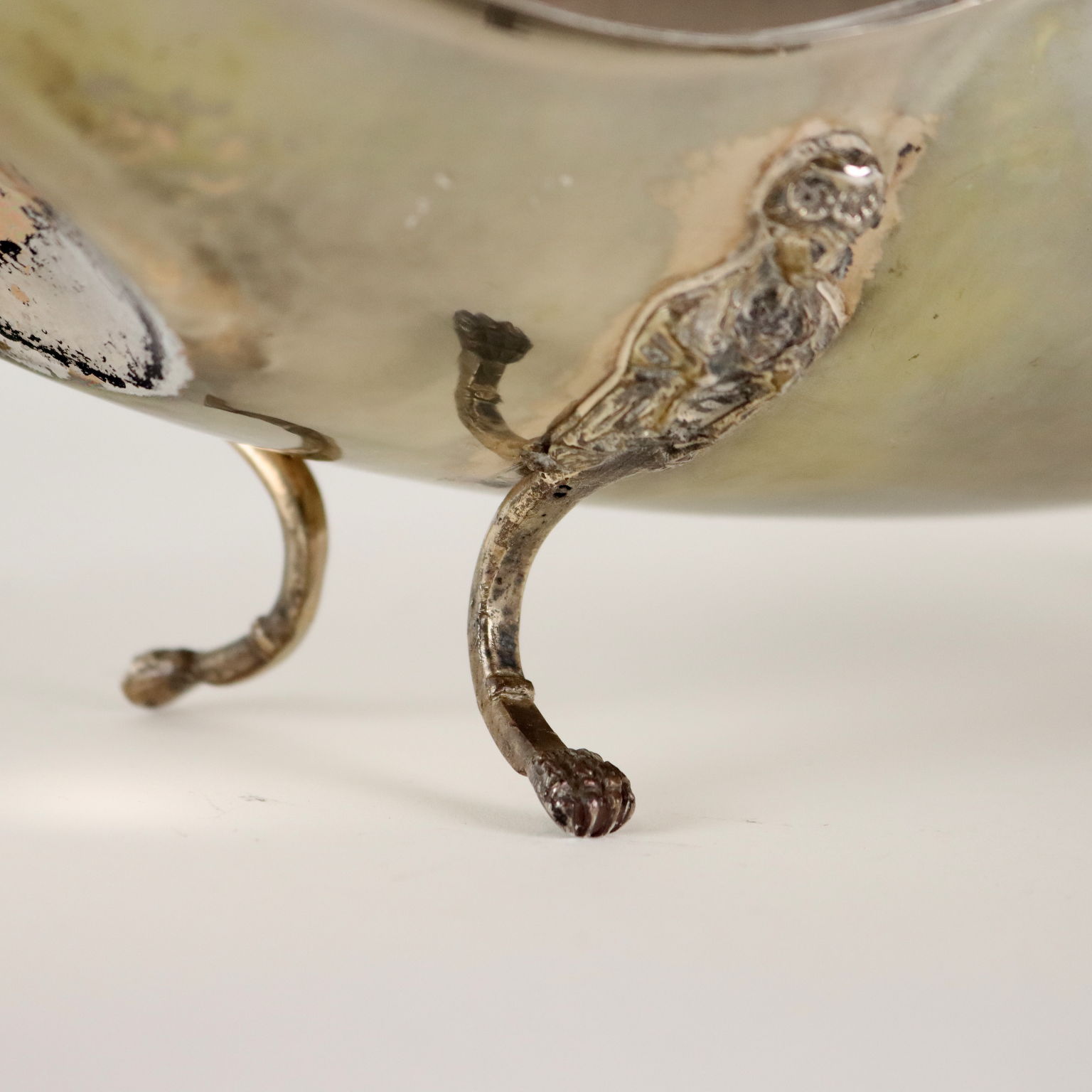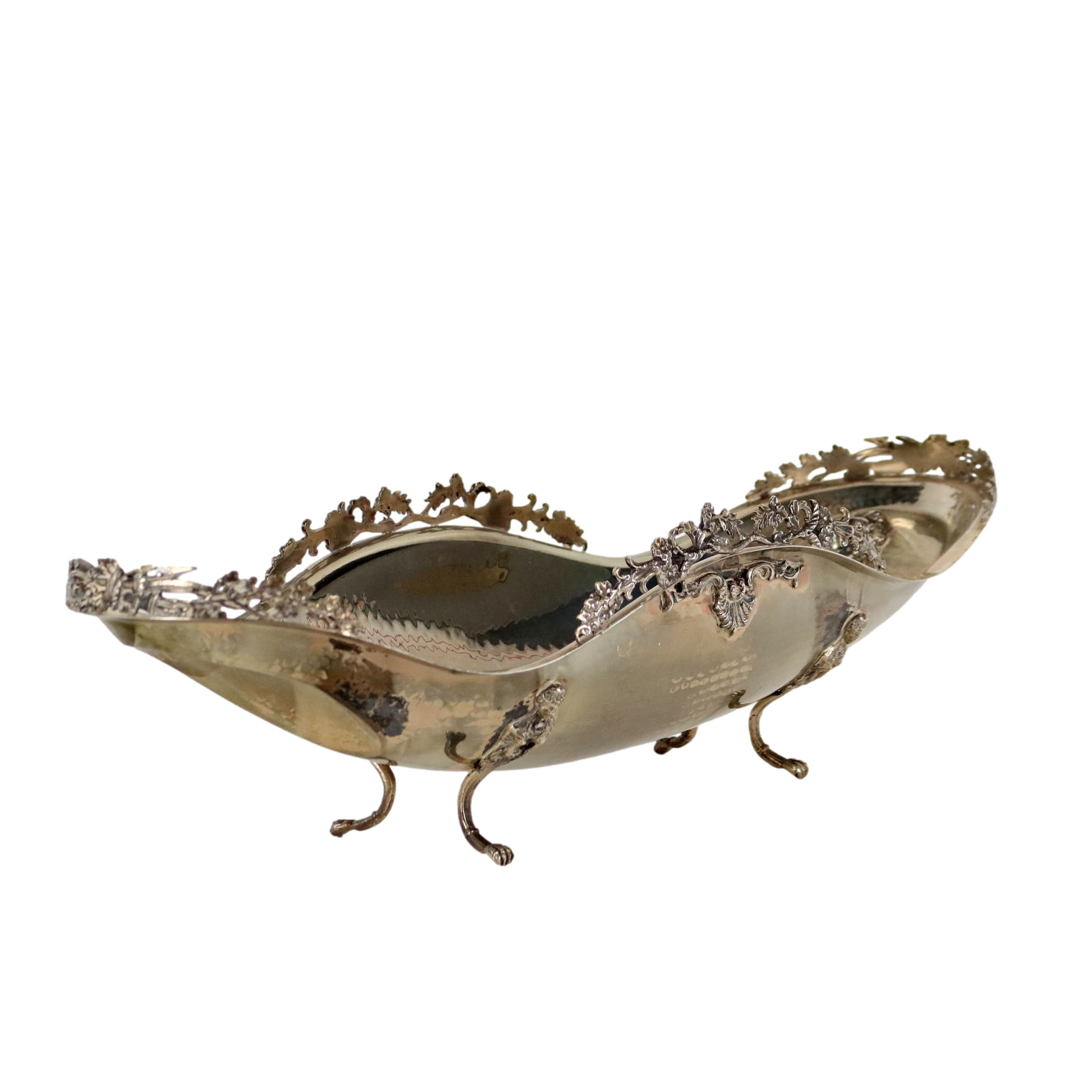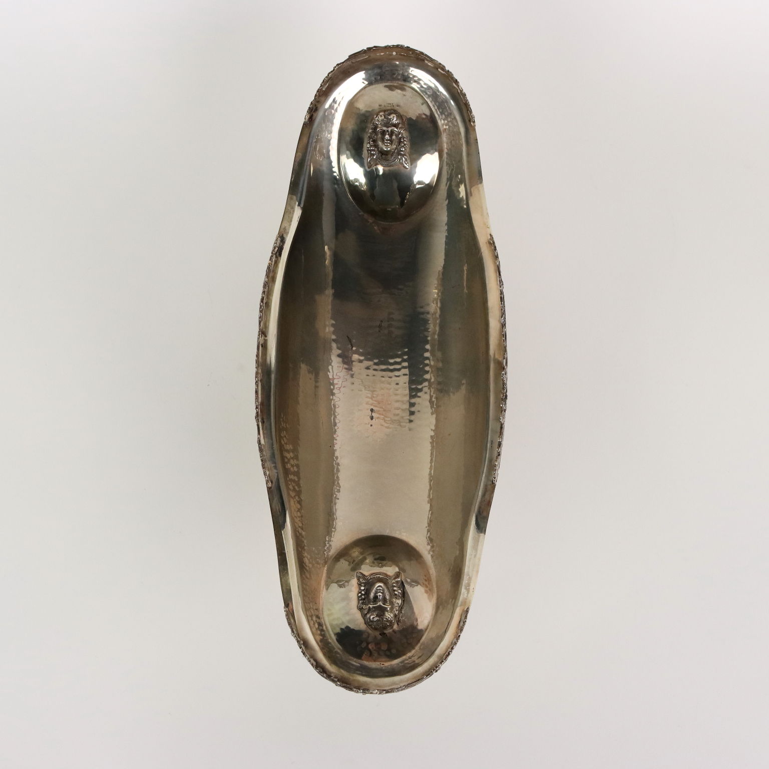 Centrotavola in argento battuto, sbalzato, cesellato e traforato retto da quattro piedini a foggia di vestale. All'interno decoro in rilievo raffigurante volti con grappoli d'uva. Sul bordo festoni fioriti e volute. Marchi dell'argento incussi. Grammi 950.