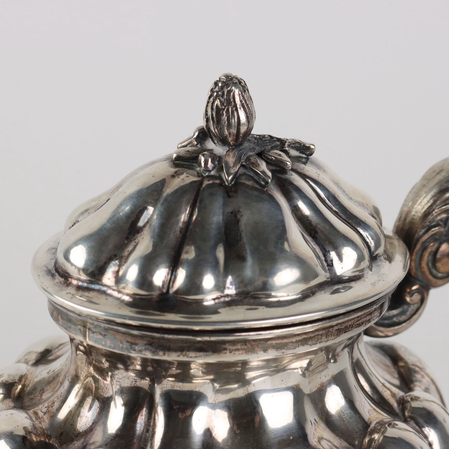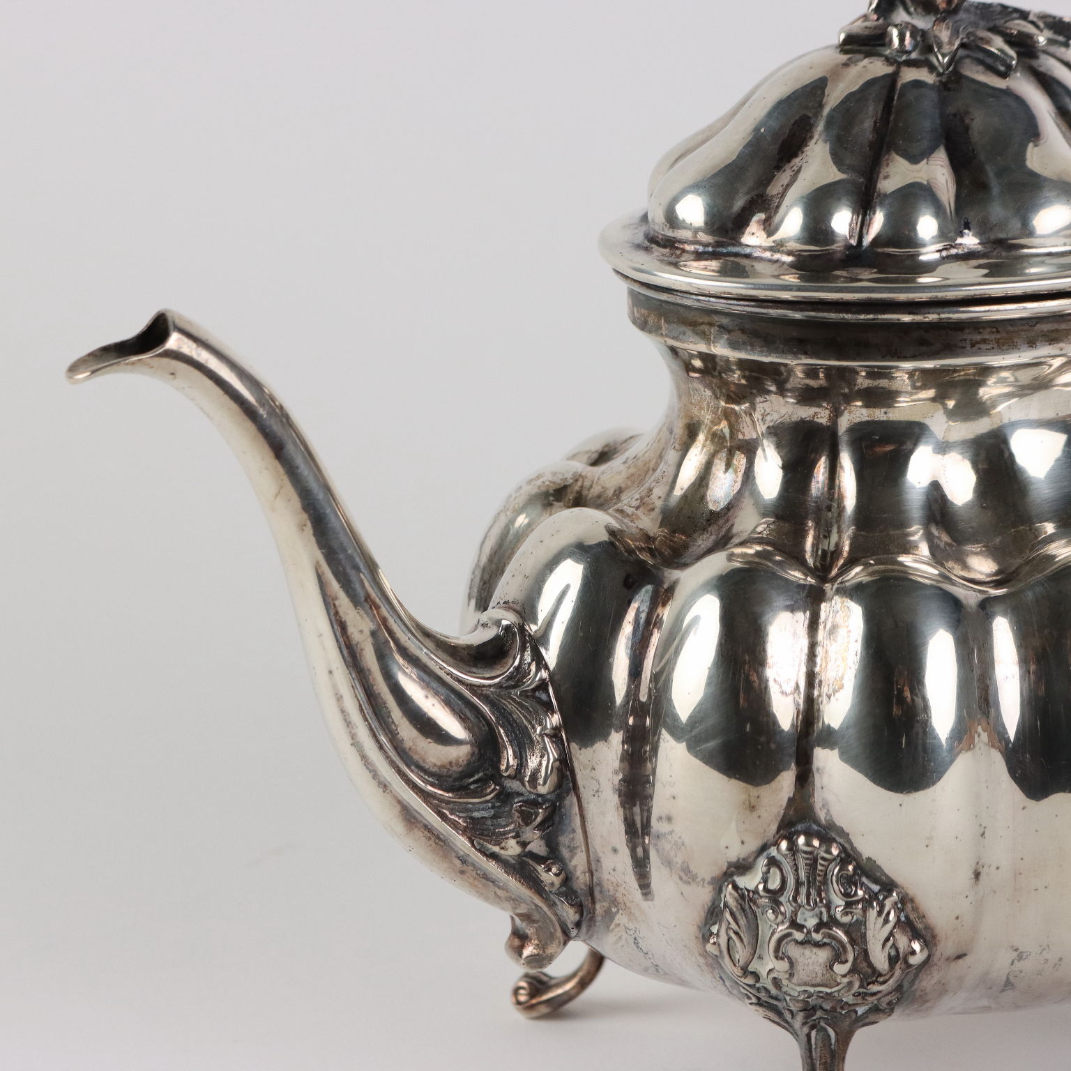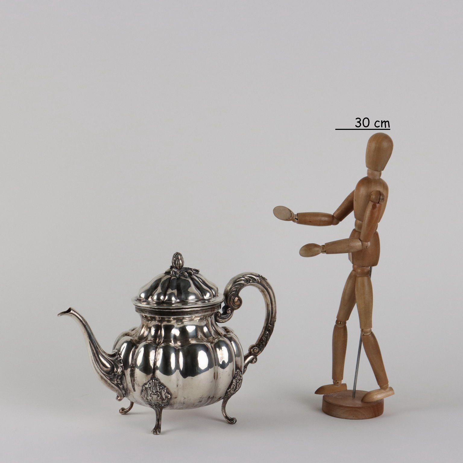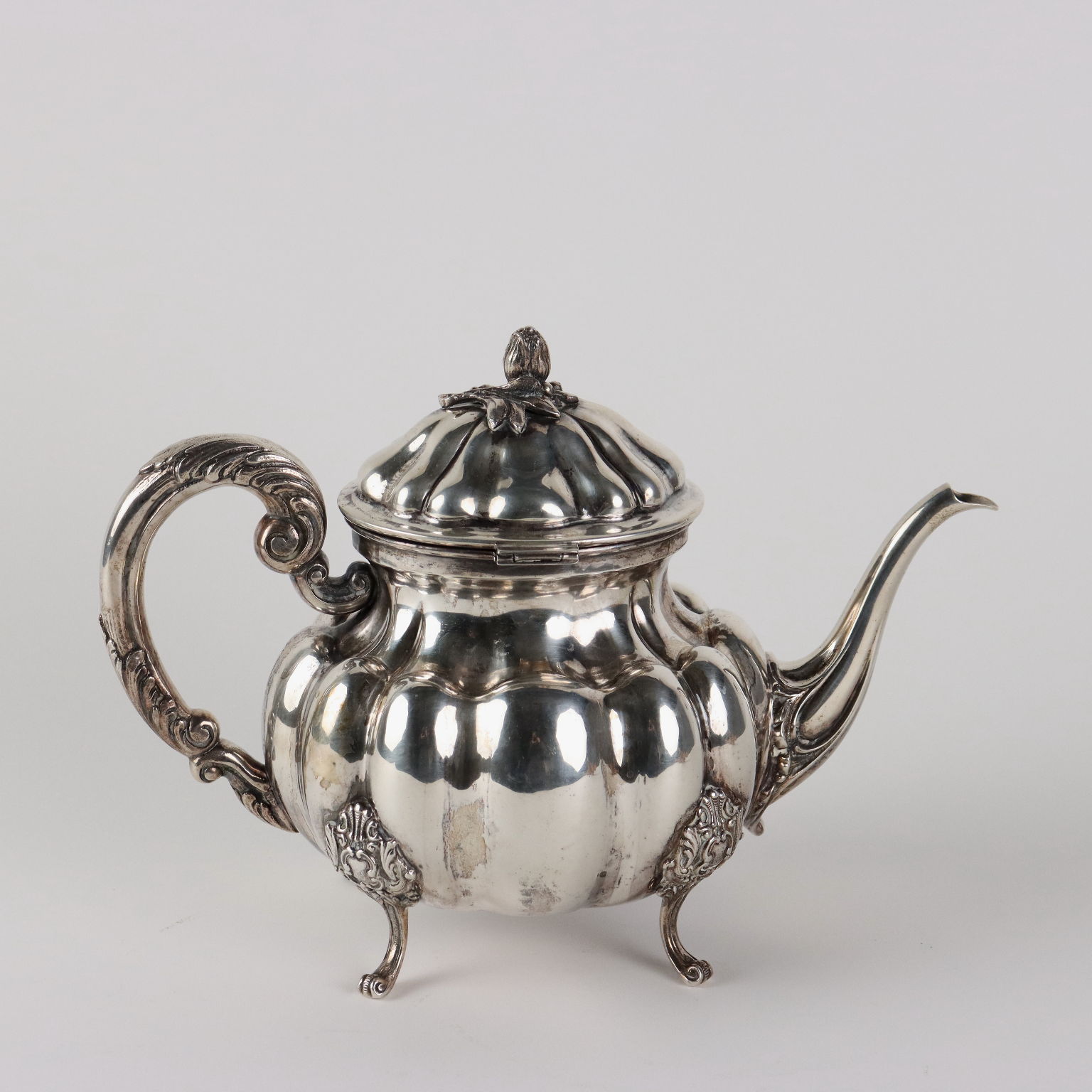 Teiera in argento baccellato e cesellato. Manico, beccuccio e piedini a volute fogliacce. Presa del coperchio a bocciolo. Marchi dell'argento incussi sotto la base. Argentiere non identificato. Grammi 900.
