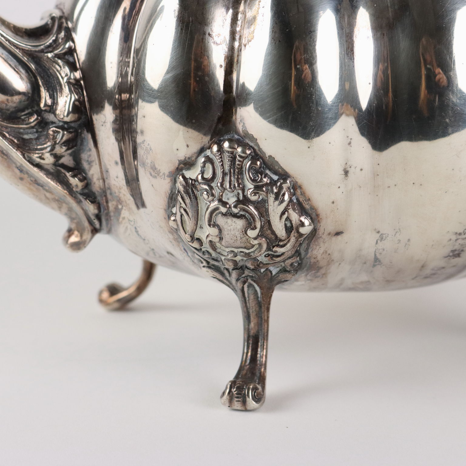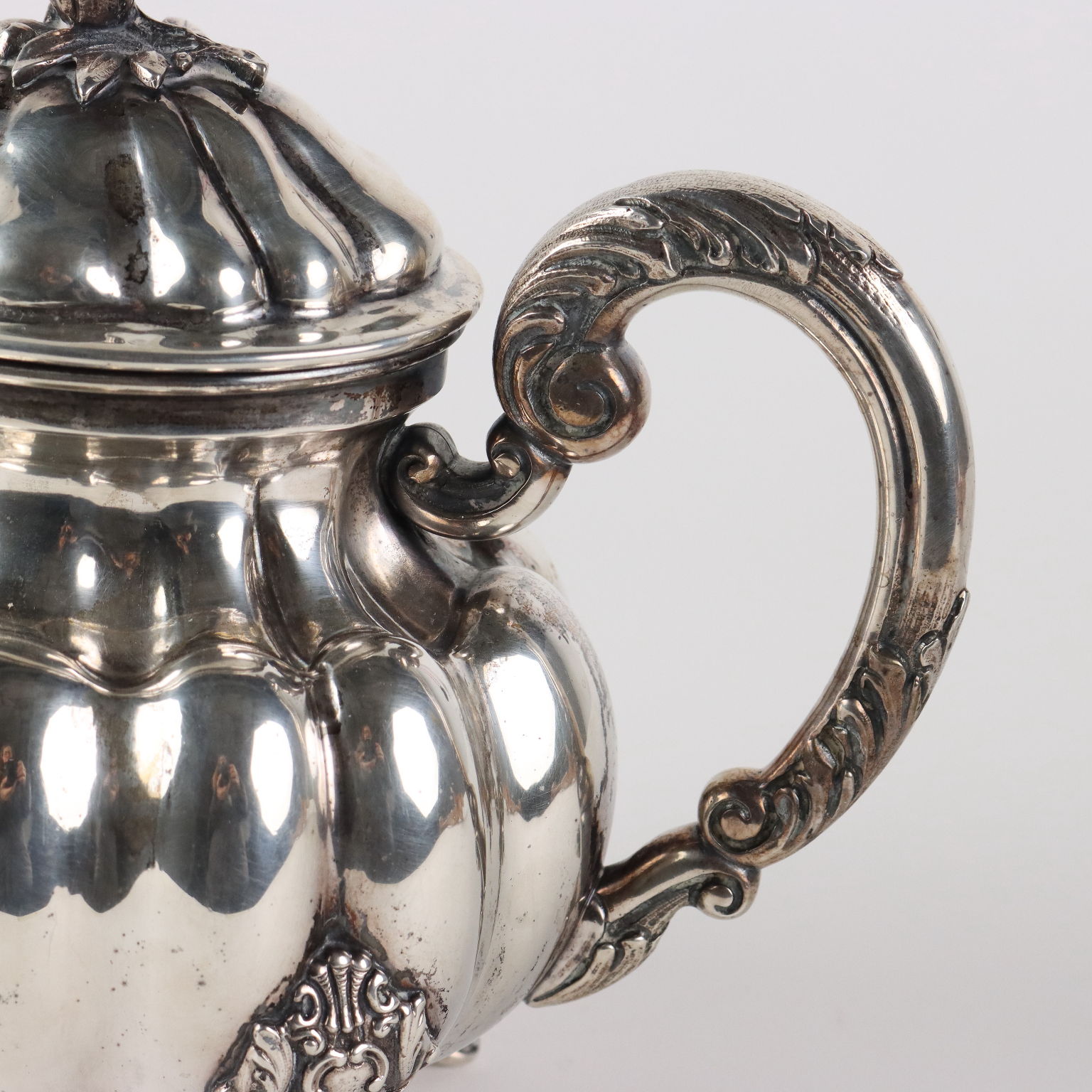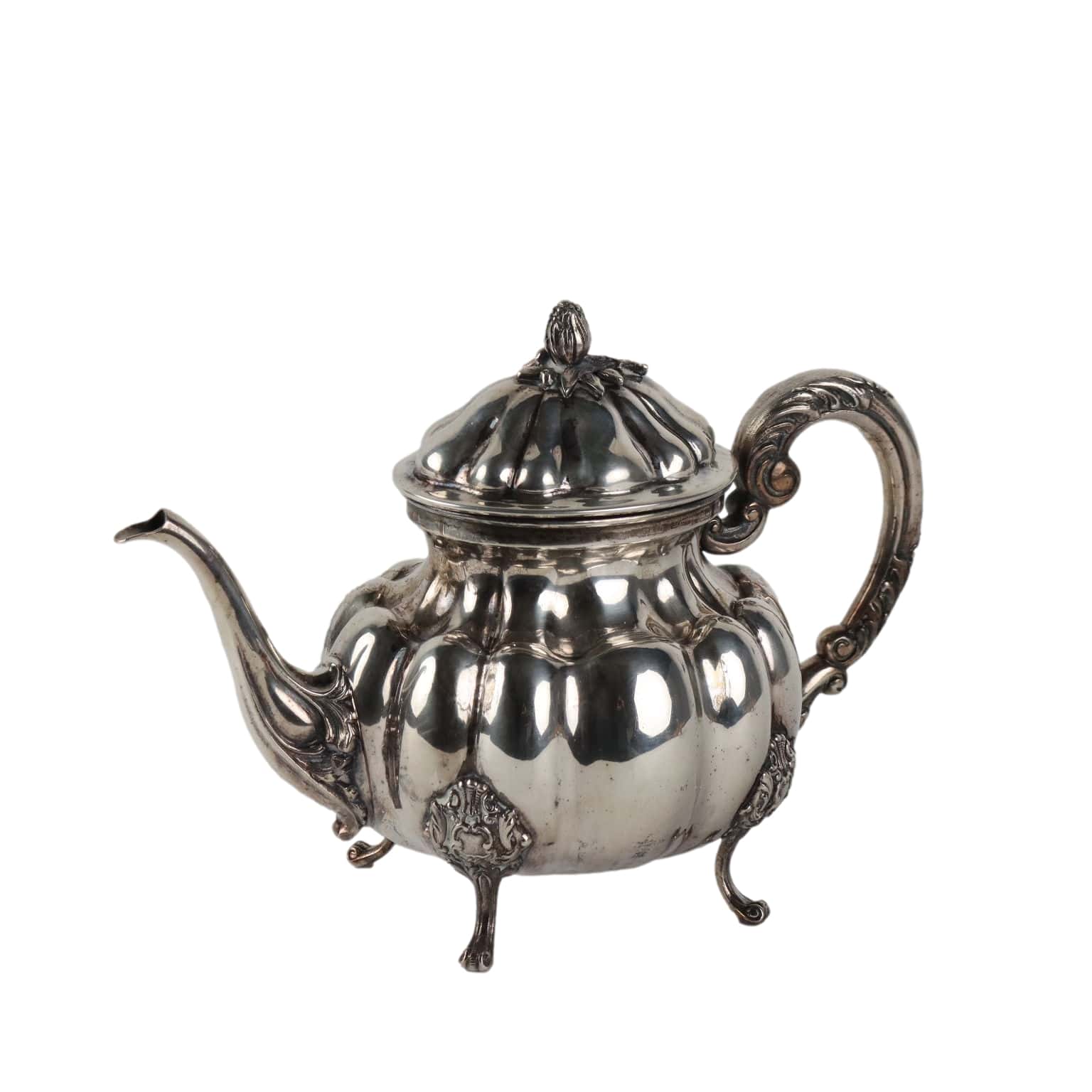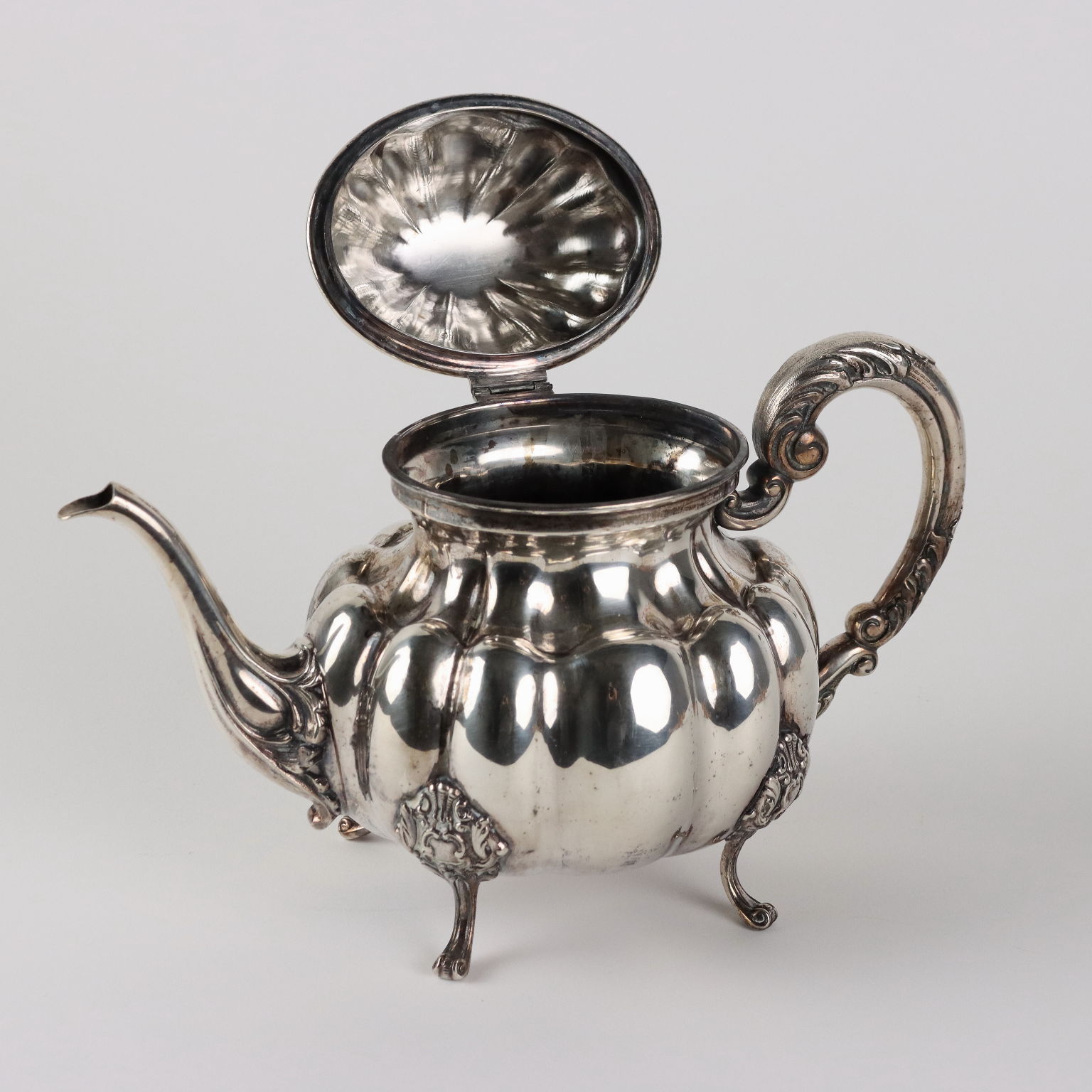Teiera in argento baccellato e cesellato. Manico, beccuccio e piedini a volute fogliacce. Presa del coperchio a bocciolo. Marchi dell'argento incussi sotto la base. Argentiere non identificato. Grammi 900.