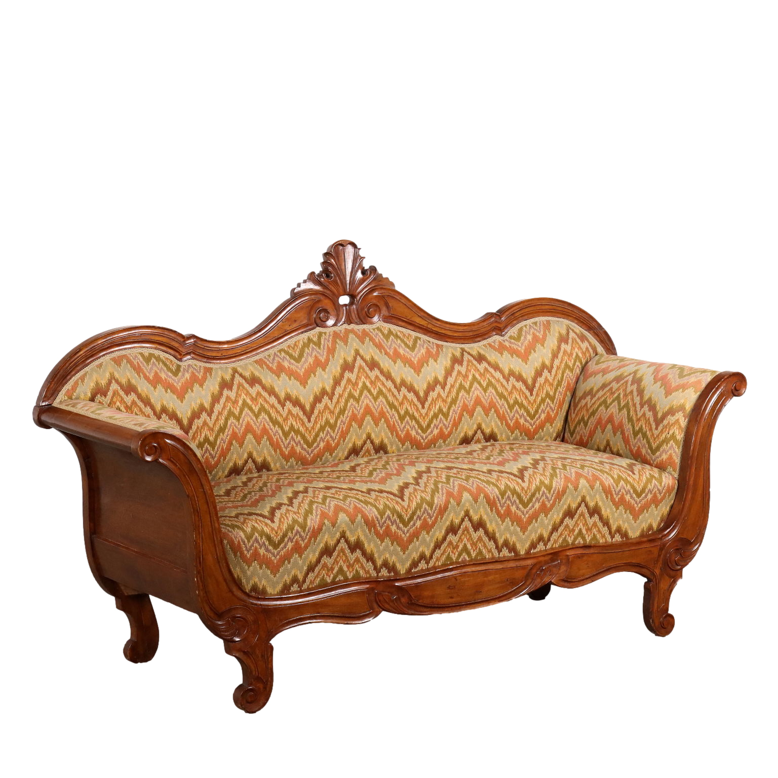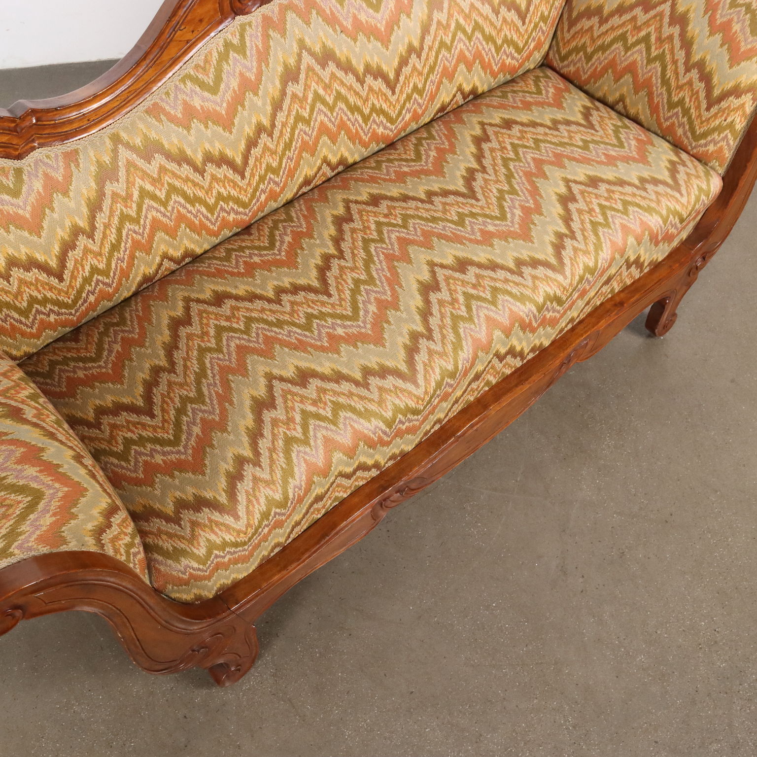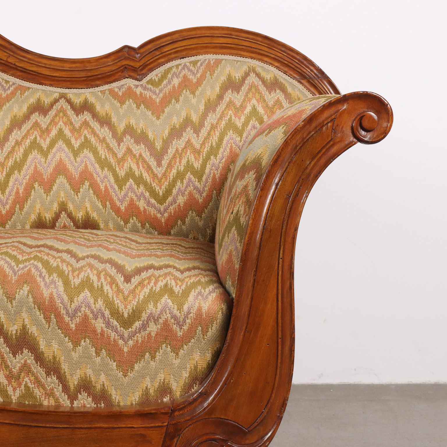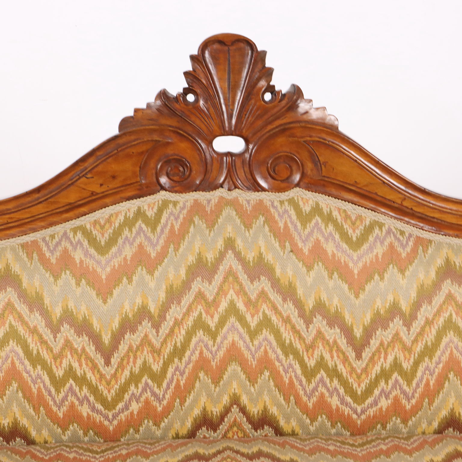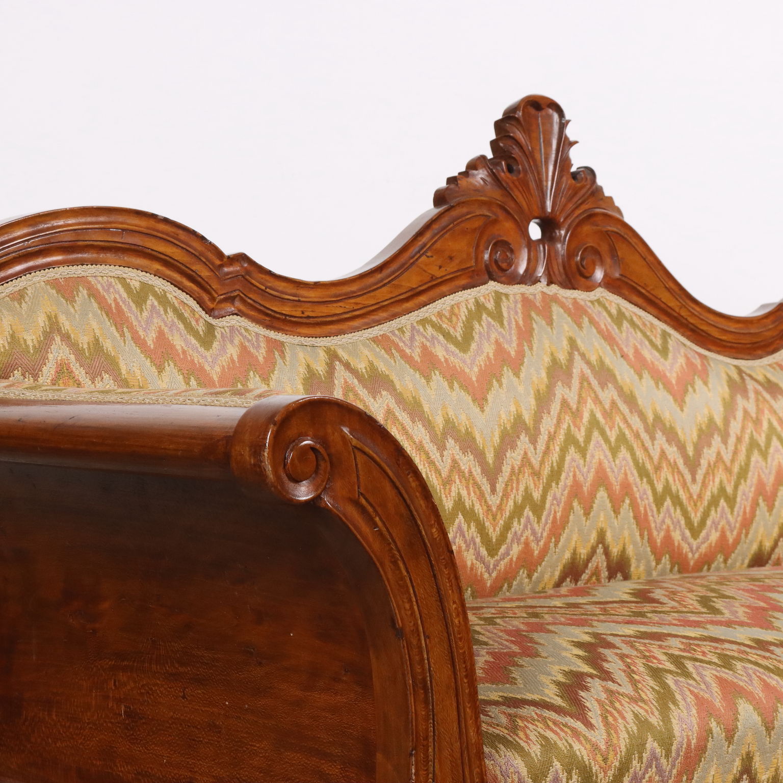 Divano Luigi Filippo in faggio tinto noce, intagli a volute e riccioli culminanti con cimasa a intaglio fogliaceo. Seduta, schienale e fianchi imbottiti. Italia, metà XIX Secolo.