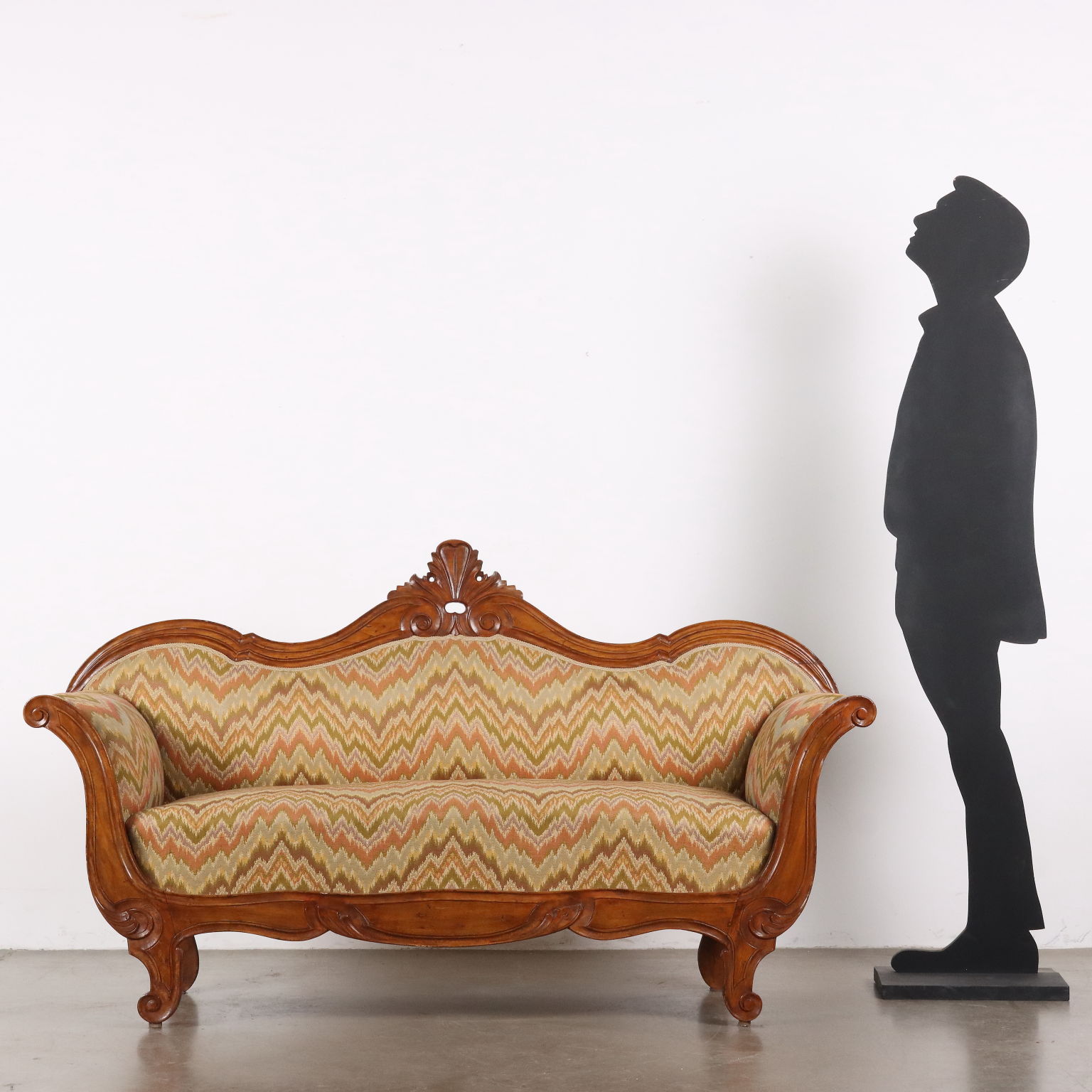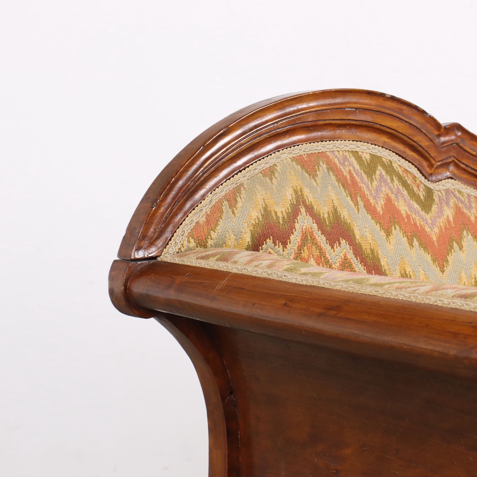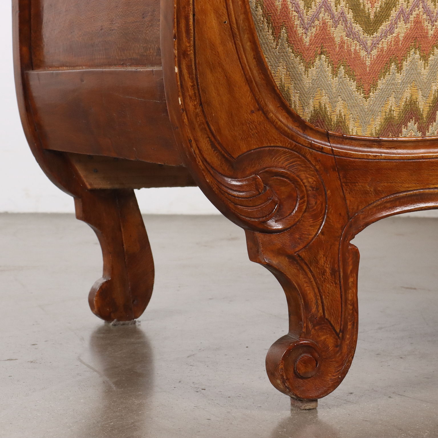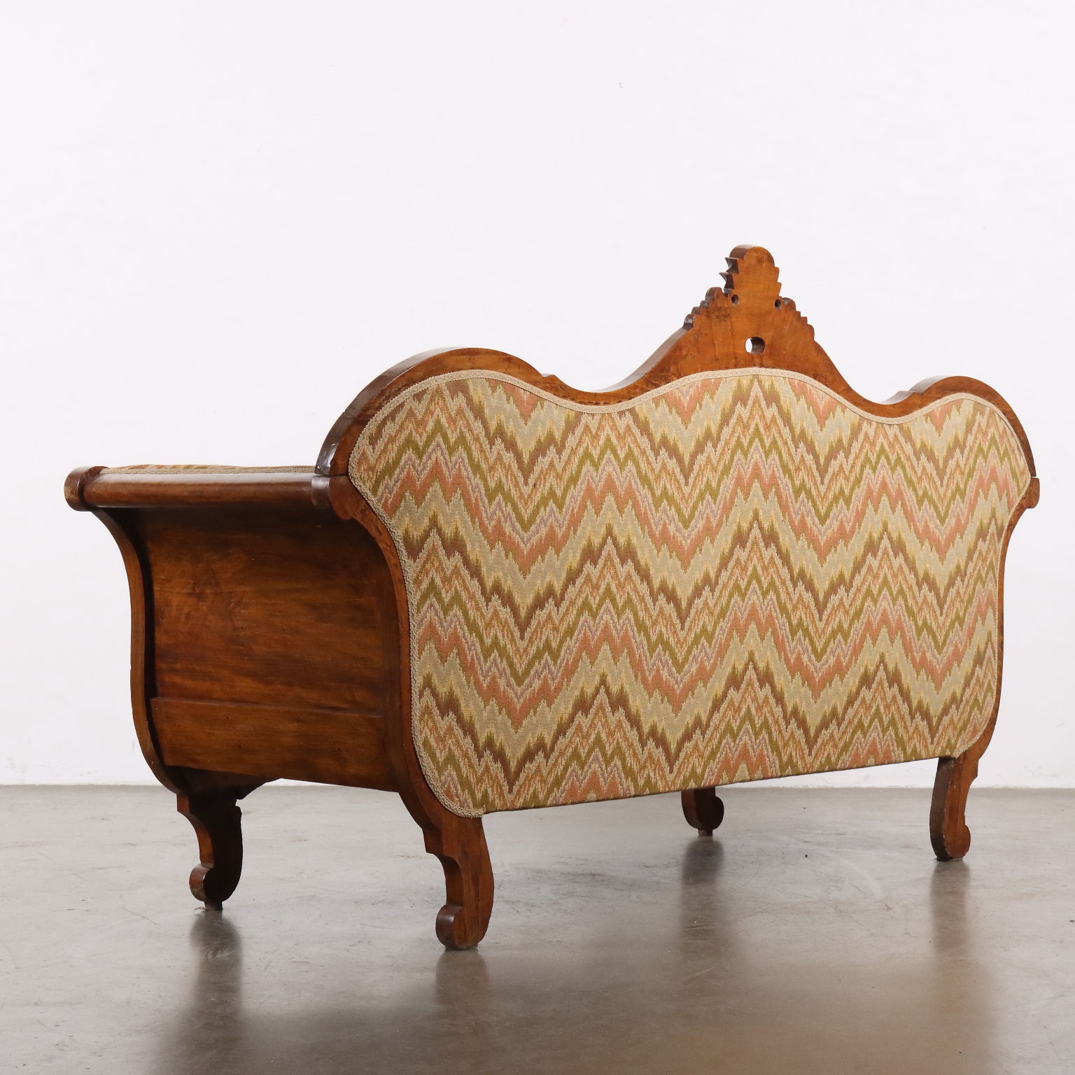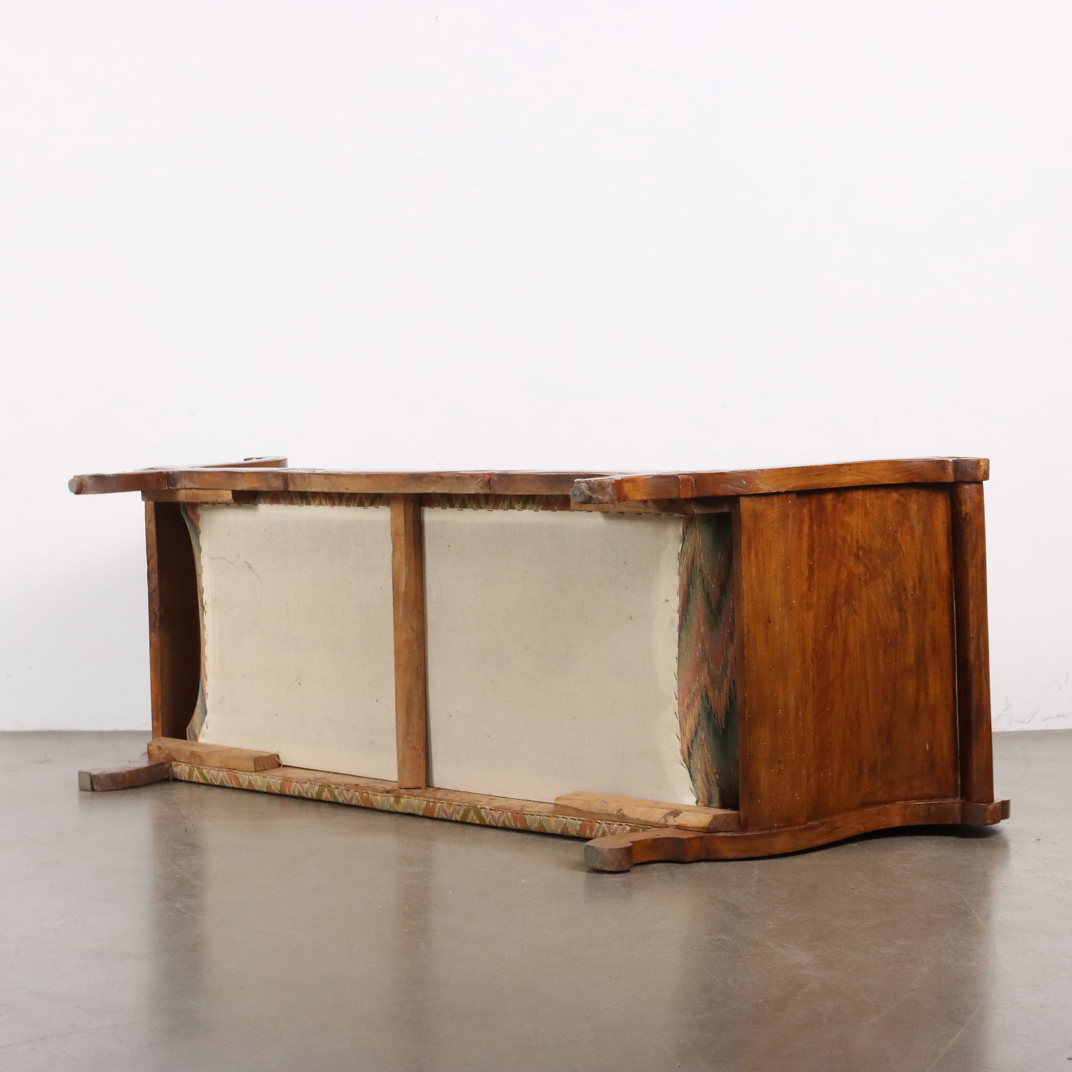 Divano Luigi Filippo in faggio tinto noce, intagli a volute e riccioli culminanti con cimasa a intaglio fogliaceo. Seduta, schienale e fianchi imbottiti. Italia, metà XIX Secolo.