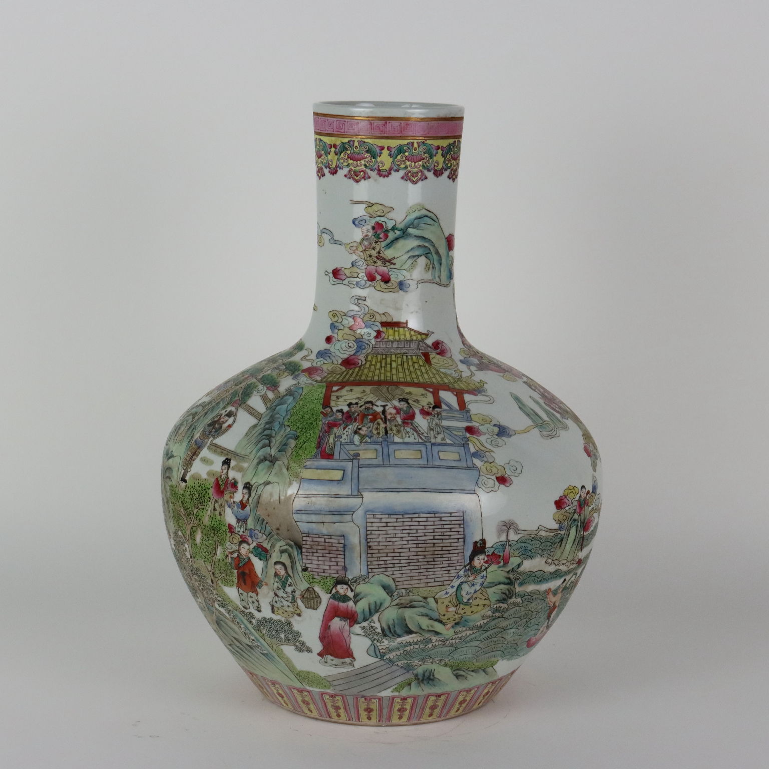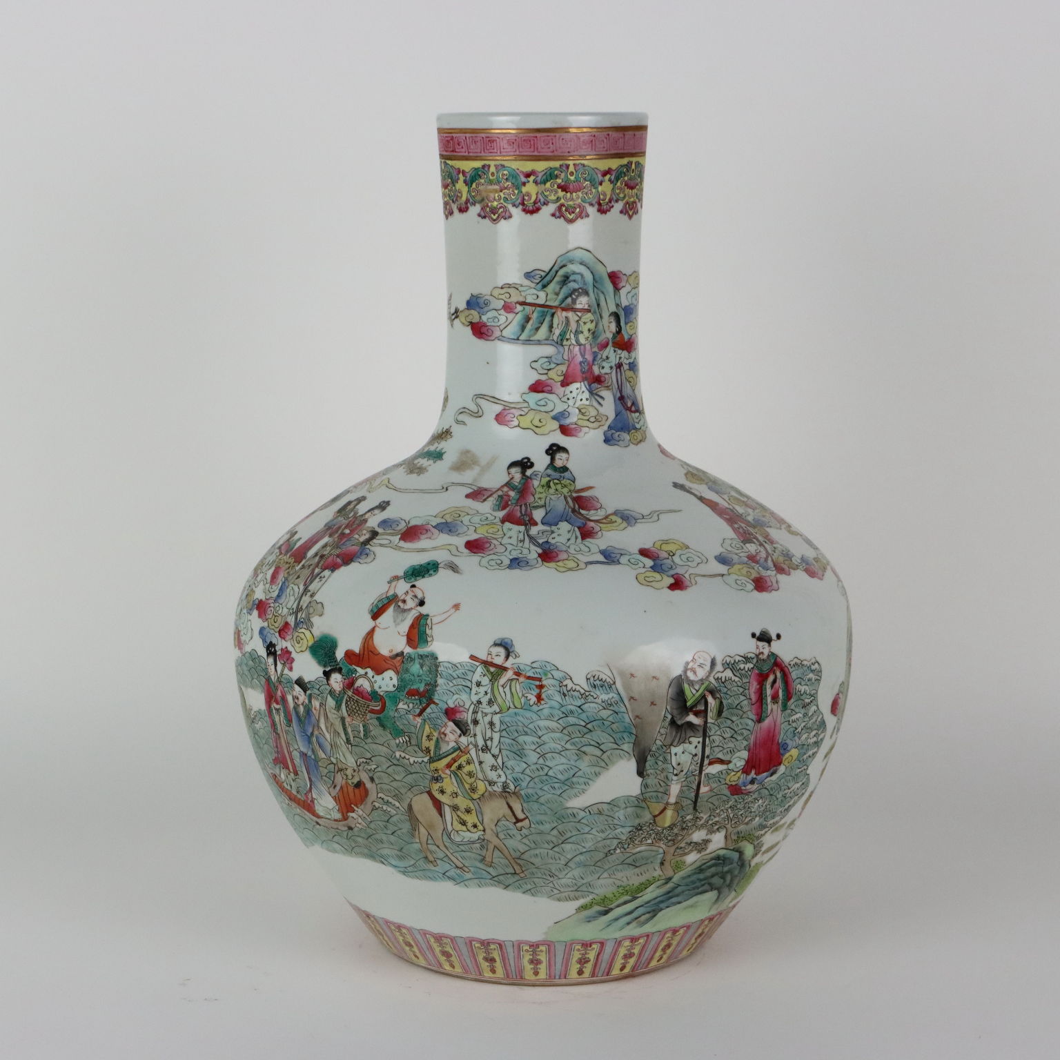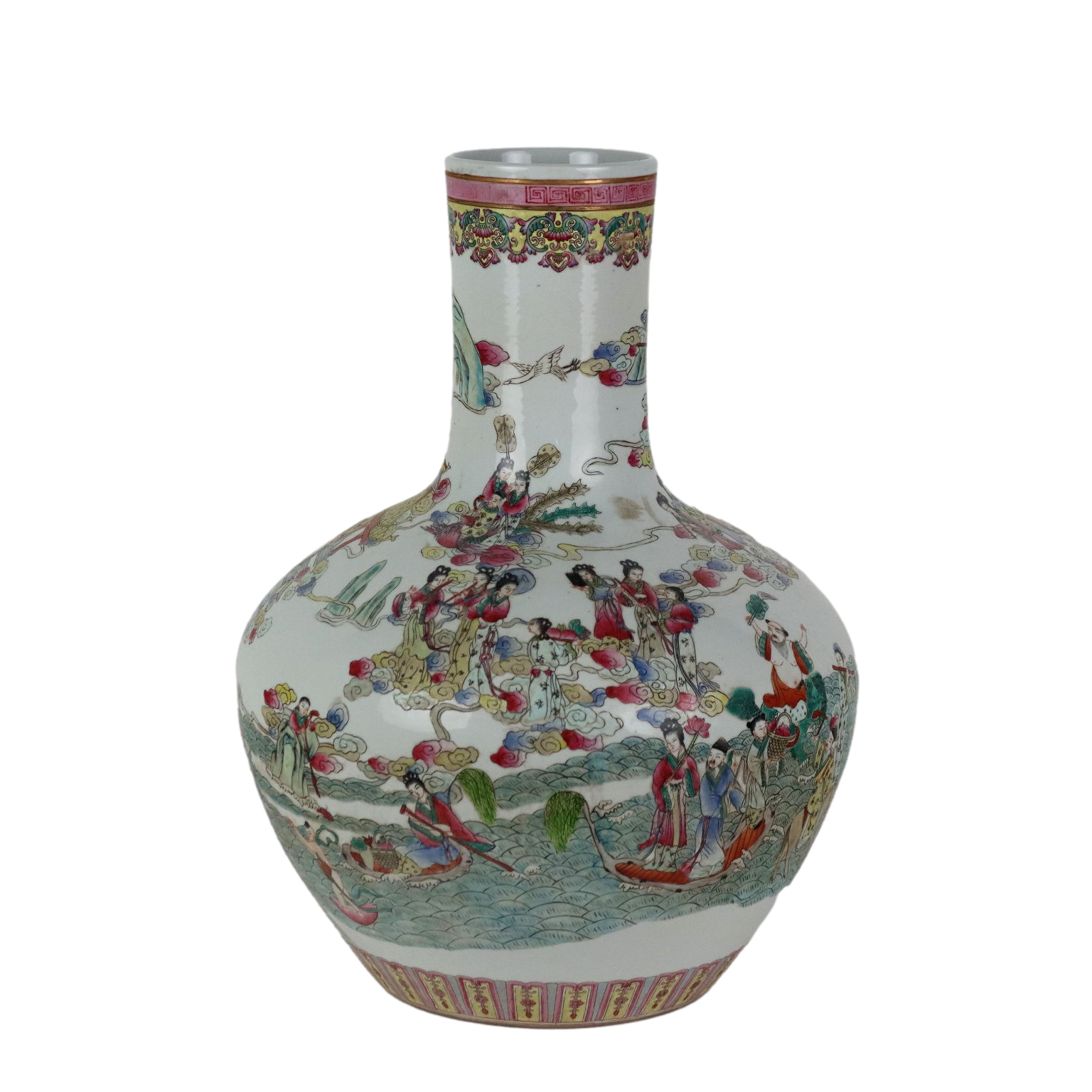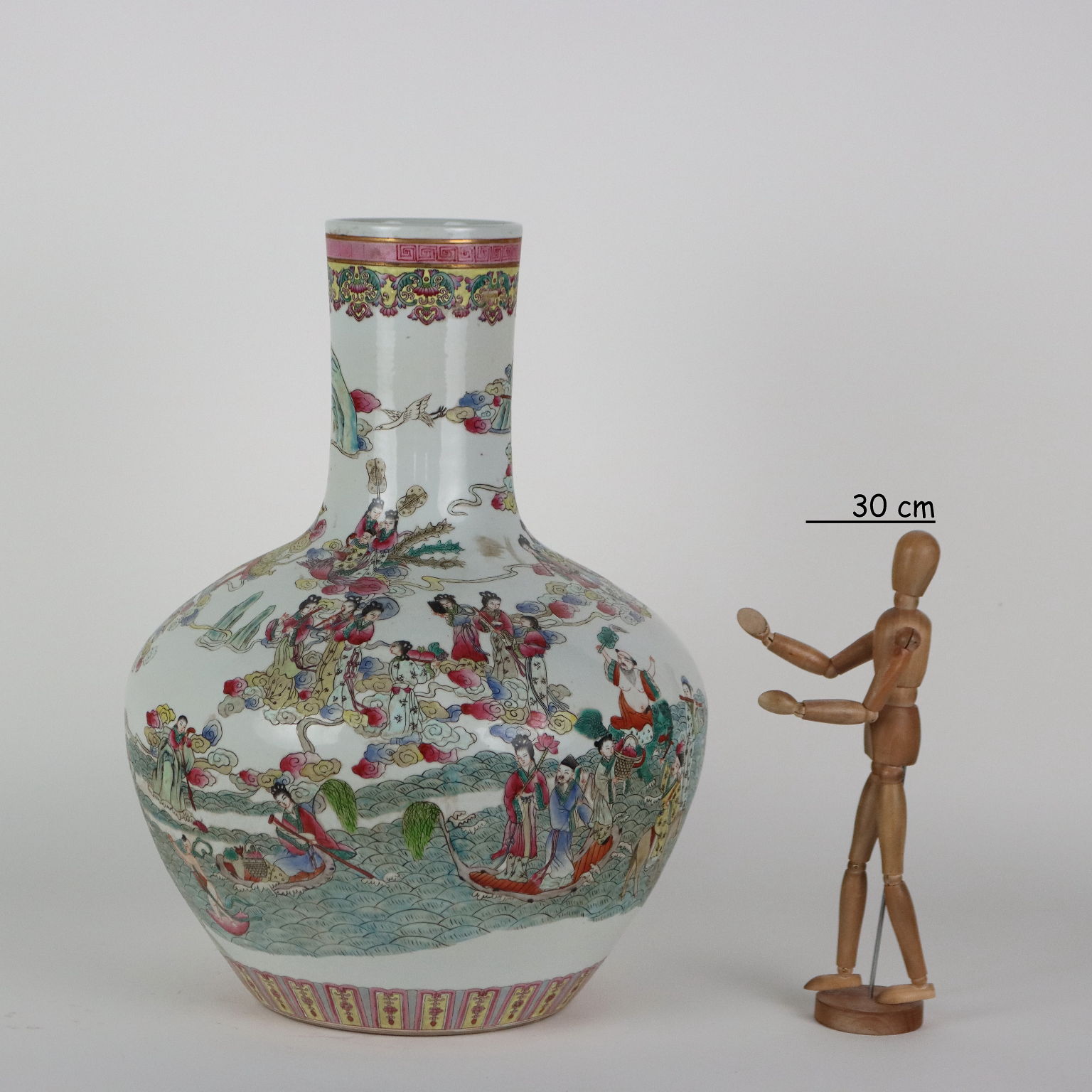 Vaso tianqiuping decorato con scena celestiale di immortali cinesi in un castello circondati dai loro accoliti. Marchio apocrifo Qianlong sotto la base.