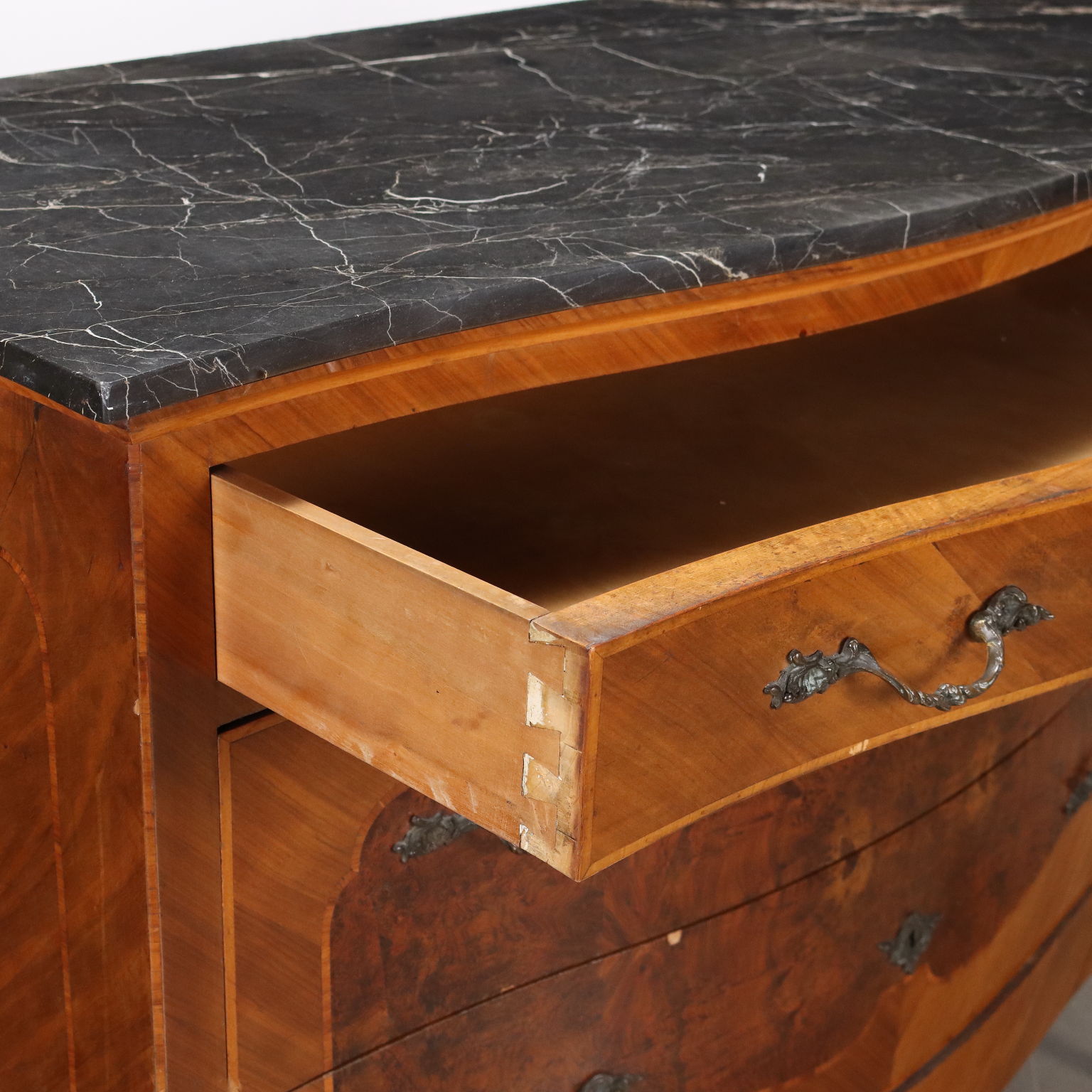 Cassettone in stile barocchetto, impiallacciato in noce, piuma e radica di noce, filettature in acero. Fronte mosso a tre cassetti, maniglie e bocchette in bronzo, piano in marmo nero. Italia, inizio XX Secolo.
