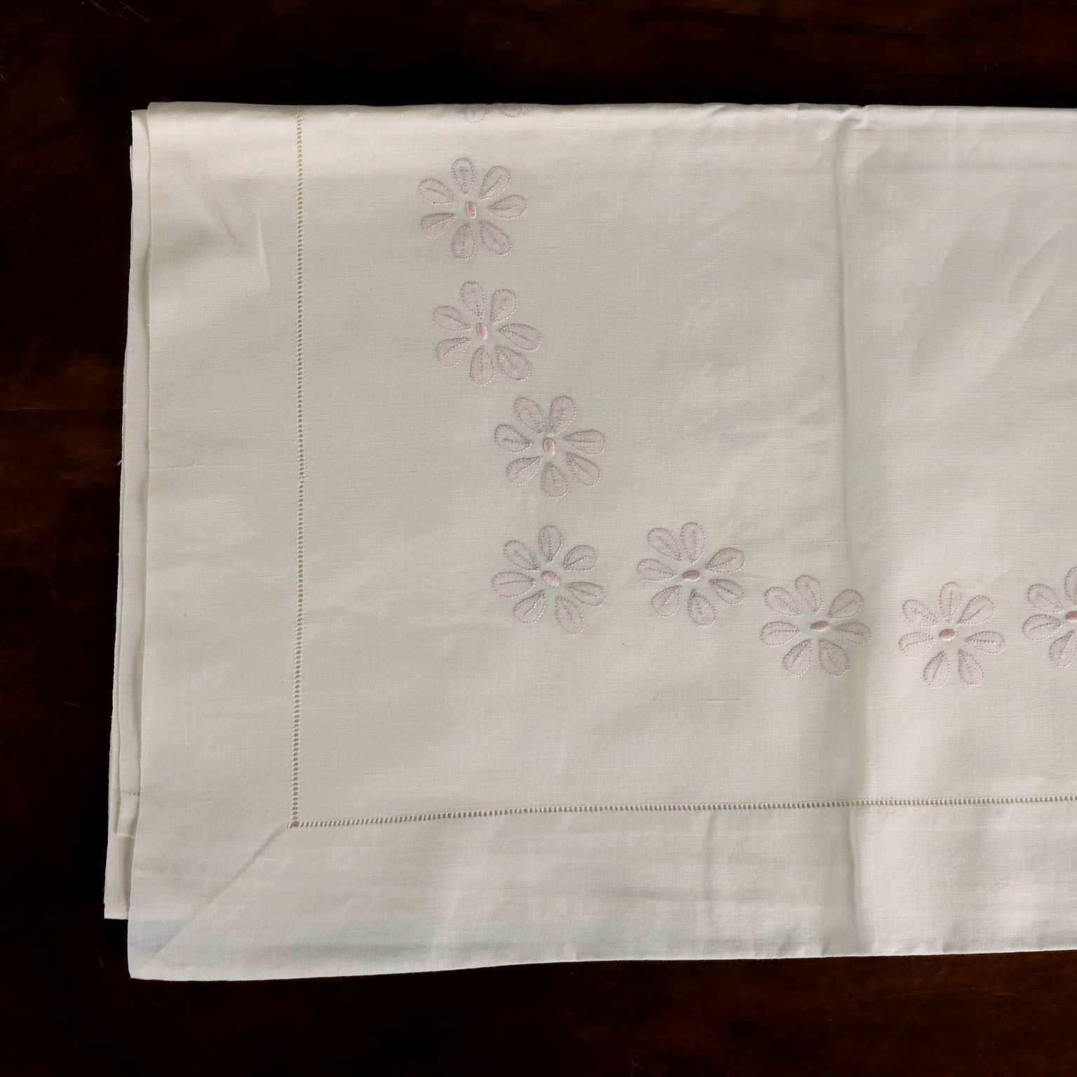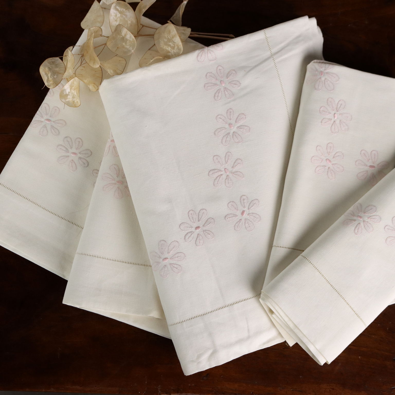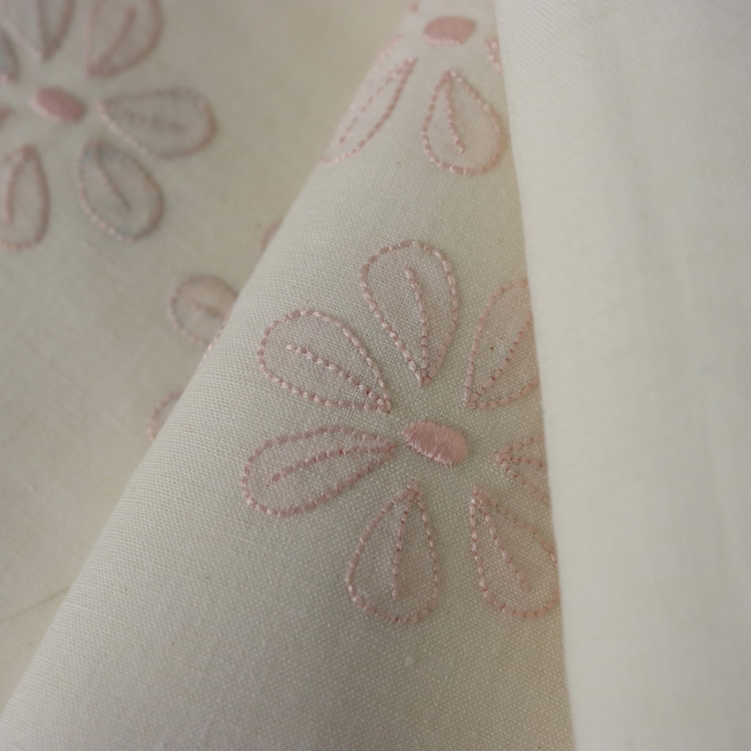 Lenzuolo matrimoniale con due federe. Lavorazione dei fiori a punto ombra di colore rosa antico.