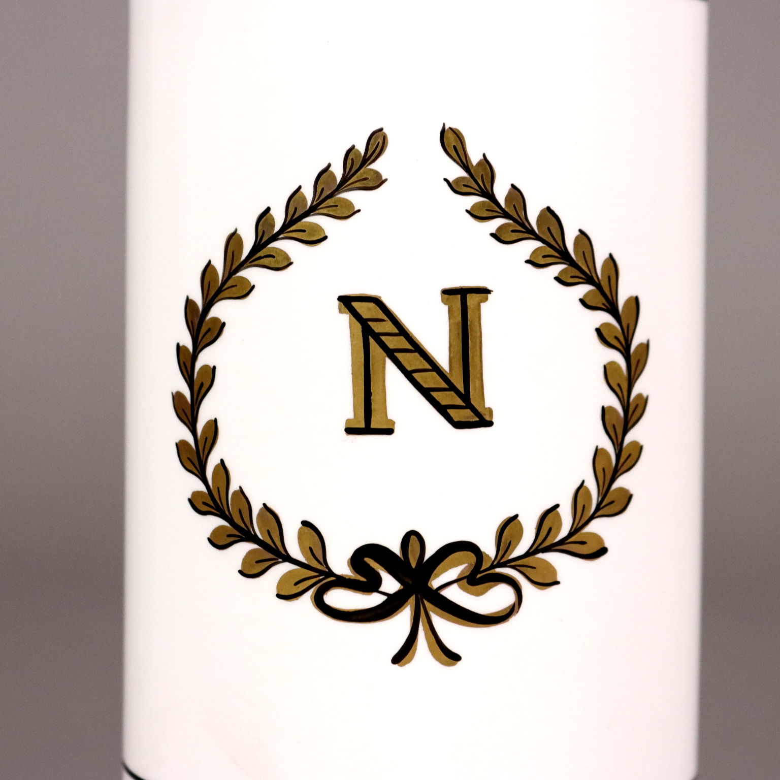 Lampada ad olio Impero, trasformata in lampada da tavolo, ceramica dipinta e metallo dorato e lavorato a motivi fogliacei e volute. Italia, fine XIX Secolo.
