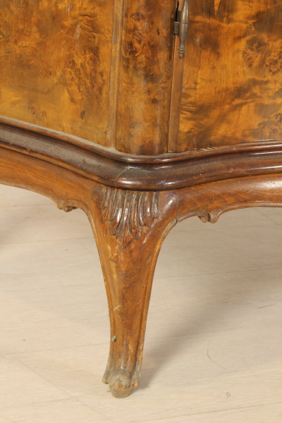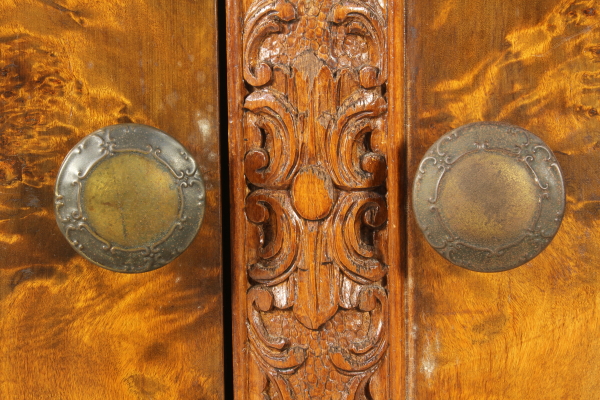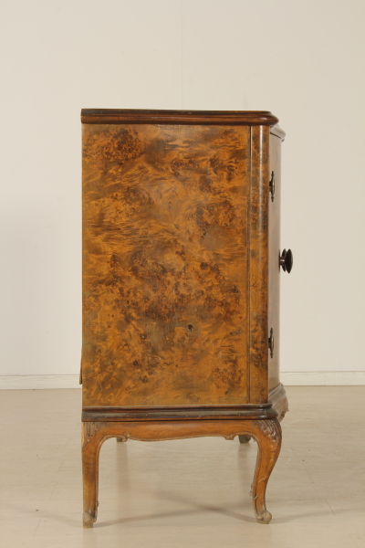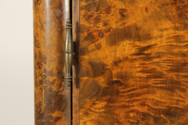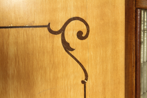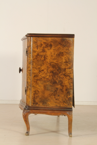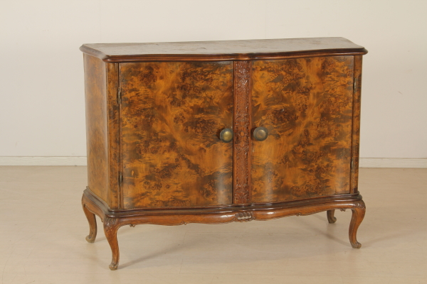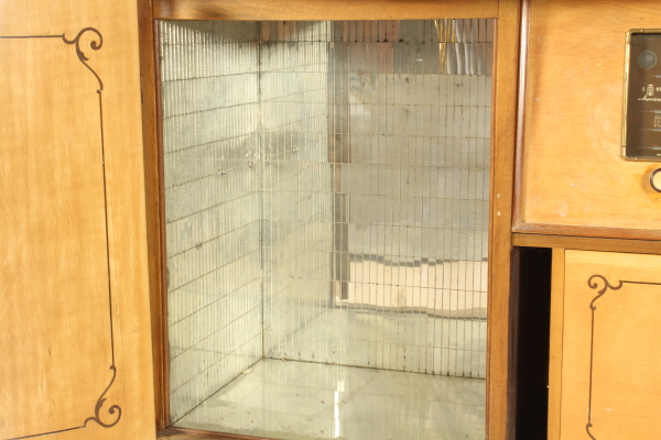 Mobile radio mosso con piedi intagliati e due ante celano a sinistra vano bar rivestito in specchi con sistema d'illuminazione, a destra vano contenente radio "Magnadyne mod. S89" e giradischi Philips. Interno in acero con intarsi.