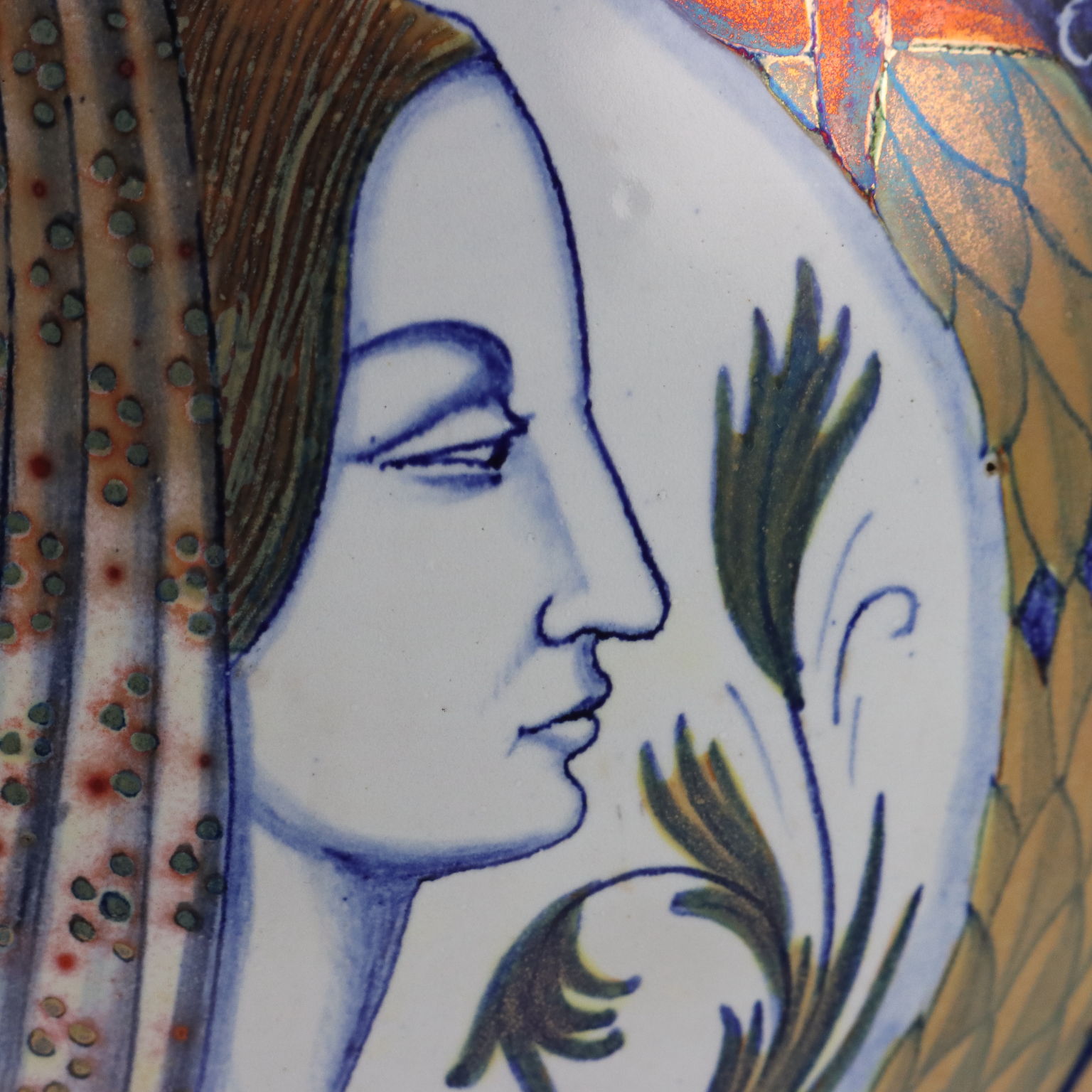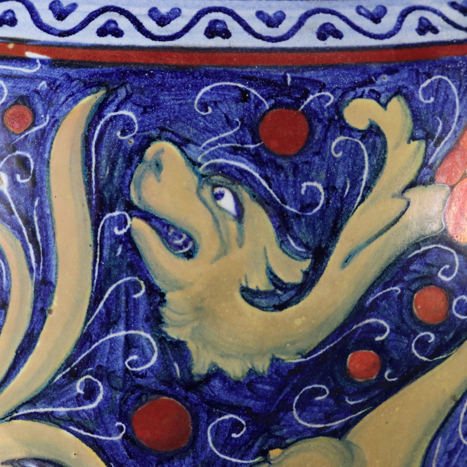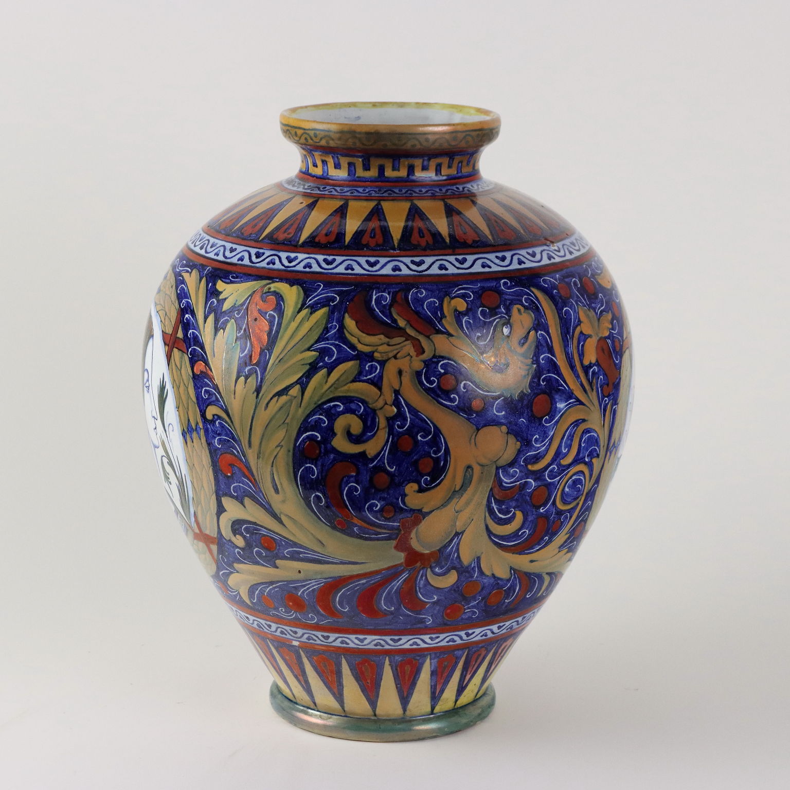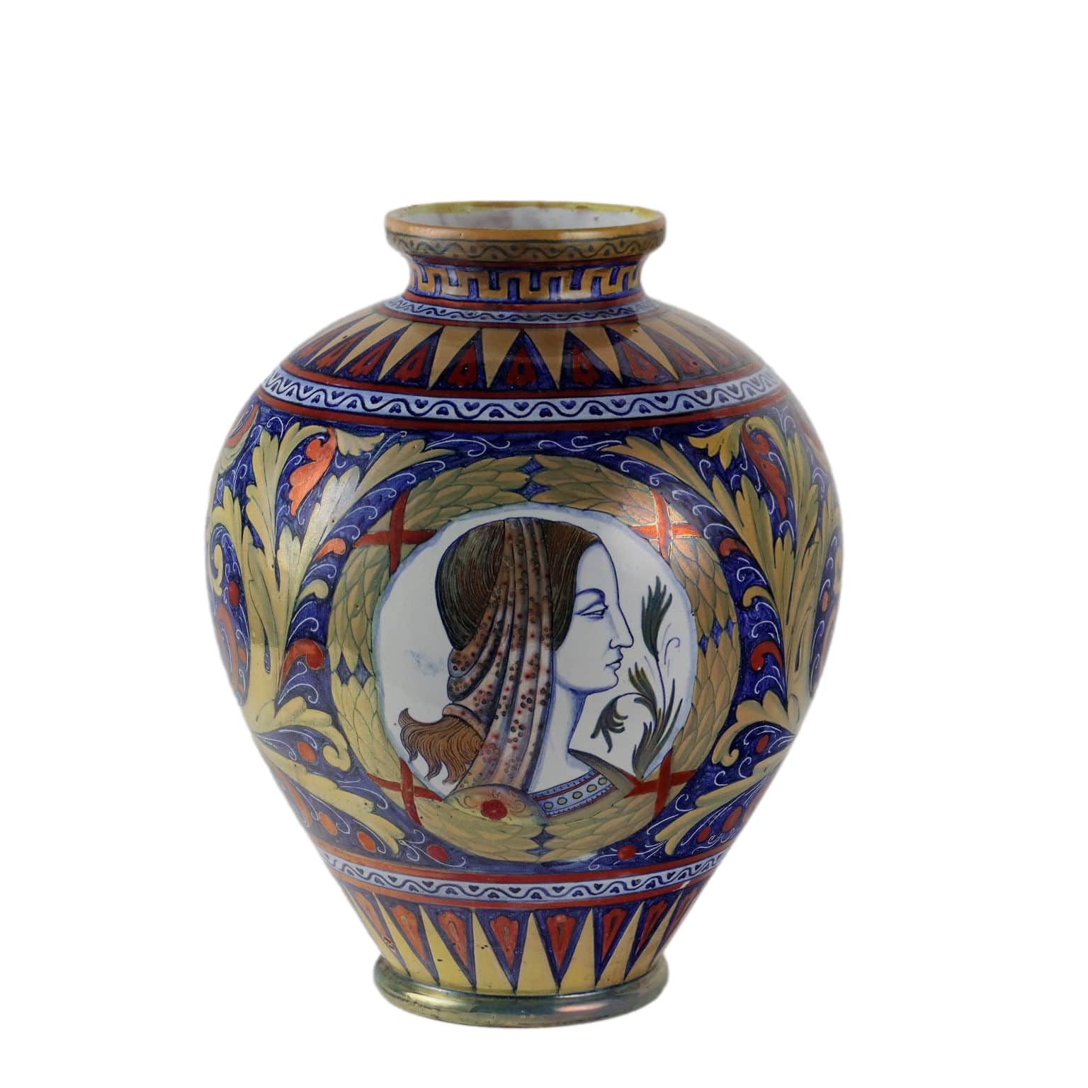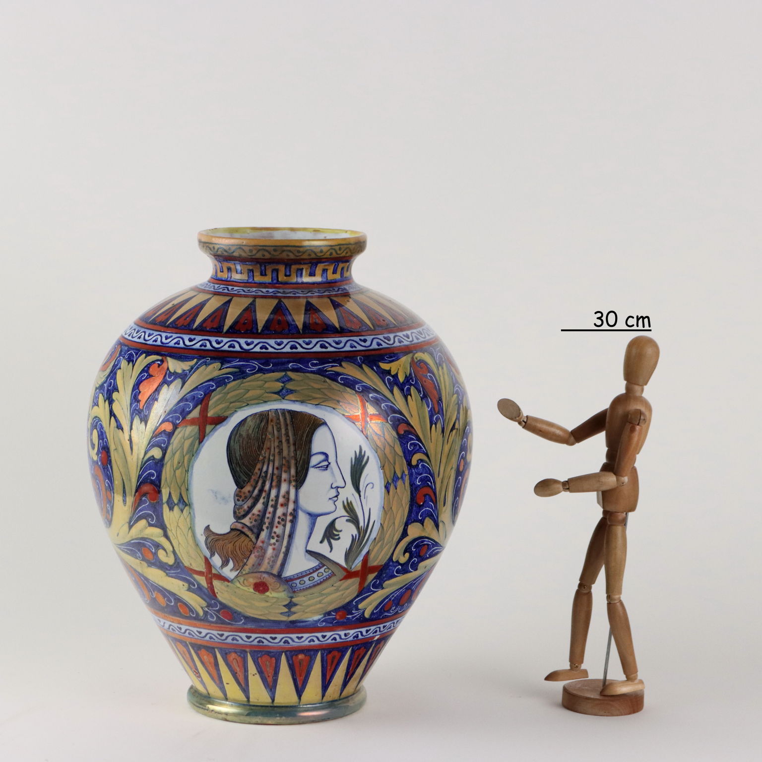 Vaso in maiolica a lustro a corpo globulare. Presenta al centro del corpo medaglioni con ritratti gentilizi contornati da racemi vegetali e grifoni alati. Sotto la base marchio della manifattura.