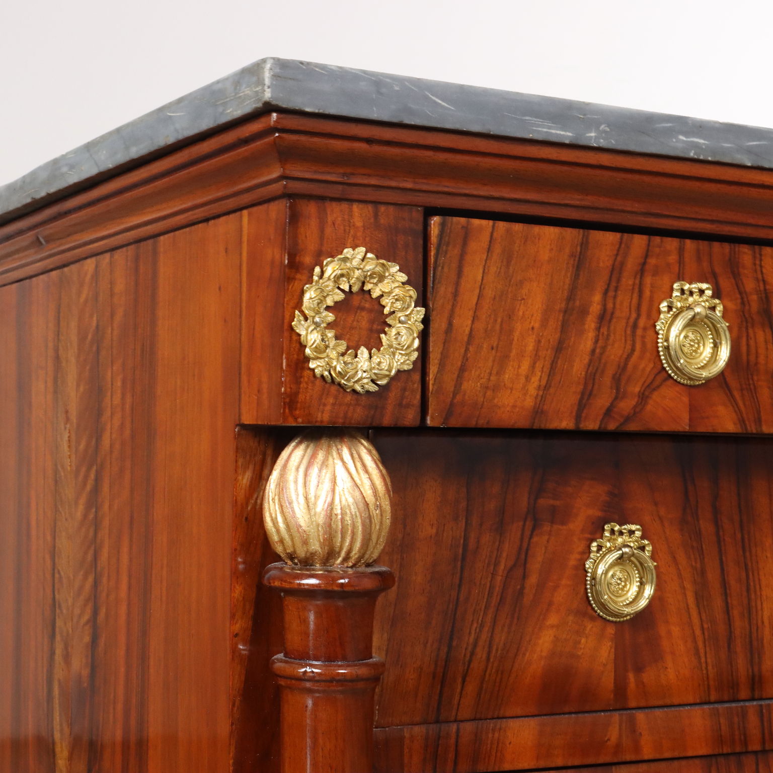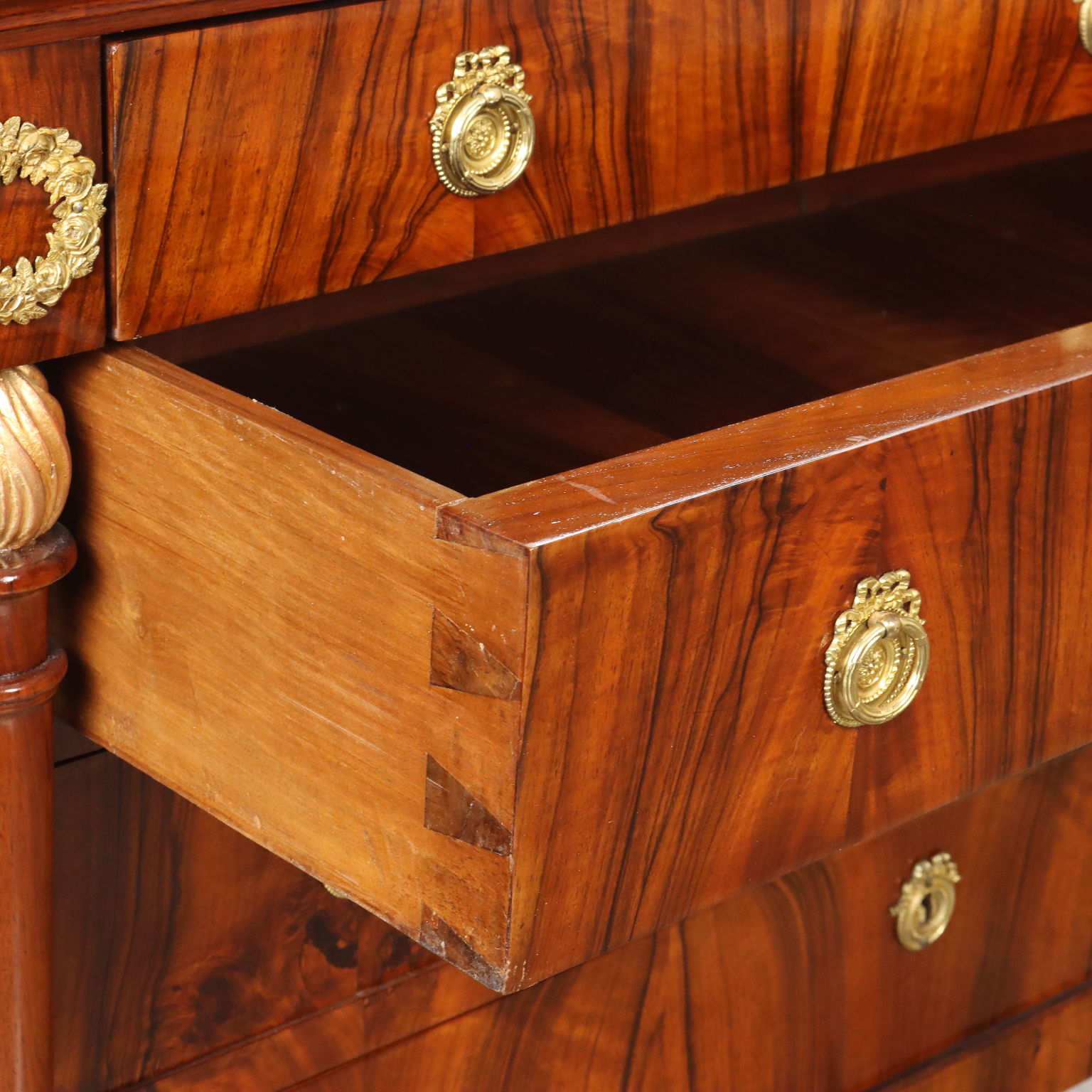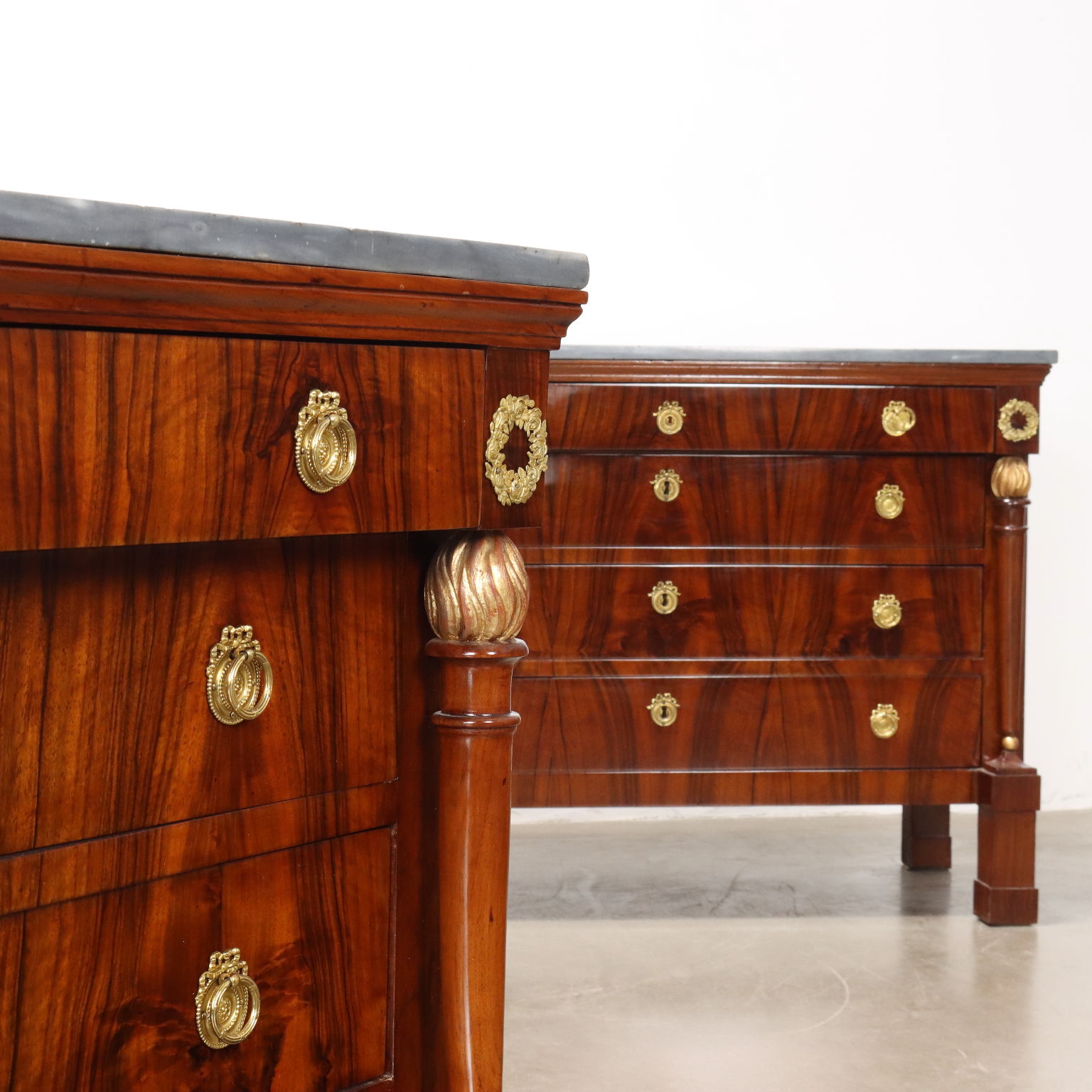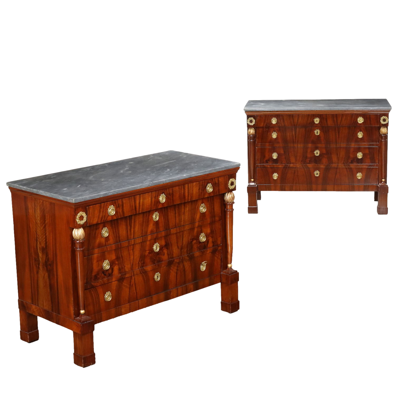 Coppia di comò del periodo Impero, in noce lastronati in noce rigatino fiammato, presentano sul fronte quattro cassetti di cui il primo sotto piano aggettante, poggiante sui montanti composti da fiaccola tornita e intagliata in noce con la fiamma dorata e poggianti su piedi a plinti quadrato; applicazioni in bronzo cesellato e dorato, piani in marmo grigio bardiglio. Interni in noce.