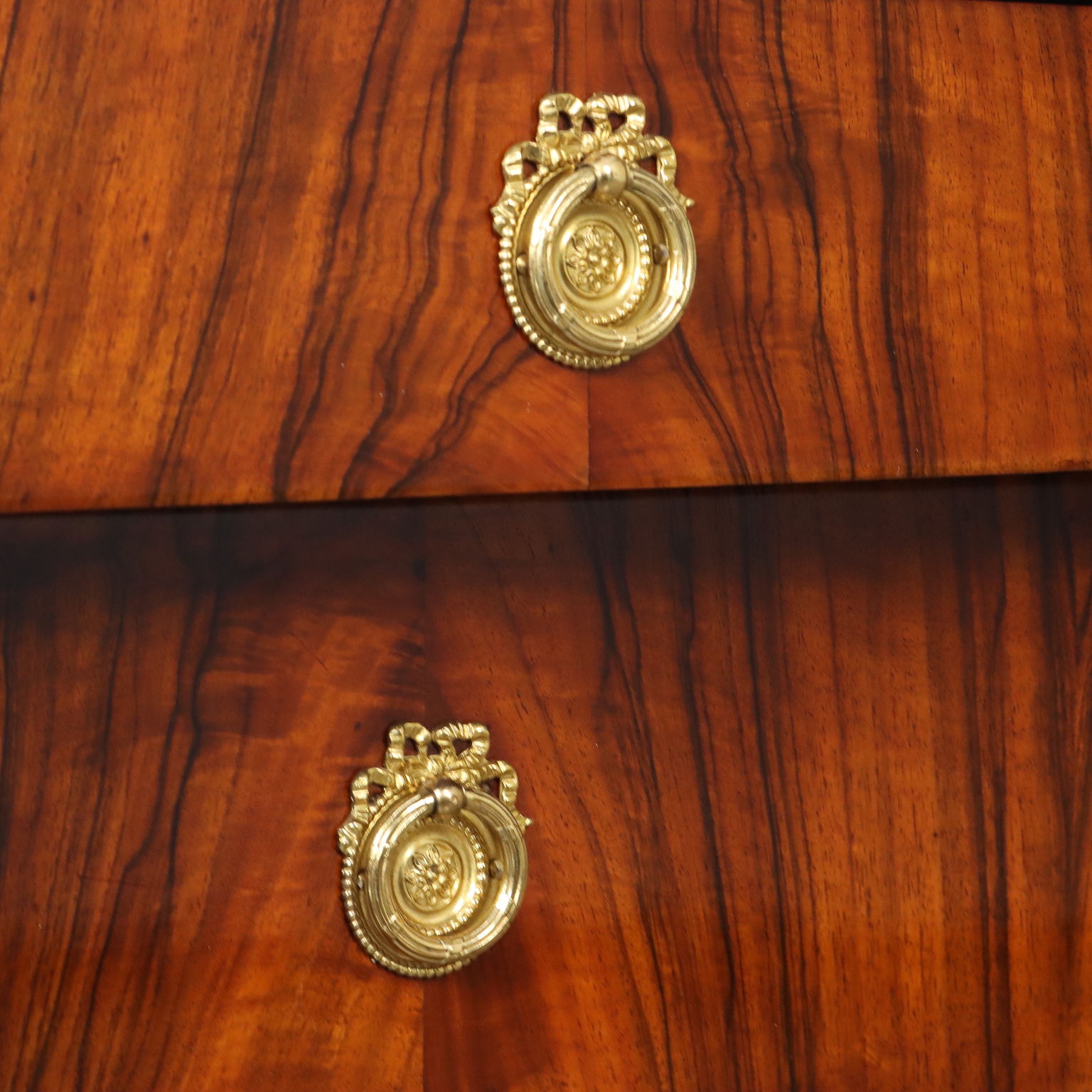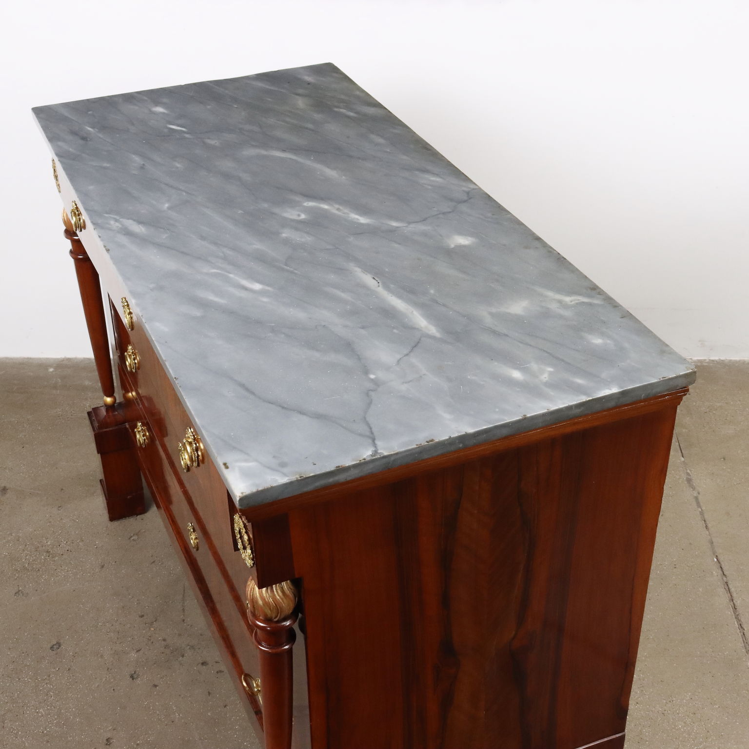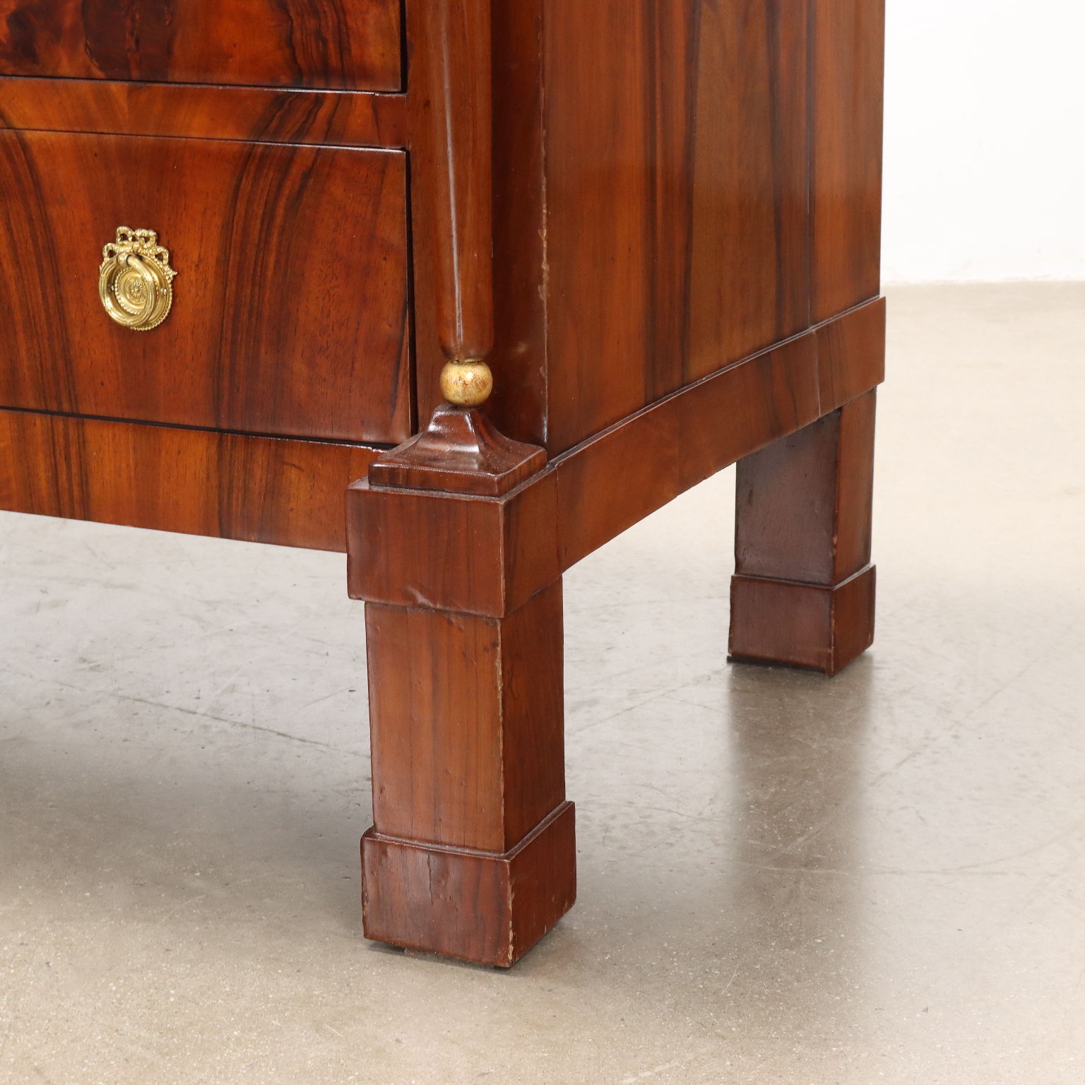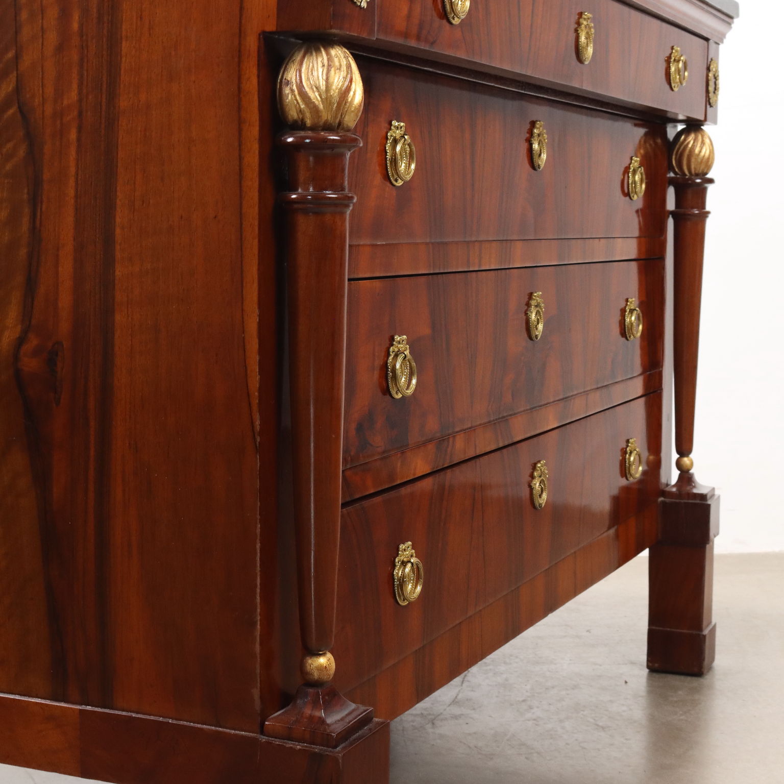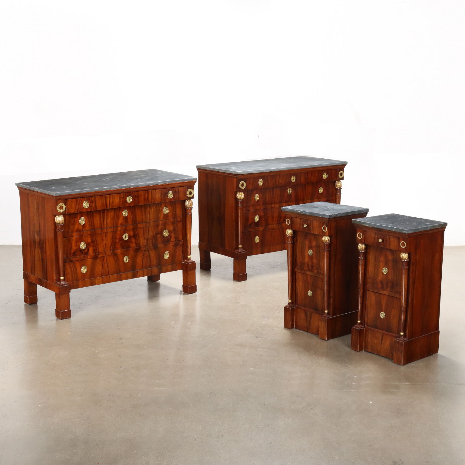 Coppia di comò del periodo Impero, in noce lastronati in noce rigatino fiammato, presentano sul fronte quattro cassetti di cui il primo sotto piano aggettante, poggiante sui montanti composti da fiaccola tornita e intagliata in noce con la fiamma dorata e poggianti su piedi a plinti quadrato; applicazioni in bronzo cesellato e dorato, piani in marmo grigio bardiglio. Interni in noce.