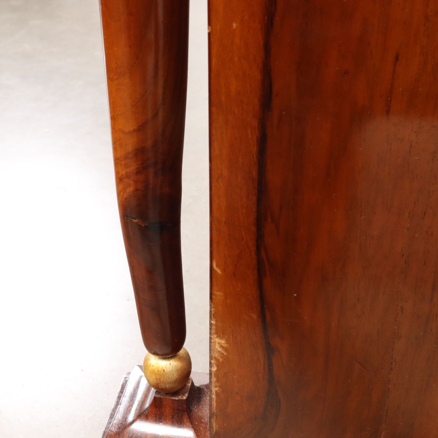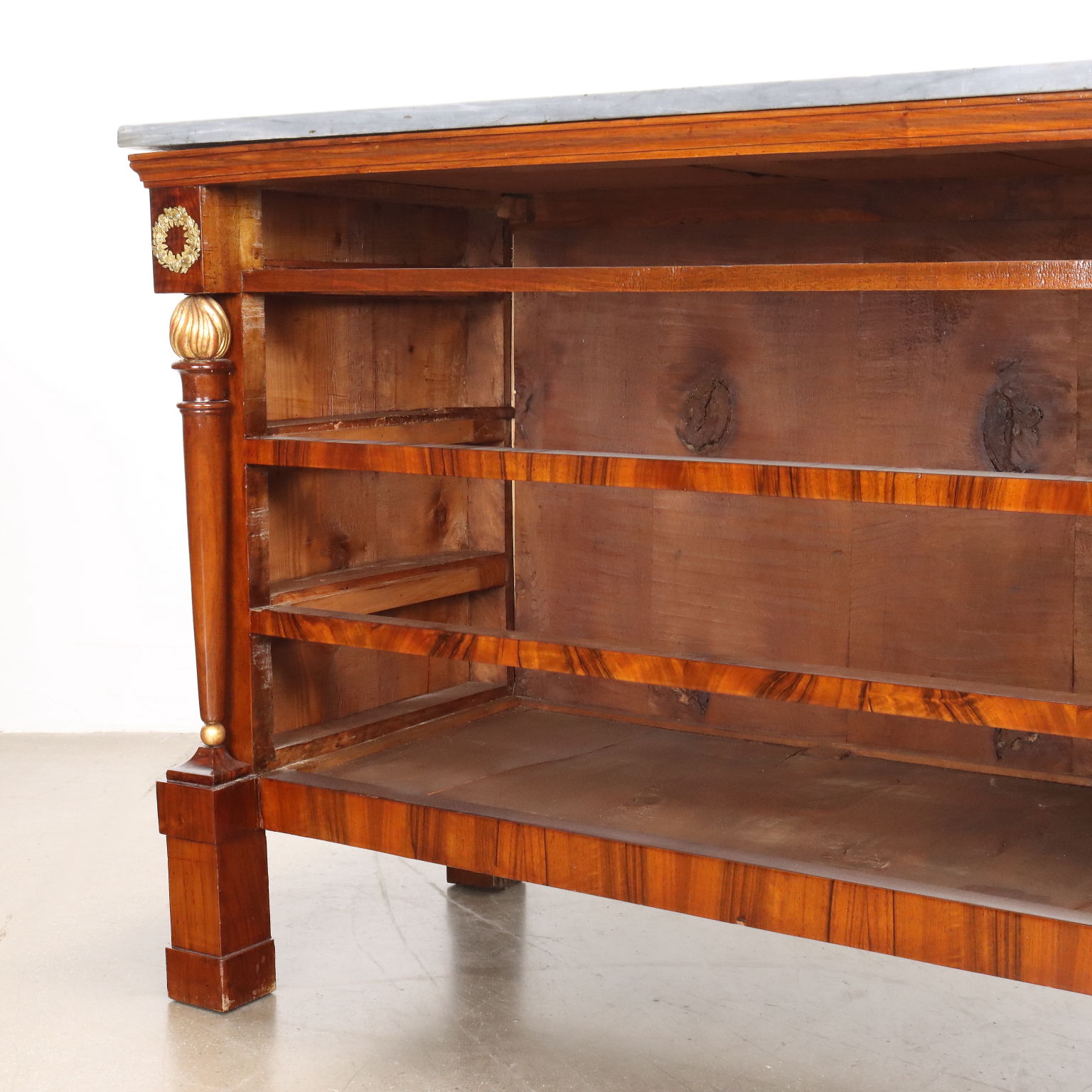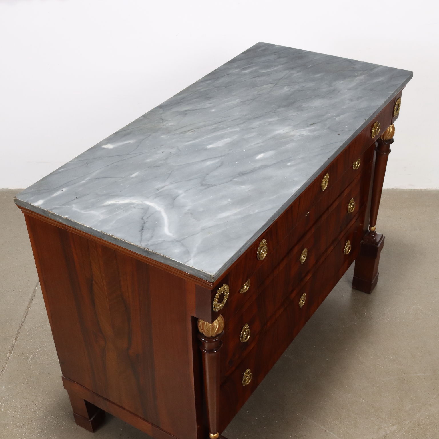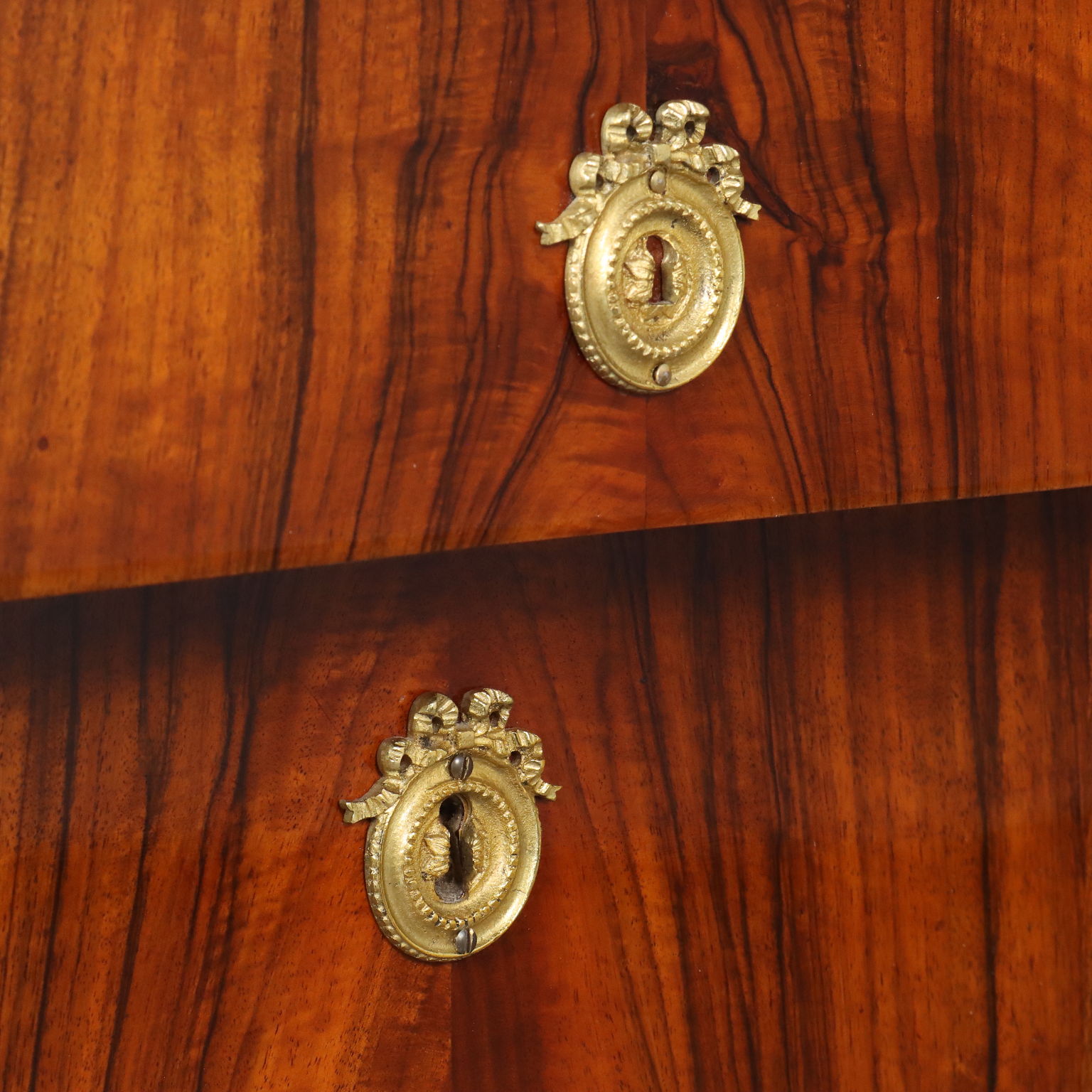Coppia di comò del periodo Impero, in noce lastronati in noce rigatino fiammato, presentano sul fronte quattro cassetti di cui il primo sotto piano aggettante, poggiante sui montanti composti da fiaccola tornita e intagliata in noce con la fiamma dorata e poggianti su piedi a plinti quadrato; applicazioni in bronzo cesellato e dorato, piani in marmo grigio bardiglio. Interni in noce.