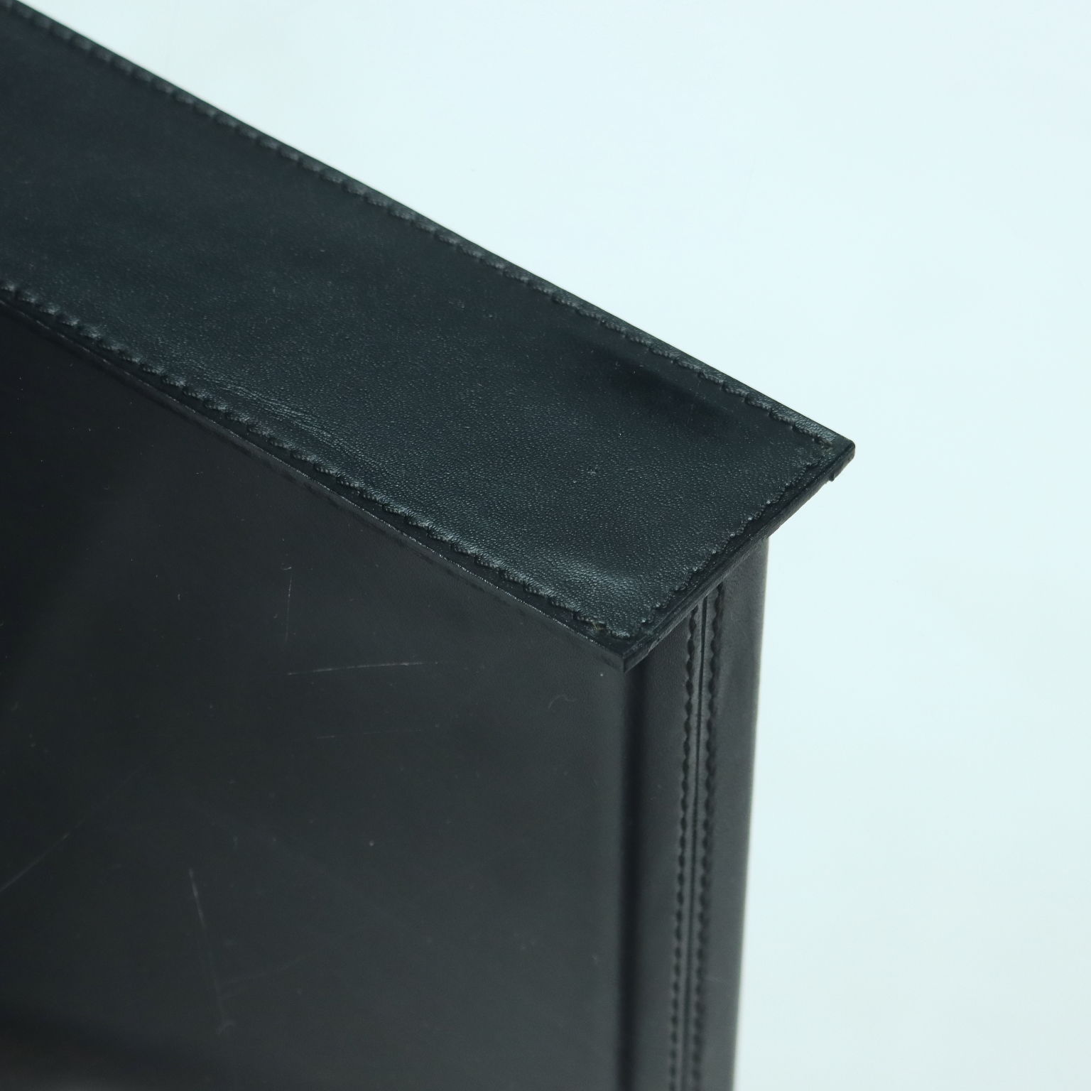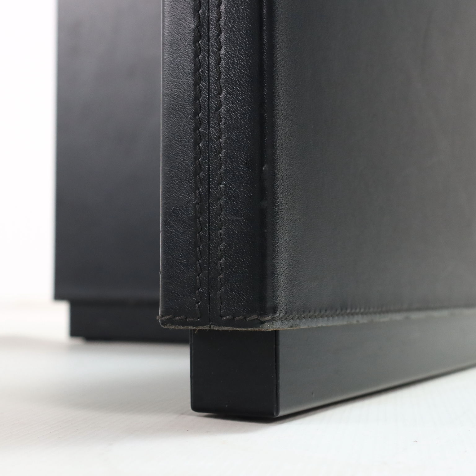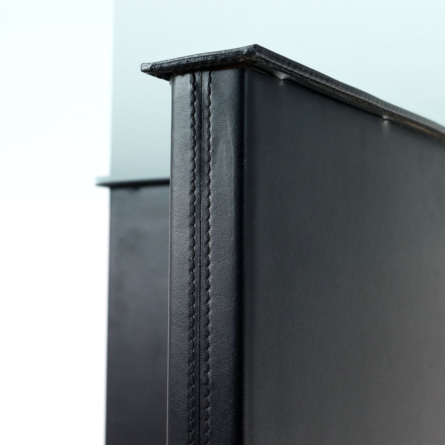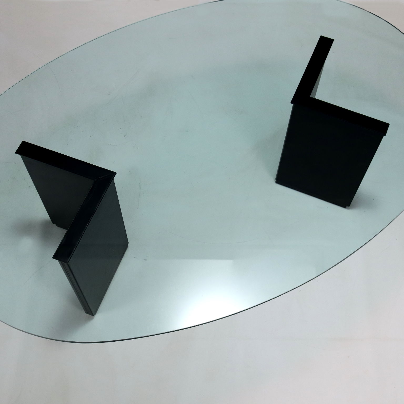 Tavolo dalla forma ellittica, base in metallo ricoperto in pelle, piano in vetro trasparente.
