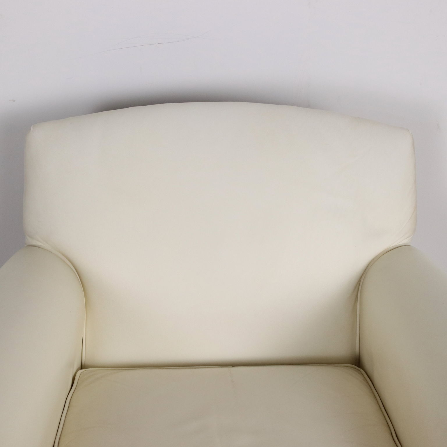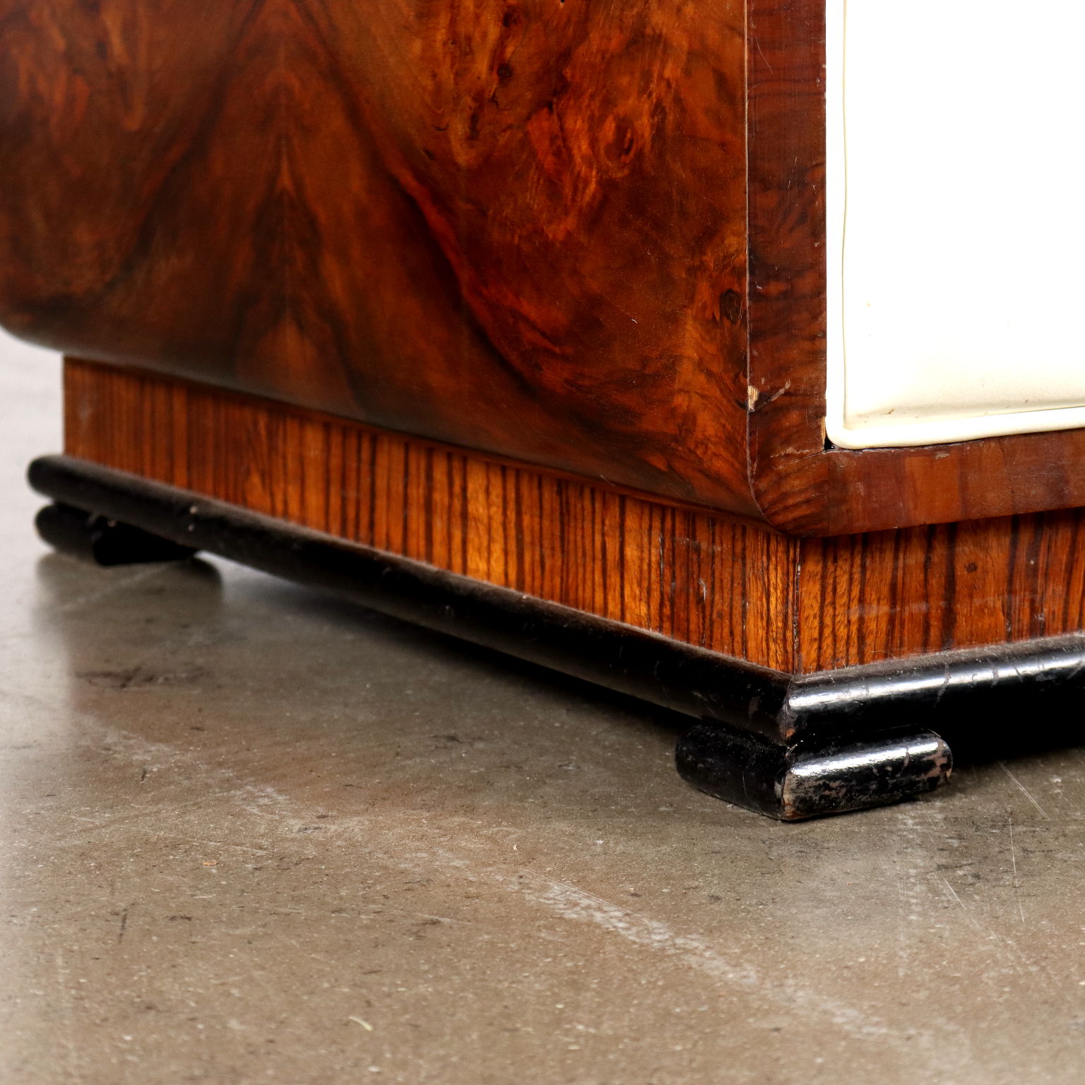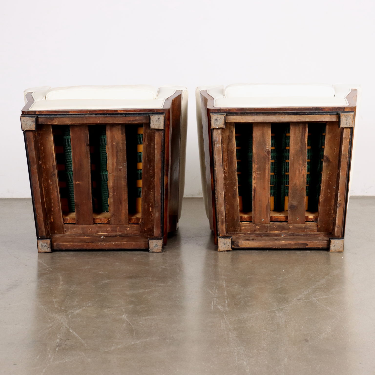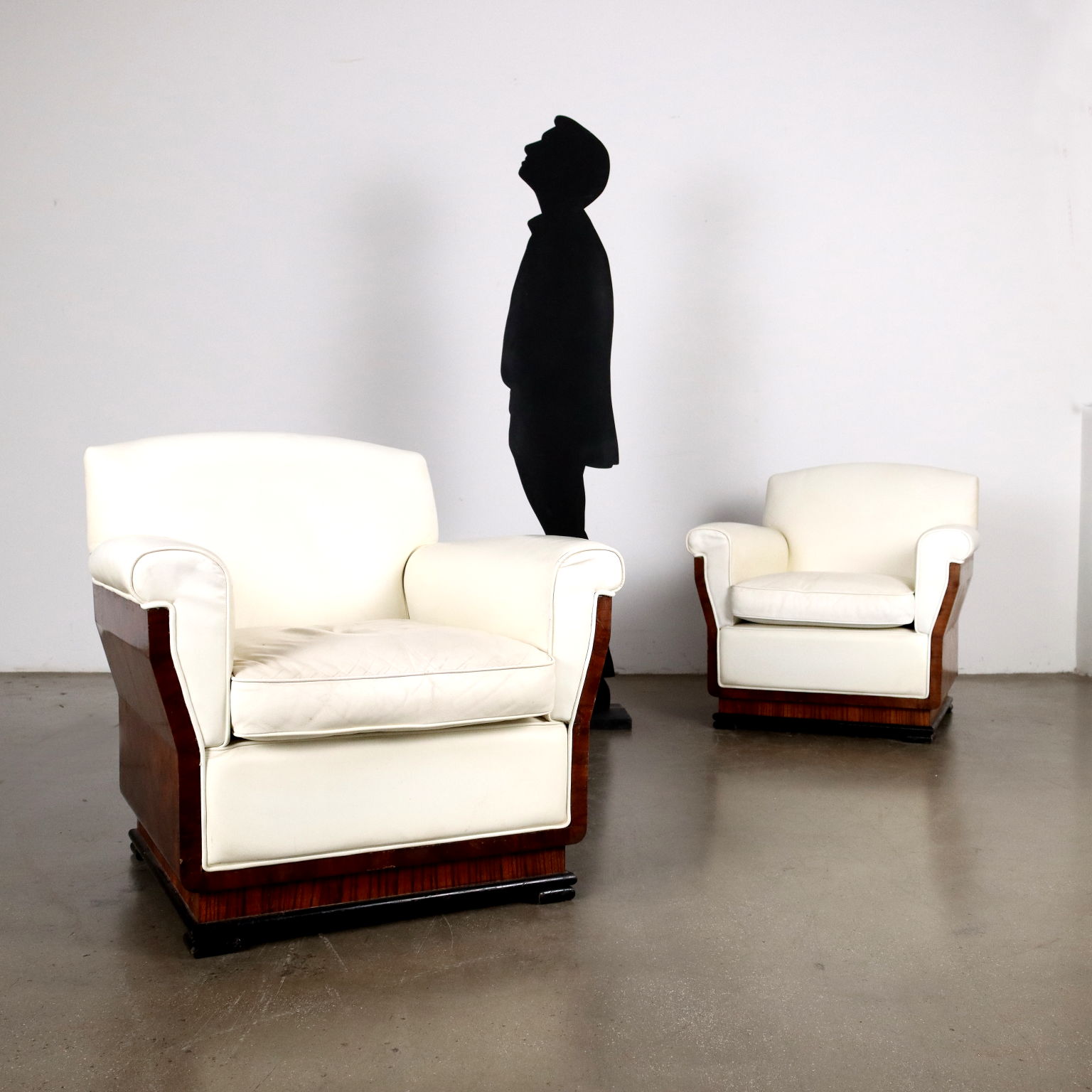 Poltrone con elegante struttura in legno impiallacciato radica, imbottitura in espanso e rivestimento in pelle, non originali del periodo.