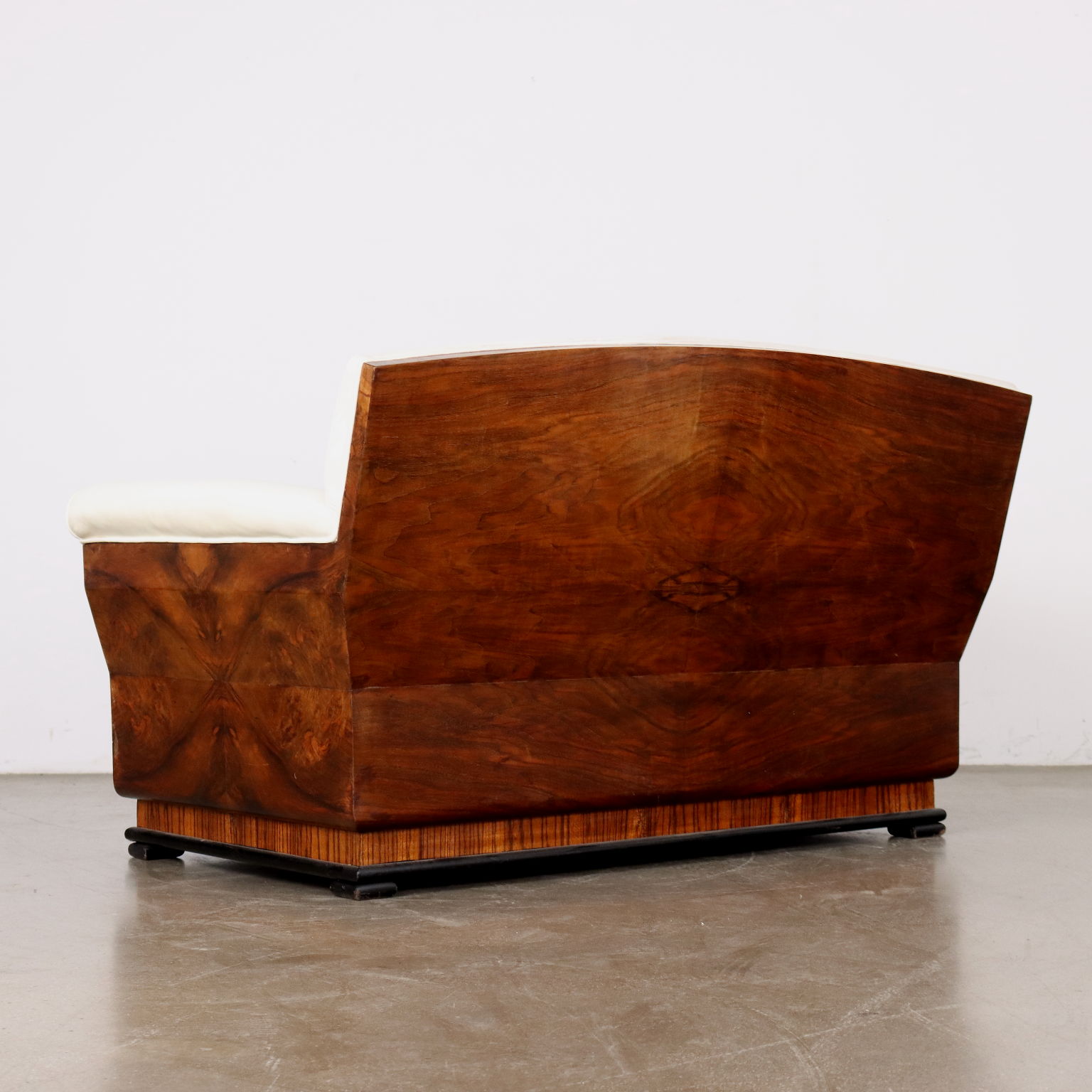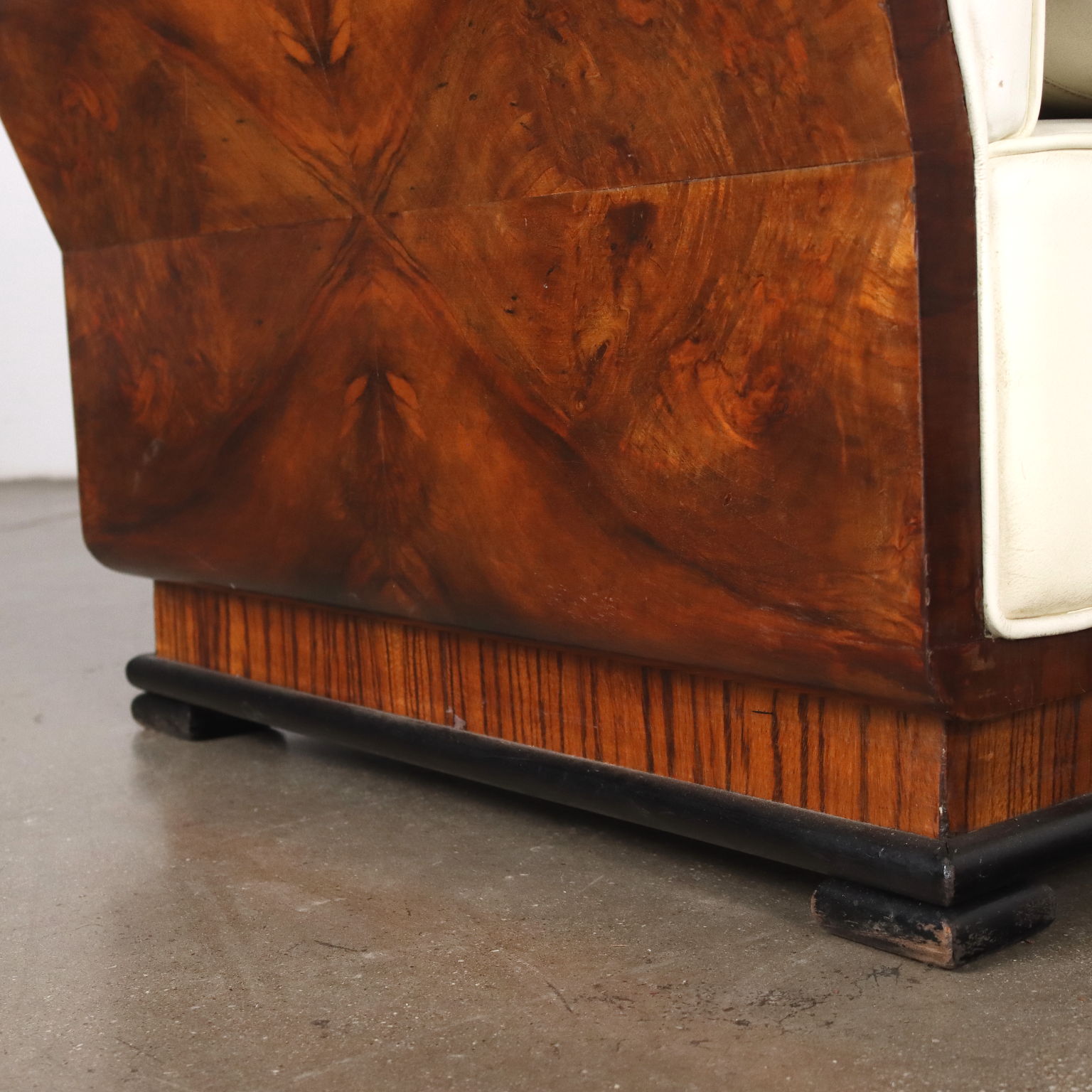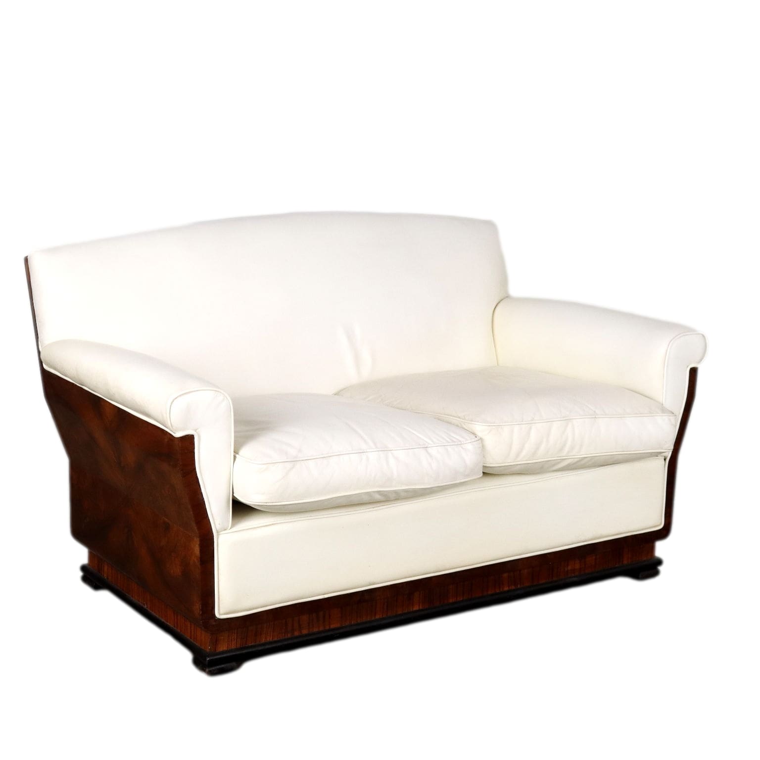Divano con elegante struttura in legno impiallacciato radica, imbottitura in espanso e rivestimento in pelle, non originali del periodo.